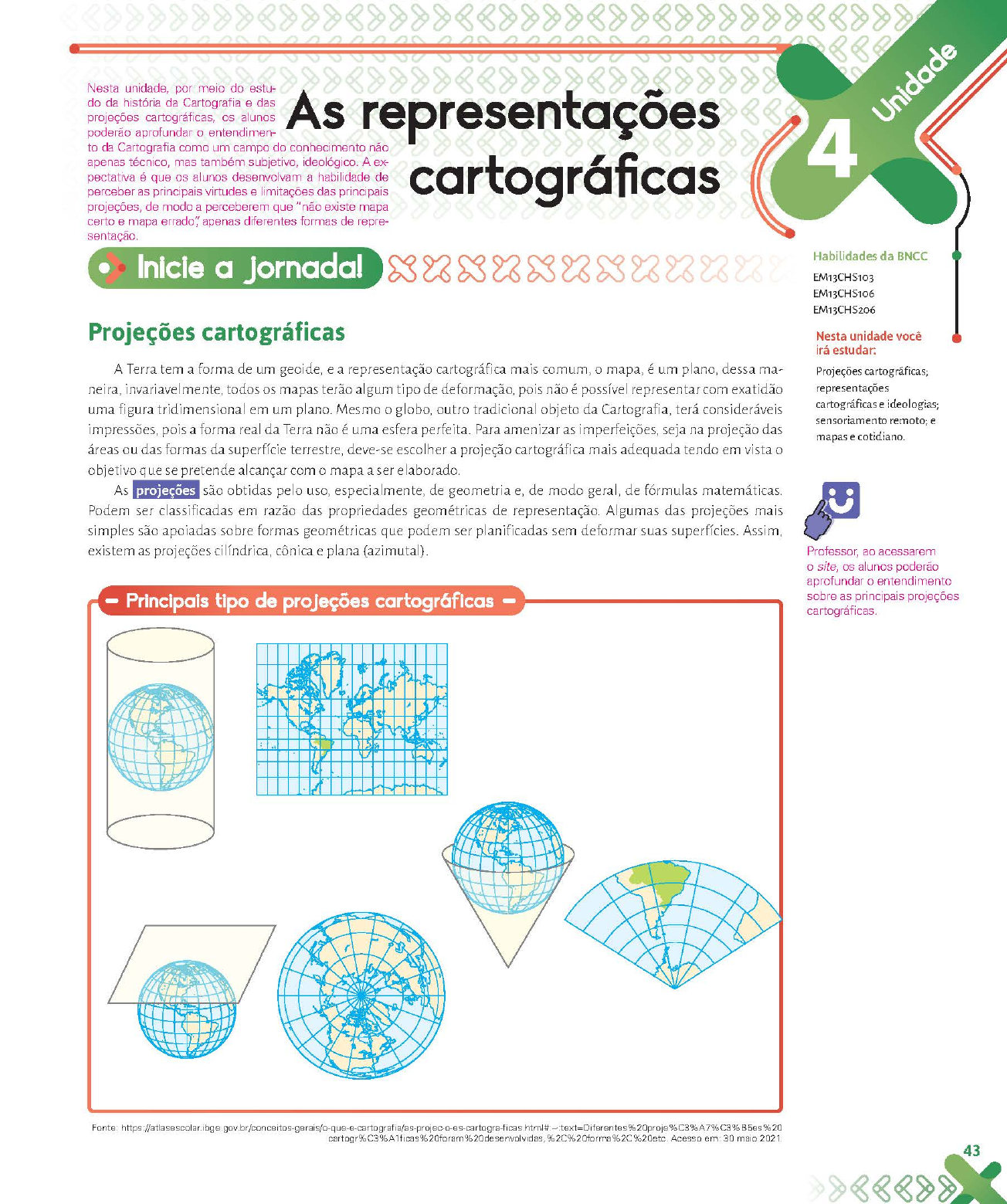 Na projeção cônica, a superfície terrestre é projetada sobre um cone tangente, que depois é longitudinalmente cortado e planificado. Os paralelos (linhas de latitude) são representados por arcos circulares concêntricos, e os meridianos (linhas de longitude), por retas radiais igualmente espaçadas. A distorção é menor em uma faixa estreita ao longo do paralelo, que aumenta ao se distanciar dele. Esse tipo de projeção é geralmente usado para representação de regiões de latitude média (entre +25º e +65º, -25º e -65º de latitude). O resultado é uma menor distorção na forma original da superfície representada. As projeções planas ou azimutais são aquelas sobre um plano tan- gente ao esferoide em um ponto. No tipo normal (ou polar), o ponto de tangência representa o polo norte ou o polo sul e os meridianos de longitude são linhas retas radiais que partem desse ponto, enquanto paralelos de latitude aparecem como círculos concêntricos. A projeção azimutal equidistante pode ser produzida com suporte no padrão bási- co de meridianos radiais e paralelos concêntricos, com modificação no espaçamento dos paralelos para que eles sejam espaçados igualmente ao longo dos meridianos. O resultado é uma projeção que pode repre- sentar a Terra inteira em um único mapa. Todas as distâncias medidas do ponto de tangência estão em escala, e os ângulos sobre o ponto de tangência também são representados corretamente. Outras distâncias e relações angulares estão distorcidas. Uma vez que distâncias e ângulos sobre o ponto central estão corretos, a projeção azimutal equidistante é útil para representar rotas de determinado local para todos os outros locais de interesse. Projeção de Hölzel - Projeção equivalente FERREIRA, Graça Maria Lemos: MARTINELLI, Marcello. Atlas geográ� co espaço mundial. São Paulo: Moderna, 2013. (Adaptado). É utilizada para representar o planisfério. Seu contorno em elipse dá ideia aproximada da forma esférica da Terra com achatamento dos polos. Mapa-múndi FERREIRA, Graça Maria Lemos: MARTINELLI, Marcello. Atlas geográ� co espaço mundial. São Paulo: Moderna, 2013. (Adaptado). É a representação da Terra em dois hemisférios. A projeção utilizada é de Mollweide. Projeção cônica Projeção azimutal Outras projeções cartográfi cas Além das clássicas projeções de Mercator e Peters, existem inúmeras outras formas de representar o espaço mundial, todas elas apresentando grandes virtudes e limitações inevitáveis diante da impossibilidade ma- temática de representar um geoide com perfeição em um plano. A seguir estão algumas daquelas que mais são reproduzidas no mundo. Fonte: https://upload.wikimedia.org/wikipedia/commons/thumb/1/1f/Albers_projection_SW.jpg/420px- Albers_projection_SW.jpg. Acesso em: 31 maio 2021. Fonte: https://upload.wikimedia.org/wikipedia/commons/thumb/e/ec/Azimuthal_equidistant_projection_ SW.jpg/300px-Azimuthal_equidistant_projection_SW.jpg. Acesso em: 31 maio 2021. Faça em sala: 1 a 3 | Faça em casa: 1 a 3 45 Unidade 4 MAXI_EM22_1S_GEO_C1_CA_P3.indd 45 28/06/2021 08:15 Projeção azimutal equidistante polar FERREIRA, Graça Maria Lemos: MARTINELLI, Marcello. Atlas geográ� co espaço mundial. São Paulo: Moderna, 2013. (Adaptado). Projeção “Dymaxion de Fuller” – Projeção poliédrica FERREIRA, Graça Maria Lemos: MARTINELLI, Marcello. Atlas geográ� co espaço mundial. São Paulo: Moderna, 2013. (Adaptado). Projeção azimutal equidistante oblíqua FERREIRA, Graça Maria Lemos: MARTINELLI, Marcello. Atlas geográ� co espaço mundial. São Paulo: Moderna, 2013. (Adaptado). Projeção de Miller centrada na Europa FERREIRA, Graça Maria Lemos: MARTINELLI, Marcello. Atlas geográ� co espaço mundial. São Paulo: Moderna, 2013. (Adaptado). Projeção interrompida de Goode – Projeção equivalente FERREIRA, Graça Maria Lemos: MARTINELLI, Marcello. Atlas geográ� co espaço mundial. São Paulo: Moderna, 2013. (Adaptado). Projeção de Mollweide centrada na Europa FERREIRA, Graça Maria Lemos: MARTINELLI, Marcello. Atlas geográ� co espaço mundial. São Paulo: Moderna, 2013. (Adaptado). Projeção equivalente. Mantém a proporção exata entre terras e águas. Mantém verdadeiros os ângulos azimutais e as distâncias a partir do centro da projeção. Utilizada por radioamadores. Adota um espaçamento dos paralelos que permite mostrar os polos numa linha reta. Não apresenta grandes deformações de área e de ângulos. É construída a partir da projeção de Mollweide, aproveitando ao máximo as zonas de menor deformação. O polo norte é o centro do mapa e, a partir dele, as distâncias estão em escala verdadeira, bem como os ângulos azimutais. Mostra a proximidade das duas superpotências da Guerra Fria. ��ƠżŧŏĪģƣż�ƣĪģǀǭ�ģŏƫƸżƣğƛĪƫ�ŊÿěŏƸǀÿŏƫ᠇�'Ā�ǀŰÿ�ǜŏƫĘż�Űÿŏƫ�ƠƣĪĜŏƫÿ�ģÿƫ� dimensões relativas dos continentes e oceanos. Faça em sala: 4 e 5 | Faça em casa: 4 a 6 46 Geografia MAXI_EM22_1S_GEO_C1_CA_P3.indd 46 28/06/2021 08:15 Ao longo da história, os mapas não apenas ajudaram a promover impressionantes feitos, como as Grandes Navegações, mas também ajudaram a moldar ou a reforçar determinadas percepções de mundo. Mapas confeccionados no período medieval colocavam Jerusalém como o centro do mundo, anjos e santos adornavam o objeto cartográfico e as representações terrestres e oceânicas eram mais vinculadas às narrativas ou interpretações bíblicas do que propriamente a realidade espacial. Porém, é importante notar que a pouca “realidade geográfica” desses mapas, não era apenas fruto de um imaginário moldado dentro da visão de mundo do cristianismo, mas também pelo baixo conhecimento existente quanto às regiões cartografadas. Na maioria das vezes, os “artistas” desses mapas não tinham acesso amplo a outros mapas e o conhecimento e
