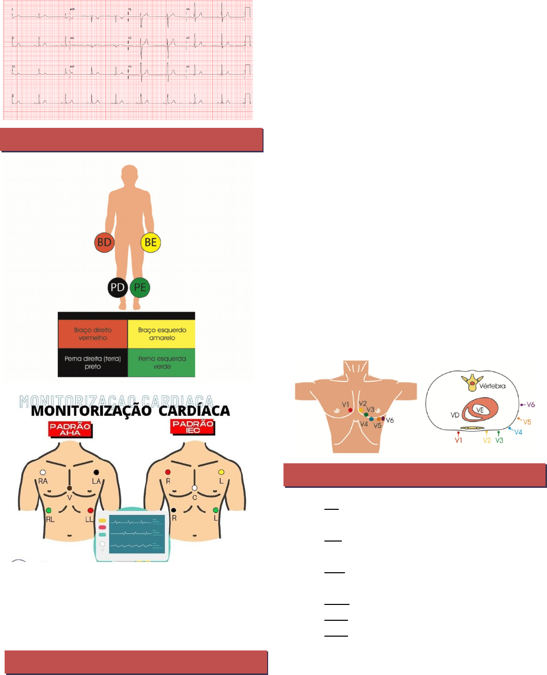 ELETRODOS, DERIVAÇÕES E EIXO · O que representa uma derivação eletrocardiográfica? É a medida da diferença de potencial entre dois eletrodos ou a medida do potencial absoluto de um ponto. ( Eletrodos – plano frontal / deriv. perif ) · Mais comum: padrão IEC · ( Eletrodos – plano horiz . / deriv. precor . )Brasil do lado esquerdo, flamengo do direito. Sol no céu, grama no chão. Fogo no céu, terra no chão · V1 – Borda esternal do 4º EIC direito · V2 – Borda esternal do 4º EIC esquerdo · V3 – Entre V2 e V4 · V4 – 5º EIC esquerdo, linha hemiclavicular · V5 – Mesmo nível de V4, linha axilar anterior · V6 – Mesmo nível de V4 e V5, linha axilar média · Seis derivações ligadas a um eletrodo indiferente (eletrocardiógrafo). · Determinam o plano horizontal. · A partir delas pode-se determinar se o eixo está direcionado para frente (anterior do tórax) ou para trás (posterior do tórax). · PODE-SE FAZER ALTERAÇÃO COMPLEMENTAR: · EXEMPLO: SUSPEITA DE IAM DE VD: V3R e V4R · SUSPEITA DE IAM POSTERIOR (DORSAL): V7 e V8. · V4R: 5º EIC direito, linha hemiclavicular. · V3R: Entre V4R e V1. · V7: Ao mesmo nível de V6, linha axilar posterior. · V8: Ao mesmo nível de V7, linha hemiclavicular posterior. ( Derivações ) · DI: Registra a DDP entre braço direito (polo -) e braço esquerdo (polo +). · DII: Registra a DDP entre o braço direito (-) e perna esquerda (+). · DIII: Registra a DDP entre braço esquerdo (-) e perna esquerda (+). · aVR: Potencial absoluto no MSD. · aVL: Potencial absoluto no MSE. · aVF: Potencial absoluto no MIE. · DI, DII e DIII são consideradas derivações bipolares. · aVR, aVL e aVF são consideradas derivações unipolares. · Essas determinam o plano frontal, avalia o coração de forma vertical. · Fornecem informações e permitem determinar se os vetores estão direcionados para direita, esquerda, cima ou baixo. Não permite saber se desloca para frente ou para trás. · A partir deles é possível determinar eixo de direção das câmaras. ( Vetores ) · Vetor que aproxima da derivação: traçado positivo. · Vetor que afasta da derivação: traçado negativo. · ( Determinando o eixo )Vetor perpendicular: gera onda com duas polaridades iguais (onda isodifásica). · Eixo é o vetor resultante da despolarização dos ventrículos. · A magnitude do vetor corresponde a amplitude vista no ECG. · Avaliando a derivação isodifásica: eixo perpendicular à derivação · Avalie o quadrante (DI e aVF) e faça o eixo perpendicular a derivação isoelétrica. · Quanto mais próximo do sentido do vetor, maior a amplitude · DI + / aVF +: 1º quadrante · DI + / aVF -: 4º quadrante · DI - / aVF +: 2º quadrante · DI - / aVF -: 3º quadrante · 1º: quadrante DI e aVF · 2º: eixo perpendicular a isodifásica (90º) · 3º: não é isodifásica? Veja as derivações que estão do lado de fora e faça ângulos de 90º graus · ( Eixo do complexo QRS )4º: Avaliar derivações entre esses dois ângulos, avaliar sobreposição, e puxar 5 graus pro mais positivo do que está na sobreposição · Normal: entre -30º a +90º · Outras orientações: desvio de eixo ( Eixo da onda P ) · Ritmo sinusal: Eixo entre 0 e 90° · Quando há desvio do eixo da P, significa ritmo atrial ectópico.