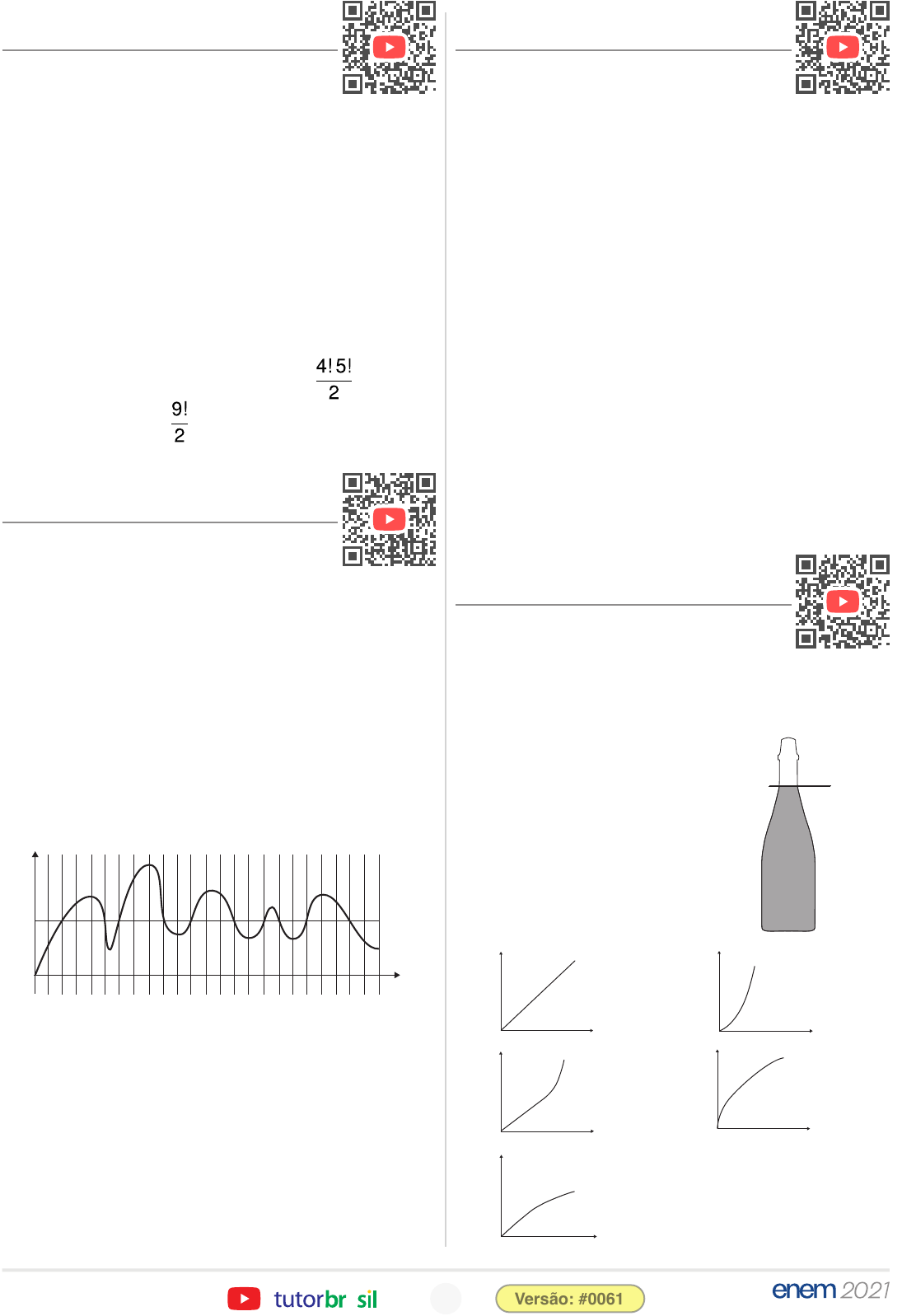 ENEM 2020.1 - REG a/ 13 Versão: #0061 Extensivocurso.profcaju.com.br Questão 163 http://ttb.me/ENEM2020Reg163 Nos livros Harry Potter, um anagrama do nome do personagem “TOM MARVOLO RIDDLE” gerou a frase “I AM LORD VOLDEMORT”. Suponha que Harry quisesse formar todos os anagramas da frase “I AM POTTER”, de tal forma que as vogais e consoantes aparecessem sempre intercaladas, e sem considerar o espaçamento entre as letras. Nessas condições, o número de anagramas formados é dado por A 9! B 4! 5! C 2 × 4! 5! D E Questão 164 http://ttb.me/ENEM2020Reg164 A exposição a barulhos excessivos, como os que percebemos em geral em trânsitos intensos, casas noturnas e espetáculos musicais, podem provocar insônia, estresse, infarto, perda de audição, entre outras enfermidades. De acordo com a Organização Mundial da Saúde, todo e qualquer som que ultrapasse os 55 decibéis (unidade de intensidade do som) já pode ser considerado nocivo para a saúde. O gráfico foi elaborado a partir da medição do ruído produzido, durante um dia, em um canteiro de obras. Decibel Hora 55 0 0 1 2 3 4 5 6 7 8 9 10 11 12 13 14 15 16 17 18 19 20 21 22 23 24 Nesse dia, durante quantas horas o ruído esteve acima de 55 decibéis? A 5 B 8 C 10 D 11 E 13 Questão 165 http://ttb.me/ENEM2020Reg165 O técnico de um time de basquete pretende aumentar a estatura média de sua equipe de 1,93 m para, no mínimo, 1,99 m. Para tanto, dentre os 15 jogadores que fazem parte de sua equipe, irá substituir os quatro mais baixos, de estaturas: 1,78 m, 1,82 m, 1,84 m e 1,86 m. Para isso, o técnico contratou um novo jogador de 2,02 m. Os outros três jogadores que ele ainda precisa contratar devem satisfazer à sua necessidade de aumentar a média das estaturas da equipe. Ele fixará a média das estaturas para os três jogadores que ainda precisa contratar dentro do critério inicialmente estabelecido. Qual deverá ser a média mínima das estaturas, em metro, que ele deverá fixar para o grupo de três novos jogadores que ainda irá contratar? A 1,96 B 1,98 C 2,05 D 2,06 E 2,08 Questão 166 http://ttb.me/ENEM2020Reg166 O consumo de espumantes no Brasil tem aumentado nos últimos anos. Uma das etapas do seu processo de produção consiste no envasamento da bebida em garrafas semelhantes às da imagem. Nesse processo, a vazão do líquido no interior da garrafa é constante e cessa quando atinge o nível de envasamento. Qual esboço de gráfico melhor representa a variação da altura do líquido em função do tempo, na garrafa indicada na imagem? A altura tempo0 B altura tempo0 C altura tempo0 D altura tempo0 E altura 0 tempo Nível de envasamento da garrafa https://www.youtube.com/tutorbrasil http://curso.profcaju.com.br http://ttb.me/ENEM2020Reg163 http://ttb.me/ENEM2020Reg163 http://ttb.me/ENEM2020Reg164 http://ttb.me/ENEM2020Reg164 http://ttb.me/ENEM2020Reg165 http://ttb.me/ENEM2020Reg165 http://ttb.me/ENEM2020Reg166 http://ttb.me/ENEM2020Reg166 ENEM 2020.1 - REG a/ 14 Versão: #0061 Extensivocurso.profcaju.com.br Questão 167 http://ttb.me/ENEM2020Reg167 O quadro representa os gastos mensais, em real, de uma família com internet, mensalidade escolar e mesada do filho. Internet Mensalidade escolar Mesada do filho 120 700 400 No início do ano, a internet e a mensalidade escolar tiveram acréscimos, respectivamente, de 20% e 10%. Necessitando manter o valor da despesa mensal total com os itens citados, a família reduzirá a mesada do filho. Qual será a porcentagem da redução da mesada? A 15,0 B 23,5 C 30,0 D 70,0 E 76,5 Questão 168 http://ttb.me/ENEM2020Reg168 Num recipiente com a forma de paralelepípedo reto-retângulo, colocou-se água até a altura de 8 cm e um objeto, que ficou flutuando na superfície da água. Para retirar o objeto de dentro do recipiente, a altura da coluna de água deve ser de, pelo menos, 15 cm. Para a coluna de água chegar até essa altura, é necessário colocar dentro do recipiente bolinhas de volume igual a 6 cm3 cada, que ficarão totalmente submersas. 17 cm 4 cm 3 cm 8 cm O número mínimo de bolinhas necessárias para que se possa retirar o objeto que flutua na água, seguindo as instruções dadas, é de A 14. B 16. C 18. D 30. E 34. Questão 169 http://ttb.me/ENEM2020Reg169 Um grupo sanguíneo, ou tipo sanguíneo, baseia-se na presença ou ausência de dois antígenos, A e B, na superfície das células vermelhas do sangue. Como dois antígenos estão envolvidos, os quatro tipos sanguíneos distintos são: � Tipo A: apenas o antígeno A está presente; � Tipo B: apenas o antígeno B está presente; � Tipo AB: ambos os antígenos estão presentes; � Tipo O: nenhum dos antígenos está presente. Disponível em: http://saude.hsw.uol.com.br. Acesso em: 15 abr. 2012 (adaptado). Foram coletadas amostras de sangue de 200 pessoas e, após análise laboratorial, foi identificado que em 100 amostras está presente o antígeno A, em 110 amostras há presença do antígeno B e em 20 amostras nenhum dos antígenos está presente. Dessas pessoas que foram submetidas à coleta de sangue, o número das que possuem o tipo sanguíneo A é igual a A 30. B 60. C 70. D 90. E 100. Questão 170 http://ttb.me/ENEM2020Reg170 Antônio, Joaquim e José são sócios de uma empresa cujo capital é dividido, entre os três, em partes proporcionais a: 4, 6 e 6, respectivamente. Com a intenção de igualar a participação dos três sócios no capital da empresa, Antônio pretende adquirir uma fração do capital de cada um dos outros dois sócios. A fração do capital de cada sócio que Antônio deverá adquirir é A B C D E https://www.youtube.com/tutorbrasil http://curso.profcaju.com.br http://ttb.me/ENEM2020Reg167 http://ttb.me/ENEM2020Reg167 http://ttb.me/ENEM2020Reg168 http://ttb.me/ENEM2020Reg168 http://ttb.me/ENEM2020Reg169 http://ttb.me/ENEM2020Reg169 http://ttb.me/ENEM2020Reg170 http://ttb.me/ENEM2020Reg170 ENEM 2020.1 - REG a/ 15 Versão: #0061 Extensivocurso.profcaju.com.br 