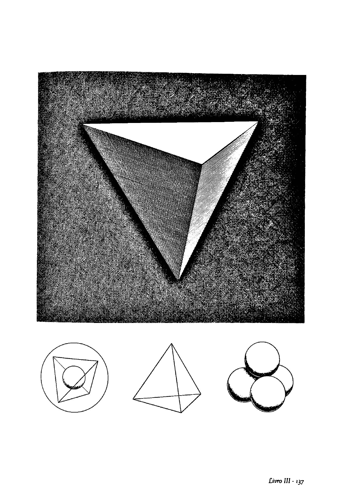 Livro III -137 O OCTAEDRO 8 faces : 12 arestas : 6 vértices O octaedro é composto por oito triângulos equiláteros, com quatro deles en contrando-se em cada vértice. Platão considerava o octaedro um intermediário entre o tetraedro, ou fogo, e o icosaedro, ou água, atribuindo esse sólido, por tanto, ao elemento ar. O octaedro tem seis eixos duplos que passam através de arestas opostas, quatro eixos triplos que passam através de seus centros de face, e três eixos quádruplos que passam através de vértices opostos (abaixo). Os só lidos que reúnem esses eixos de rotação exibem uma simetria octaédrica. Escritos gregos atribuem a descoberta do octaedro e do icosaedro a Teeteto de Atenas (417-369 a.C.). Acredita-se que o Livro XIII dos Elementos de Euclides (ver página 146) é baseado no trabalho de Teeteto sobre os sólidos regulares. O circunraio do octaedro é maior que seu inraio por um coeficente de /3 (ver página 383). A mesma relação ocorre entre o circunraio e o inraio do cubo, e entre o circunraio e o meio raio, ou raio da interesfera, do tetraedro (e também entre o meio raio e o inraio). O tetraedro, o octaedro e o cubo são todos encontrados no reino mineral. Dia mantes minerais e cristais de fluorita comuns frequentemente formam octaedros. Aresta para a frente: eixo duplo Face para a frente: eixo triplo A partir do vértice: eixo quádruplo WQuadrivivm