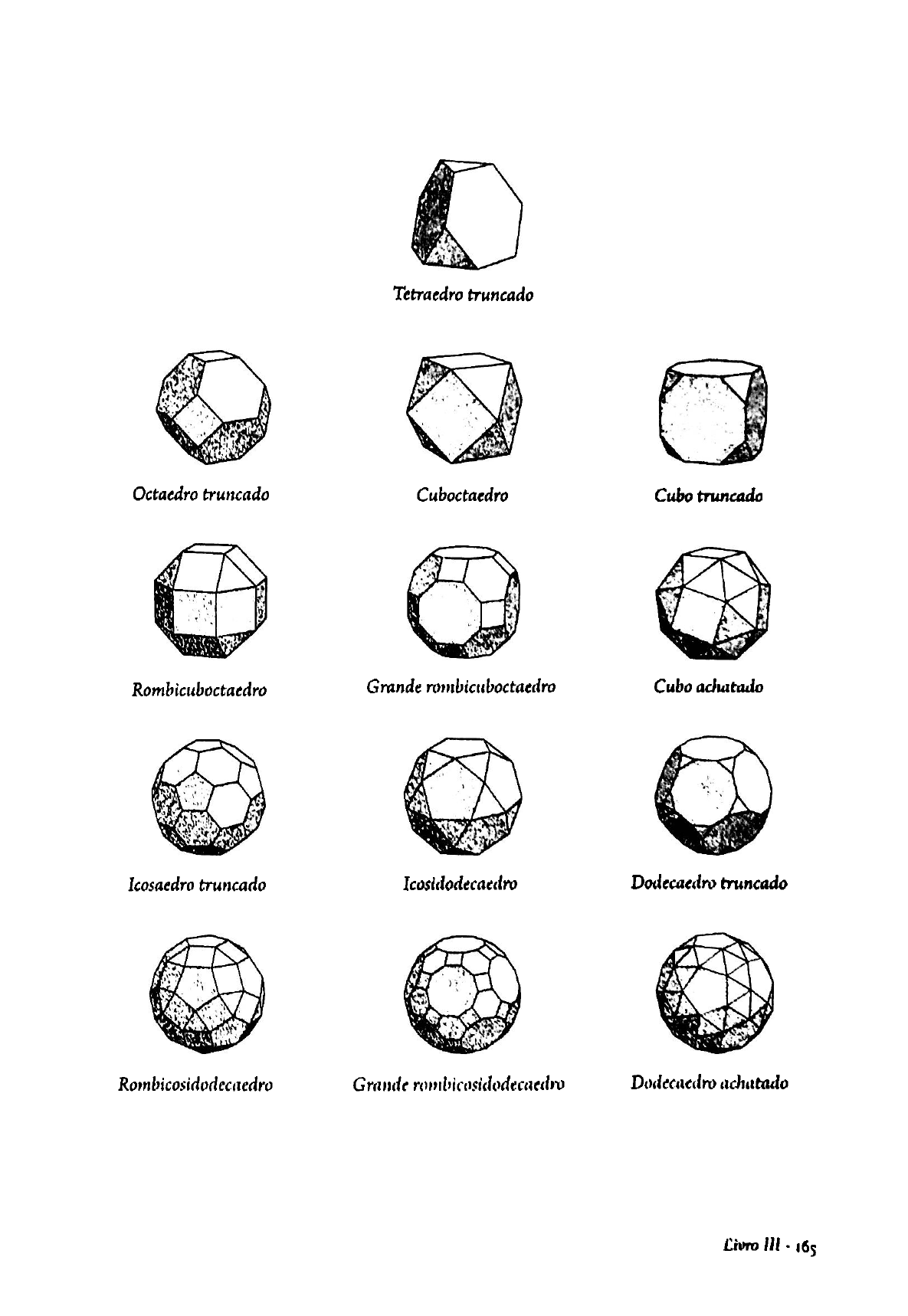 Tetraedro truncado Cuboctaedro Cubo truncadoOctaedro truncado Cubo achatadoRombicuboctaedro Grande rombicuboctaedro IcosidodecaedroIcosaedro truncado Dodecaedro truncado Rombicosidodecaedro Grande rombicosidodecaedro Dodecaedro achatado Livro III • 165 CINCO TRUNCAMENTOS Fora com os cantos! Ao trancarmos os sólidos platônicos, produzimos os cinco poliedros de Arquimedes de arestas iguais apresentados aqui. Esses sólidos truncados são a demonstração perfeita das figuras vértices dos sólidos platônicos: triangular para o tetraedro, o cubo e o dodecaedro, quadrangular para o octaedro, e pen tagonal para o icosaedro. Cada sólido arquimediano tem uma circunsfera e uma interesfera, bem como uma insfera para cada tipo de face — as faces maiores têm as menores insferas tocando os seus centros. Portanto, cada sólido truncado define quatro esferas concêntricas. Cada um dos cinco sólidos trancados pode acomodar-se perfeitamente tanto dentro de seu sólido platônico original quanto do dual desse sólido. Por exem plo, o cubo trancado pode repousar suas faces octogonais dentro de um cubo, ou suas faces triangulares dentro de um octaedro (na imagem abaixo). O octaedro truncado e o único sólido arquimediano que pode preencher o espaço com cópias idênticas de si mesmo, sem deixar lacunas. Ele também esconde um segredo menos óbvio.- a união das extremidades de uma das suas arestas ao seu centro produz um ângulo central, que é igual ao ângulo agudo do ramoso tnangulo pitagórico 3:4:5, adorado pelos antigos construtores egípcios por definir um ângulo reto. • Quatbivium