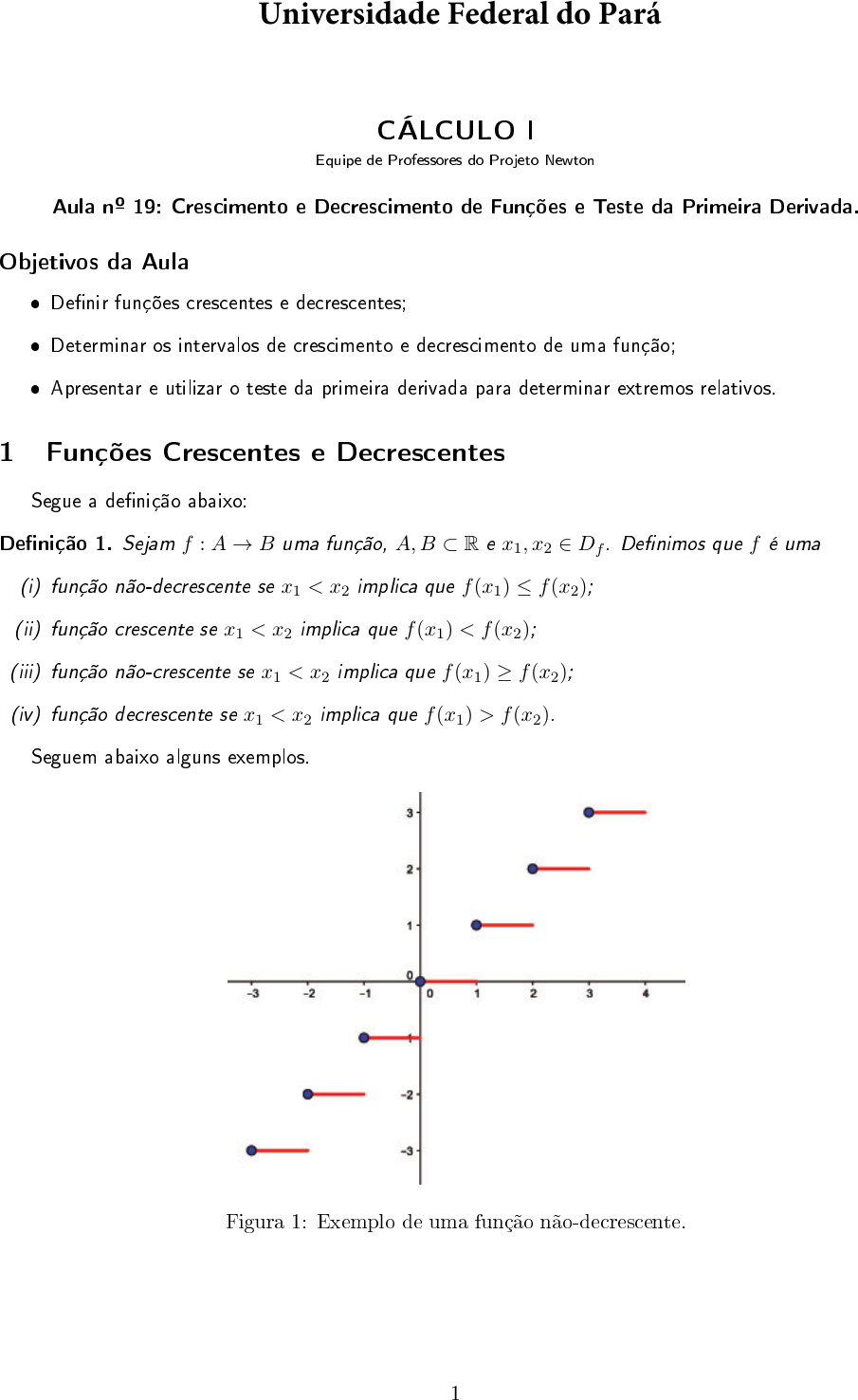CÁLCULO I Equipe de Professores do Projeto Newton Aula nº 19: Crescimento e Decrescimento de Funções e Teste da Primeira Derivada. Objetivos da Aula � De�nir funções crescentes e decrescentes; � Determinar os intervalos de crescimento e decrescimento de uma função; � Apresentar e utilizar o teste da primeira derivada para determinar extremos relativos. 1 Funções Crescentes e Decrescentes Segue a de�nição abaixo: De�nição 1. Sejam f : A→ B uma função, A,B ⊂ R e x1, x2 ∈ Df . De�nimos que f é uma (i) função não-decrescente se x1 < x2 implica que f(x1) ≤ f(x2); (ii) função crescente se x1 < x2 implica que f(x1) < f(x2); (iii) função não-crescente se x1 < x2 implica que f(x1) ≥ f(x2); (iv) função decrescente se x1 < x2 implica que f(x1) > f(x2). Seguem abaixo alguns exemplos. Figura 1: Exemplo de uma função não-decrescente. 1 Universidade Federal do Pará Cálculo I Aula nº 19 Figura 2: Exemplo de uma função crescente. Figura 3: Exemplo de uma função não-crescente. Figura 4: Exemplo de uma função decrescente. Existem funções que não são crescentes e nem decrescentes em todo o seu domínio, ou seja, uma função pode ser crescente em uma parte do seu domínio e decrescente em outra parte. Um exemplo de função Equipe de Professores do Projeto Newton 2 Cálculo I Aula nº 19 com essa propriedade é a função quadrática, dada por f(x) = x2 + 1 2 ; note que para x < 0 a função é decrescente e para x > 0 a função é crescente, como podemos ver no grá�co de f . Figura 5: Grá�co da função f(x) = x2 + 1 2 . 2 Intervalos de Crescimento e Decrescimento Uma das aplicações do Teorema do Valor Médio é demonstrar o teorema que nos permite obter os intervalos de crescimento e de decrescimento de uma função. Tal resultado nos diz que podemos determinar esses intervalos apenas analisando o sinal de sua derivada. Teorema 1. Seja f uma função contínua em um intervalo fechado [a, b] e derivável no aberto (a, b), então: (a) se f ′(x) > 0 para todo x ∈ (a, b), então f é crescente em (a, b). (b) se f ′(x) < 0 para todo x ∈ (a, b), então f é decrescente em (a, b). Exemplo 1. Determine o intervalo de crescimento e/ou de decrescimento da função f(x) = x2 + 1 2 . Solução: Derivando a função, temos f ′(x) = 2x. Como f ′(x) = 2x > 0 para todo x > 0, então f(x) cresce no intervalo (0,+∞). De forma análoga, como f ′(x) = 2x < 0 para todo x < 0, então f(x) decresce no intervalo (−∞, 0). � Exemplo 2. Determine o intervalo de crescimento e/ou de decrescimento da função f(x) = x3. Solução: Derivando a função, temos f ′(x) = 3x2. Como x2 ≥ 0 para todo x, o intervalo de crescimento é R = (−∞,+∞). Desta forma não temos intervalo de decrescimento. � Exemplo 3. Determine o intervalo de crescimento e decrescimento da função f(x) = 3x4−4x3−12x2+5. Solução: Derivando a função, temos: f ′(x) = 12x3 − 12x2 − 24x = 12x(x− 2)(x+ 1). Equipe de Professores do Projeto Newton 3 Cálculo I Aula nº 19 Para fazer o estudo do sinal, utilizamos o seguinte quadro abaixo: Desse modo, f é decrescente em (−∞,−1) ∪ (0, 2) e crescente em (−1, 0) ∪ (2,+∞). Observe gra�camente: Figura 6: Grá�co da função f(x) = 3x4 − 4x3 − 12x2 + 5. � Exemplo 4. Determine o intervalo de crescimento e decrescimento da função f(x) = 2 cosx + cos2 x, x ∈ [0, 2π]. Solução: Note que f ′(x) = −2 sen(x)− 2 cos(x) sen(x). Equipe de Professores do Projeto Newton 4 Cálculo I Aula nº 19 Para estudar o sinal de f ′, podemos determinar os pontos em [0, 2π] tais que f ′(x) > 0 −2 sen(x)− 2 cos(x) sen(x) > 0 sen(x) + cos(x) sen(x) < 0 sen(x)(1 + cos(x)) < 0. Note que 1+ cos(x) ≥ 0 para todo x ∈ [0, 2π], logo, para que f ′(x) < 0, devemos obter os pontos nos quais o seno de x é negativo. Dessa forma, f ′(x) > 0 se π < x < 2π. Analogamente, obtermos que f ′(x) < 0 se 0 < x < π, e assim, temos que f é decrescente em (0, π) e crescente em (π, 2π), como pode ser mostrado no grá�co abaixo: Figura 7: Grá�co da função f(x) = 2 cosx+ cos2 x. � Exemplo 5. Determine o intervalo de crescimento e decrescimento da função f(x) = 4x2 + 1 x . Solução: Note que f ′(x) = 8x− 1 x2 = 8x3 − 1 x2 . Como x2 ≥ 0 para todo x ∈ R, então o sinal de f ′ é determinado pela função que está no numerador. Fatorando, temos que 8x3 − 1 = (2x)3 − 13 = (2x− 1)(4x2 + 2x+ 1). Como o segundo fator é um polinômio irredutível de grau 2 e com concavidade para cima, então podemos concluir que 4x2 + 2x + 1 > 0 para todo x ∈ R. Logo, o sinal de f ′ é determinado pelo fator 2x − 1, que pode ser entendido como uma reta que passa pelos pontos (0,−1) e ( 1 2 , 0 ) . Perceba que f ′ não está de�nida em zero. Logo, o sinal de f ′ e os intervalos de crescimentos são dados pelo quadro a seguir: Equipe de Professores do Projeto Newton 5 Cálculo I Aula nº 19 Sendo assim, a função f decresce no intervalo (−∞, 0) ∪ ( 0, 1 2 ) e cresce no intervalo ( 1 2 ,+∞ ) . Observe gra�camente: Figura 8: Grá�co da função f(x) = 4x2 + 1 x . � 3 Teste da Primeira Derivada Mostramos anteriormente que se f tem um máximo ou mínimo local em x = c, então c deve ser um número crítico de f , mas nem todo número crítico dá origem a um máximo ou mínimo. Consequentemente, necessitamos de um teste que nos diga se f tem ou não um máximo ou mínimo local em um certo ponto crítico. Teorema 2. Suponha que c seja um número crítico de uma função derivável f . 1. Se o sinal de f ′ mudar de positivo para negativo em x = c, então f tem um máximo local em x = c. 2. Se o sinal de f ′ mudar de negativo para positivo em x = c, então f tem um mínimo local em x = c. Equipe de Professores do Projeto Newton 6 Cálculo I Aula nº 19 Exemplo 6. Determine os intervalos de crescimento ou decrescimento da função f(x) = 2x3 + 3x2 − 36x e seus extrem