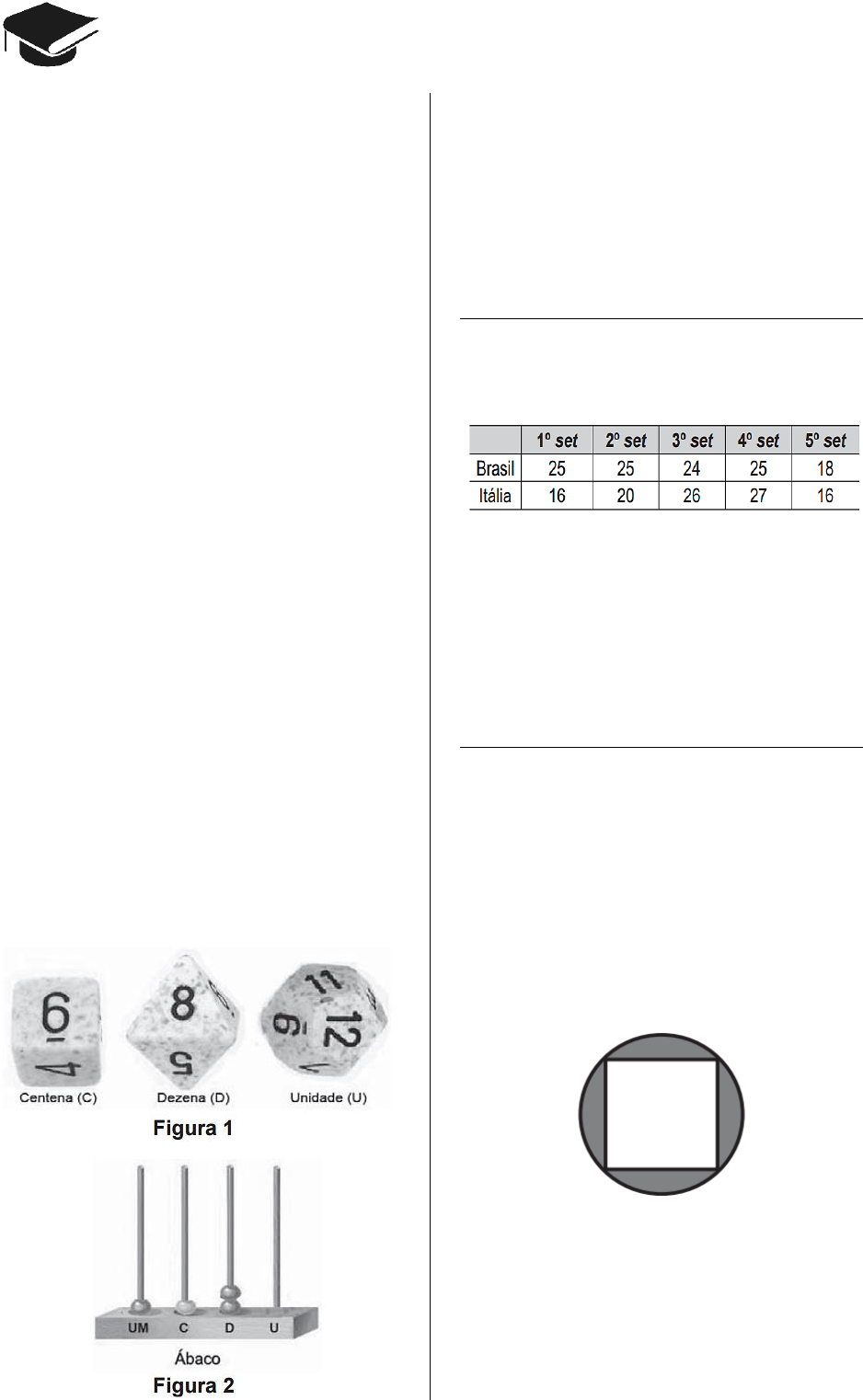 CADERNO MATEMÁTICA ENEM 2009 a 2018 227 novocadernoenem@gmail.com Questão 819 (2016.3) Uma professora de matemática organizou uma atividade associando um ábaco a três dados de diferentes formatos: um cubo com faces nume- radas de 1 a 6, associadas à haste C, um octa- edro com faces numeradas de 1 a 8, associadas à haste D, e um dodecaedro com faces nume- radas de 1 a 12, associadas à haste U. Inicial- mente, as hastes do ábaco encontram-se vazi- as. As letras C, D, e U estão associadas a cen- tenas, dezenas e unidades, respectivamente. A haste UM representa unidades de milhar. Regras do jogo: são jogados os três dados jun- tos e, a cada jogada, colocam-se bolinhas nas hastes, correspondendo às quantidades apre- sentadas nas faces voltadas para cima de cada lado, respeitando a condição "nunca dez", ou seja, em cada haste podem ficar, no máximo, nove bolinhas. Assim, toda vez que a quantida- de de bolinhas em alguma haste dor superior a nove, dez delas são retiradas dessa haste e uma bolinha é colocada na haste imediatamente à esquerda. Bolinhas, em quantidades iguais aos números obtidos na face superior de dados, na segunda jogada, são acrescentadas às has- tes correspondentes, que contêm o resultado da primeira jogada. Iniciada a atividade, um aluno jogou os dados duas vezes. Na primeira vez, as quantidades das faces voltadas para cima foram colocadas nas hastes. Nesta jogada, no cubo, no octaedro e no dodecaedro, as faces voltadas para cima forma, respectivamente, 6, 8 e 11 (figura 1). Na segunda vez, o aluno jogou os dados e adi- cionou as quantidades correspondentes, nas respectivas hastes. O resultado está represen- tado no ábaco da figura 2. De acordo com a descrição, as faces voltadas para cima no cubo, no octaedro e no dodecae- dro, na segunda jogada foram, respectivamente, A) 4, 2 e 9. B) 4, 3 e 9. C) 4, 3 e 10. D) 5, 3 e 10. E) 5, 4 e 9. Questão 820 (2016.3) Uma partida de voleibol entre Brasil e Itália foi decidida em cinco sets. As pontuações do jogo estão descritas na tabela. Nessa partida, a mediana dos pontos obtidos por set pelo time da Itália foi igual a: A) 16. B) 20. C) 21. D) 23. E) 26. Questão 821 (2016.3) Um arquiteto deseja construir um jardim circular de 20 m de diâmetro. Nesse jardim, uma parte do terreno será reservada para pedras orna- mentais. Essa parte terá a forma de um quadra- do inscrito na circunferência, como mostrado na figura. Na parte compreendida entre o contorno da circunferência e a parte externa ao quadra- do, será colocado terra vegetal. Nessa parte do jardim, serão usados 15 kg de terra para cada m 2 . A terra vegetal é comercializada em sacos com exatos 15 kg de cada. Use 3 como valor aproximado para π. O número mínimo de sacos de terra vegetal necessários para cobrir a parte descrita do jar- dim é: A) 100. B) 140. C) 200. D) 800. E) 1000. CADERNO MATEMÁTICA ENEM 2009 a 2018 228 novocadernoenem@gmail.com Questão 822 (2016.3) Tradicionalmente uma pizza média de formato circular tem diâmetro de 30cm e é dividida em 8 fatias iguais (mesma área). Uma família, ao se reunir para o jantar, fará uma pizza de formato circular e pretende dividi-la em 10 fatias também iguais. Entretanto, eles desejam que cada fatia dessa pizza tenha o mesmo tamanho (mesma área) de cada fatia de pizza média quando divi- dida em 8 fatias iguais. Qual o valor mais próximo do raio com que deve ser feita a pizza, em centímetro, para que eles consigam dividi-la de forma pretende? Use 2,2 como aproximação para 5 . A) 15,00 B) 16,50 C) 18,75 D) 33,00 E) 37,50 Questão 823 (2016.3) Em sua vez de jogar, um jogador precisa dar uma tacada na bola branca, de forma a acertar a bola 9 e fazê-la cair em uma das caçapas de uma mesa de bilhar. Como a bola 8 encontra-se entre a bola branca e a bola 9, esse jogador adota a estratégia de dar uma tacada na bola branca em direção a uma das laterais da mesa, de forma que, ao rebater, ela saia em uma traje- tória retilínea, formando um ângulo de 90º com a trajetória da tacada, conforme ilustrado na figura. Com essa estratégia, o jogador conseguiu en- caçapar a bola 9. Considere um sistema carte- siano de eixos sobre o plano da mesa, no qual o ponto de contato da bola com a mesa define sua posição nesse sistema. As coordenadas do ponto que representa a bola 9 são (3 ; 3), o centro da caçapa de destino tem coordenadas (6 ; 0) e a abscissa da bola branca é 0,5, como representados na figura. Se a estratégia deu certo, a ordenada da posi- ção original da bola branca era: A) 1,3. B) 1,5 C) 2,1. D) 2,2. E) 2,5. Questão 824 (2016.3) No projeto de arborização de uma praça está prevista a construção de um canteiro circular. Esse canteiro será construído de uma área cen- tral e de uma faixa circular ao seu redor, con- forme ilustra a figura. Deseja-se que a área central seja igual à área da faixa circular sombreada. A relação entre os raios do canteiro (R) e da área central (r) deverá ser: Questão 825 (2016.3) Em alguns supermercados, é comum a venda de produtos em atacado com preços inferiores aos habituais. Um desses supermercados anunciou a venda de sabonetes em cinco op- ções de pacotes diferentes. Segue a descrição desses pacotes com as respectivas quantidades e preços. Pacote I: 3 unidades por R$ 2,10; Pacote II: 4 unidades por R$ 2,60; Pacote III: 5 unidades por R$ 3,00; Pacote IV: 6 unidades por R$ 3,90; Pacote V: 12 unidades por R$ 9,60. Todos os sabonetes que compõem esses paco- tes são idênticos.