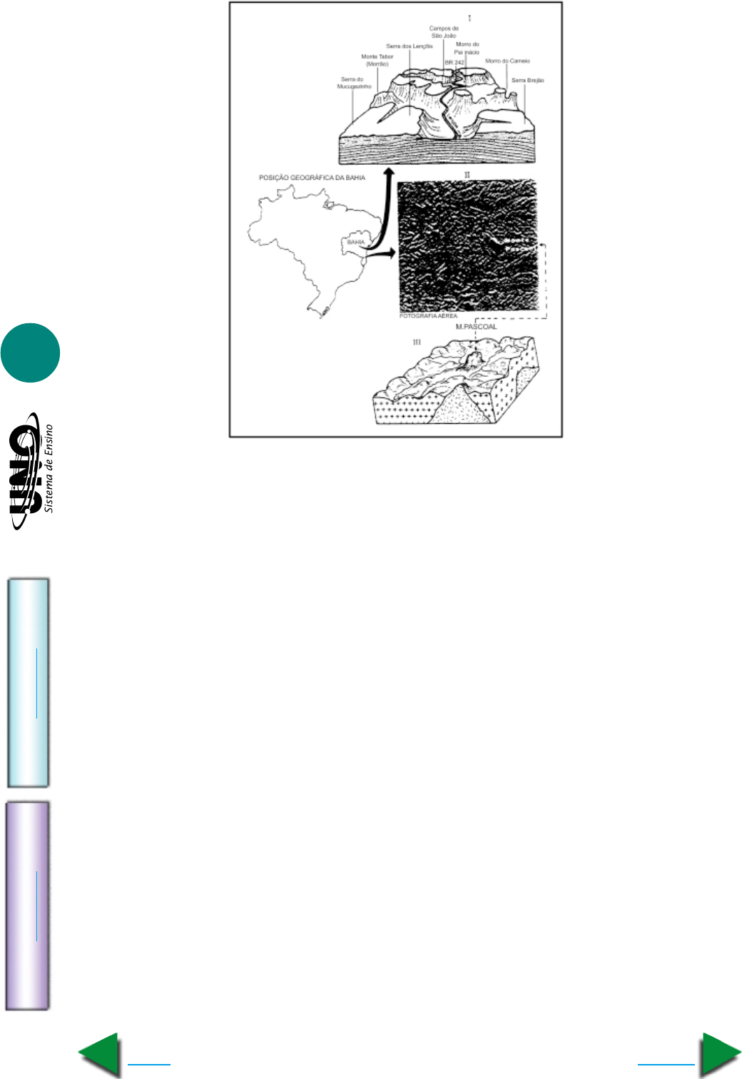 GEOGRAFIA - Estrutura geológica geral e do Brasil IM PR IM IR Voltar GA BA RI TO Avançar 2 2. UFBA As diferentes feições do modelado Com base nas ilustrações acima e nos conhecimentos sobre o relevo brasileiro, pode-se afirmar: 01. Em I, pode-se constatar a existência de relevos residuais e de vales bem encaixados, elaborados pela ação de agentes externos, dentre os quais a rede fluvial. 02. Em I, está representado o relevo da região da Chapada Diamantina, onde a influên- cia dos movimentos tectônicos foi marcante no passado geológico. 04. Em III, as feições arredondadas do relevo evidenciam a influência de um clima extremamente seco. 08. I e III evidenciam o relevante papel dos processos endógenos, responsáveis pela elaboração e pela esculturação do modelado. 16. II e III representam, de diferentes maneiras, uma mesma região do Sul da Bahia, integrante do domínio de “mares e morros”. 32. As fotografias aéreas são utilizadas para o estudo do meio ambiente e já substituem amplamente os mapas e as cartas na análise geográfica. Dê, como resposta, a soma das alternativas corretas. 3. UNIT-MG Em1896, 27.000 pessoas morreram, no Japão, em conseqüência de uma “tsu- nami”, isto é, de uma onda gigante com mais de l0m de altura. Em 1992, outra “tsunami” arrasou parte do litoral pacífico da Nicarágua. Em 1998, o fenômeno se repetiu em Pa- pua-Nova Guiné. Essas três ocorrências têm, em comum, o fato de se haverem dado em regiões do “Círculo de Fogo do Pacífico”, onde a forte atividade sísmica, que leva à formação dessas ondas, está diretamente relacionada à (ao): a) existência das regiões dorsais mesooceânicas; b) convergência de placas tectônicas; c) formação de epicentros no interior da litosfera; d) preenchimento por sedimentos das fossas oceânicas; e) desenvolvimento de processos erosivos do assoalho oceânico. GEOGRAFIA - Estrutura geológica geral e do Brasil IM PR IM IR Voltar GA BA RI TO Avançar 3 4. Univali-SC A crosta terrestre é também chamada de litosfera. Corresponde à camada mais rígida da Terra. No entanto, a rigidez da superfície da Terra é apenas aparente. Forças internas e externas modificam, permanentemente, as estruturas que compõem a litosfera, ou seja, modifi- cam as formas do modelado terrestre, do relevo. Com base no exposto acima, é correto afirmar: a) A nife da Terra é o rígido suporte de apoio à sobrevivência dos homens e dos demais seres vivos. b) A crosta sólida da Terra, constituída por rochas em que predominam os silicatos de cassiterita, cuja densidade é igual a 2,7, e a região central da Terra, cuja densidade pode ser calculada uma vez sabendo-se a densidade média da Terra, são chamadas, respectivamente, de nife e sial. c) No estrato geográfico terrestre nada é estático, tudo é dinâmico. Esse dinamismo é dife- rente em cada um dos planos: o biótico (animais e vegetais) e o abiótico (terra, ar e água). d) O território brasileiro é formado por estruturas geológicas recentes. As bacias do Pan- tanal, Amazônica e trechos do litoral nordeste e sul são do período Terciário e os terrenos cristalinos são do período Quaternário. e) As bacias sedimentares são constituídas em grande parte por rochas magmáticas, pro- venientes da desagregação de outras rochas que recobrem a Terra. 5. UFGO A teoria da tectôni- ca de placas fornece uma interpretação para a gênese e a dinâmica da litosfera, indicando que a crosta ter- restre apresenta-se fragmen- tada em grandes blocos, de dimensão e movimento he- terogêneos. O esquema a seguir (retirado do livro Ge- ografia: Geral e do Brasil: Paisagem e Território, de Demétrio Magnoli e Regi- na Araújo, 1997) demonstra a atividade existente na região das placas tectônicas entre o oceano Pacífico e a África. Coloque certo ou errado ( ) a inexistente de registros fósseis de uma fauna ou flora comum às áreas dos conti- nentes é um dos fatores que mais dificultam a comprovação do movimento das placas. ( ) as perturbações geológicas que atingem a crosta, como os terremotos e o vulcanis- mo, originam-se da pressão exercida pelos movimentos convectivos do manto. ( ) as regiões mais afastadas das zonas de convergência ou afastamento das placas — como é o caso do território brasileiro — apresentam relativa estabilidade tectônica. ( ) as áreas de expansão do assoalho oceânico correlacionam-se, principalmente, com geração das montanhas orogênicas (Andes, Himalaia etc.) nos continentes. 6. UFRN Observe, ao lado, o novo mapa do relevo brasileiro (organizado pelo Prof. Jurandir Ross). Nele estão indica- das as 28 macrounidades do relevo bra- sileiro, denominadas morfoestruturais. Segundo o autor, a forma de relevo 2 cor- responde ao: a) planalto e serras da Borborema; b) planalto e chapada da bacia do Paraná; c) planalto e serras de Goiás-Minas; d) planalto e chapada da bacia do Parnaíba. Fonte: Popp. José Henrique Geologia Geral. Rio de Janeiro, LTC, 1987.