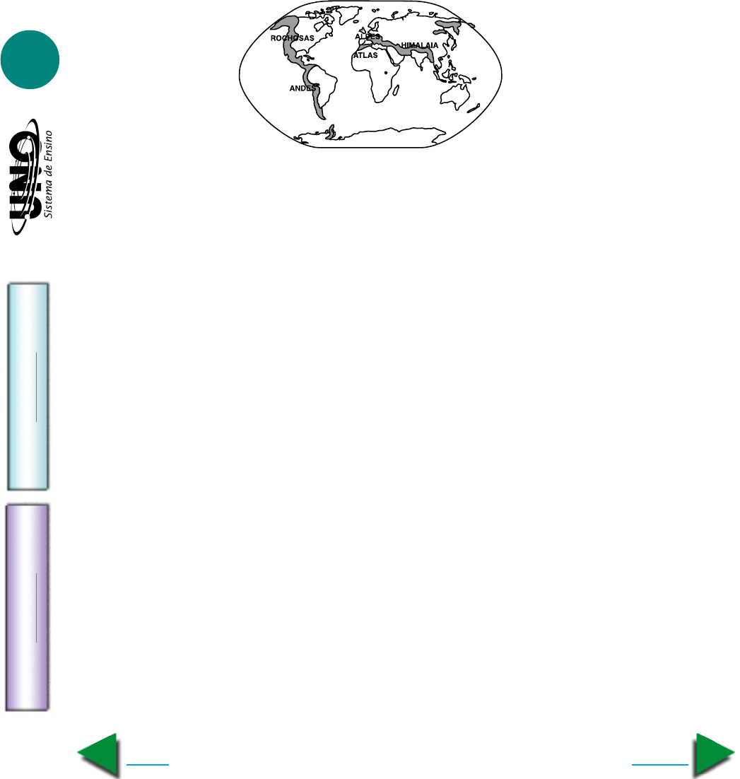 GEOGRAFIA - Estrutura geológica geral e do Brasil IM PR IM IR Voltar GA BA RI TO Avançar 6 14. Acafe-SC A Terra se formou provavelmente a partir de gigantesca massa gasosa pela condensação e decantação progressivas da matéria, produto da ação de forças gravitaci- onais e de diversos processos de transformação energética. I. A idade da Terra, como a dos demais planetas do Sistema Solar, é estimada em 4,6 bilhões de anos. II. A idade da Terra está dividida em eras, períodos, épocas e idades. III. O Homo sapiens surgiu no intervalo de tempo de menor duração chamado Pré-Cam- briano. IV. Os períodos Triássico, Jurássico e Cretáceo constituem a era Cenozóica. Assinale a afirmação ou afirmações corretas. a) Apenas I. b) Apenas I e II. c) Apenas I, II e III. d) Apenas III e IV. e) Apenas IV. 15. PUC-RS As partes sombreadas no mapa abaixo representam: a) zonas sujeitas a grandes enchentes e elevados índices pluviométricos; b) áreas com ocorrência de movimentos separatistas por intolerância étnico-religiosa; c) principais cadeias montanhosas do planeta; d) áreas cujas populações são nômades; e) zonas com índice de desenvolvimento humano (IDH) baixos. 16. UFMS Com a nova divisão do professor Jurandir Luciano Sanches Ross, a partir de 1996 o relevo brasileiro passa a Ter a seguintes divisão: a) 20 unidades, sendo 10 planaltos, 6 planícies e 4 depressões. b) 28 unidades, sendo 11 planaltos, 11 planícies e 6 depressões. c) 20 unidades, sendo 6 planaltos, 6 planícies e 8 depressões. d) 28 unidades, sendo 11 planaltos,10 planícies e 7 depressões e) 28 unidades, sendo 11 planaltos, 6 planícies 11 depressões. 17. U. Católica de Salvador-BA O relevo terrestre é formado por montanhas, planícies, planaltos e depressões. As formas de relevo possuem grande importância geográfica, pois delas dependem, em grande parte, as facilidades que uma região oferece à ocupação humana. Com base na informação e nos conhecimentos sobre os solos e os agentes internos e externos do relevo, pode-se afirmar: a) Os solos que se formam rapidamente, nas regiões secas e frias, não dependem do intemperismo e são oriundos de partículas orgânicas. b) O relevo de uma determinada região é o resultado da ação combinada de forças endó- genas e exógenas e surgiu a partir da solidificação da crosta terrestre. c) Os canais ou as chaminés de saída das lavas vulcânicas estão diretamente relaciona- dos às zonas mais internas do globo. d) As dobras são provocadas por movimentos verticais e ocorrem em regiões constituí- das de rochas cristalinas, devido à sua grande plasticidade. e) As formas do relevo resultam da ação dos agentes erosivos, sem nenhuma atuação dos processos de sedimentação. GEOGRAFIA - Estrutura geológica geral e do Brasil IM PR IM IR Voltar GA BA RI TO Avançar 7 18. Unifenas-MG O relevo brasileiro apresenta, como fundamental característica: a) a tectônica de placas que fez surgir dobramentos modernos, estando sujeito a terremotos; b) a planície Amazônica que abrange quase 50% do território nacional; c) o predomínio de grandes altitudes, com elevações superiores a 1.000 metros; d) a constituição de terrenos com grande atuação dos processos erosivos de baixas altitudes; e) a apresentação de pequena variedade de formas, predominando os complexos de planícies. 19. UFMG Identifique os itens da esquerda com a sua localização à direita, assinalando depois a seqüência correta. Observe que o bloco da direita tem um item a mais. I. Himalaia A. Ásia II. Alpes B. África III. Andes C. América do Norte IV. Apalaches D. Europa V. Sahara E. Oceania F. América do Sul A seqüência correta é: a) I-C, II-D, III-F, IV-A, V-E b) I-F, II-E, III-D, IV-C, V-B c) I-B, II-D, III-C, IV-F, V-A d) I-A, II-D, III-F, IV-C, V-B 20. PUC-RS As grandes elevações e rebaixamentos da superfície da crosta terrestre são devidas aos chamados fatores internos do relevo, pressões exercidas pelo magma na par- te superior do manto. Essa atividade tectônica se revela com maior intensidade e fre- qüência nas regiões onde as placas da crosta se tocam. O magma que vem à superfície pelos interstícios cria as mais extensas formações do relevo conhecidas como: a) falésias b) cordilheiras marginais c) dorsais oceânicas d) diaclasamento e) cadeias da costa 21. PUC-RS As rochas, antes de serem trabalhadas pela erosão, são “preparadas” por um conjunto de reações químicas ou fenômenos físicos, para a ação de desgaste. A essa fase que precede a erosão denominamos: a) abrasão d) evapotranspiração b) intemperismo e) estratificação c) orogênese 22. UFMS Observe os mapas ao lado. Levando em consideração os pro- cessos endógenos e exógenos de formação e modelagem da crosta terrestre e comparando as informa- ções contidas nos mapas acima, é correto afirmar que 01. uma bacia sedimentar pode ser encontrada em áreas de planalto graças aos processos epirogenéticos. 02. as planícies são formadas por terrenos recentes, através do transporte de sedimentos, onde o processo de erosão supera o de sedimentação. 04. os escudos cristalinos podem existir em meio a uma bacia sedimentar. 08. as depressões resultam de processos erosivos ocorridos em áreas de transição entre maciços antigos e bacias sedimentares. 16. as bacias sedimentares se encontram, necessariamente, nas regiões de menor altitude. Dê, como resposta, a soma das afirmativas corretas.