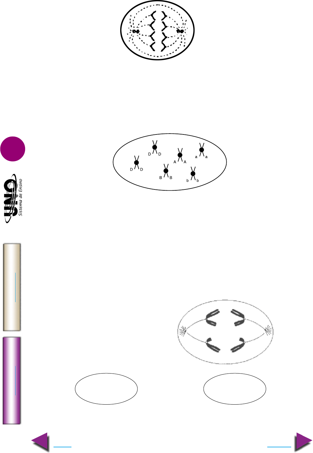 BIOLOGIA - Comunidades e populações IM PR IM IR Voltar GA BA RI TO Avançar 5 14. U. Alfenas-MG O esquema abaixo representa uma célula em Anáfase da mitose. Com base nesse esquema, o cariótipo do organismo do qual proveio tal célula é: a) 4 cromossomos submetacêntricos. d) 8 cromossomos submetacêntricos. b) 8 cromossomos metacêntricos. e) 4 cromossomos metacêntricos. c) 4 cromossomos acrocêntricos. 15. UFPR O desenho abaixo corresponde ao núcleo de uma célula em metáfase de uma espécie cujo número n de cromossomos é 3. Analisando a figura, julgue as afirmativas: ( ) Em relação aos genes em questão, poderão ser formados 8 diferentes tipos de ga- metas. ( ) Em relação aos genes em questão, poderão ser formados 4 diferentes tipos de ga- metas. ( ) Como resultado de uma autofecundação, poderão ser encontrados 9 genótipos di- ferentes. ( ) Como resultado de uma autofecundação, poderão ser encontrados 16 genótipos diferentes. ( ) Como resultado de uma autofecundação, poderão ser encontrados 64 genótipos diferentes. ( ) O sistema em questão é polialélico, sendo, portanto, impossível calcular tanto o número de genótipos quanto o de fenótipos. 16. FUVEST-SP a) A célula de um animal, esquematizada ao lado, encontra-se na anáfase da primeira divisão da meiose. O que permite essa con- clusão? b) Utilize os contornos a seguir para repre- sentar duas células desse animal: uma, em anáfase II da meiose e a outra, em anáfase da mitose. Célula em anáfase II Célula em anáfase da meiose da mitose BIOLOGIA - Comunidades e populações IM PR IM IR Voltar GA BA RI TO Avançar 6 17. UNICAMP-SP Analise a seguinte figura de cro- mossomos: a) Que fenômeno celular está sendo mostrado na figura? b) Em que tipo de divisão celular ocorre esse fe- nômeno? Por quê? c) Qual é a importância desse fenômeno para os seres vivos? 18. F.I. Anápolis-GO “Uma célula em divisão apresenta cromossomos homólogos parea- dos no equador da célula, com quiasmas visíveis. A próxima fase será a I, caracterizada pela II.” Assinale a alternativa que preenche correta e respectivamente os espaços I e II. a) anáfase I; separação de cromossomos homólogos; b) telófase I; divisão do citoplasma; c) metáfase II; duplicação de centrômeros; d) prófase II; desintegração da carioteca; e) prófase I; ocorrência de crossing-over. 19. UERN O processo de divisão celular que garante o crescimento dos diversos tecidos presentes na folha se caracteriza por apresentar: a) uma replicação do material genético seguida de duas divisões; b) um sistema de orientação e sustentação dos cromossomos, o fuso; c) divisão do citoplasma caracterizada como citocinese centrípeta; d) células resultantes com metade do número de cromossomos característicos da espé- cie; e) cromossomos descompactados ao longo de todas as fases do processo. 20. UERJ Células-tronco podem tratar lesões cerebrais Empresa usa unidade estrutural de embriões para recuperar vítimas de derrame. A técnica com- bina o uso de células-tronco de embriões e terapia genética. Adaptado de O Globo, 08/09/2000. Explique a vantagem da utilização, no procedimento descrito, de células-tronco ao invés de células já diferenciadas. 21. Univali-SC “A Academia Chinesa de Medicina Preventiva de Pequim afirma que uma xícara de chá por dia pode prevenir alguns tipos de câncer, principalmente de boca e garganta. Cinqüenta e nove paci- entes com lesões pré-cancerosas na boca tiveram suas lesões regredidas após aplicação local de chá.” IstoÉ, 30 setembro de 1998. O câncer, chamado cientificamente de neoplasia, é decorrente de sucessivas e descontrola- das divisões: a) mitóticas, também responsáveis pelo crescimento dos organismos unicelulares; b) mitóticas, capazes, também, de produzir gametas, geneticametne, diferentes; c) mitóticas, as quais têm, também, como função repor células velhas nos organismos pluricelulares; d) meióticas, as quais produzem a partir de uma célula, quatro células-filhas diferentes entre si; e) mitóticas, também responsáveis pela produção de gametas e esporos.