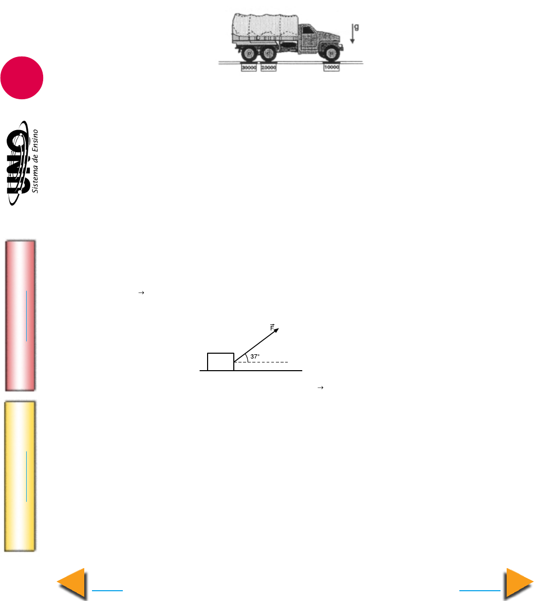 FÍSICA - Leis de Newton IM PR IM IR Voltar GA BA RI TO Avançar 2 4. UFSE Um caixote de massa 50 kg é empurrado horizontalmente sobre um assoalho horizontal, por meio de uma força de intensidade 150 N. Nessas condições, a aceleração do caixote é, em m/s2, Dados: g = 10m/s2 Coeficiente de atrito cinético µ = 0,20 a) 0,50 b) 1,0 c) 1,5 d) 2,0 e) 3,0 5. Fuvest-SP Na pesagem de um caminhão, no posto fiscal de uma estrada, são utilizadas três balanças. Sobre cada balança, são posicionadas todas as rodas de um mesmo eixo. As balanças indicaram 30000 N, 20000 N e 10000 N. A partir desse procedimento, é possível concluir que o peso do caminhão é de: a) 20000 N b) 25000 N c) 30000 N d) 50000 N e) 60000 N 6. U.F.São Carlos-SP Os módulos dos componentes ortogonais do peso P de um corpo valem 120 N e 160 N. Pode-se afirmar que o módulo de P é: a) 140 N b) 200 N c) 280 N d) 40 N e) 340 N 7. UFSE Uma caixa de massa 50 kg é arrastada sobre uma superfície horizontal por uma força F , de intensidade 100 N, formando angulo de 37º com a horizontal. Dados: sen 37º = 0,60 cos: 37º = 0,80 → → Num deslocamento de 2,0 m, o trabalho da força F vale, em joules: a) 80 d) 1,6 . 103 b) 1,6 . 102 e) 8,0 . 103 c) 8,0 . 102 8. FEI-SP Um automóvel de massa 1375 kg encontra-se em uma ladeira que forma 37° em relação à horizontal. Qual é o mínimo coeficiente de atrito para que o automóvel perma- neça parado? Dados: sen (37°) = 0,6 e cos (37°) = 0,8. a) µ = 0,25 d) µ = 1,0 b) µ = 0,50 e) µ = 1,25 c) µ = 0,75 FÍSICA - Leis de Newton IM PR IM IR Voltar GA BA RI TO Avançar 3 9. U.F.São Carlos-SP No site www.agespacial.gov.br, da Agência Espacial Brasileira, apa- rece a seguinte informação: “O Centro de Lançamento de Alcântara (CLA) vem sendo construído desde a década de 80 e está atualmente preparado para lançar foguetes de sondagem e veículos lançadores de satélites de pe- queno porte. Localizado na costa do nordeste brasileiro, próximo ao Equador, a posição geográfica do CLA aumenta as condições de segurança e permite menores custos de lançamento.” Um dos fatores determinantes dessa redução de custos se deve à inércia do movimento de rotação da Terra. Graças a essa inércia, o veículo lançador consome menos energia para fazer com que o satélite adquira a sua velocidade orbital. Isso ocorre porque, nas proximidades do Equador, onde se encontra o CLA: a) a velocidade tangencial da superfície da Terra é maior do que em outras latitudes. b) a velocidade tangencial da superfície da Terra é menor do que em outras latitudes. c) a velocidade tangencial da superfície da Terra é igual à velocidade orbital do satélite. d) a aceleração da gravidade na superfície da Terra é menor do que em outras latitudes. e) a aceleração da gravidade na superfície da Terra é maior do que em outras latitudes. 10. UFSE Dois corpos A e B, de massas m e 2 m respectivamente, estão em repouso sobre uma mesa horizontal, sem atrito. Três forças horizontais são aplicadas simultaneamente no corpo A, que adquire aceleração de módulo a. Se as mesmas três forças forem aplica- das simultaneamente ao corpo B, deve-se esperar que ele adquira aceleração de módulo: a) 4a b) 2a c) a d) e) 11. Fatec-SP Dois objetos A e B de massas 1,0 kg e 5,0 kg, respectivamente, estão unidos por meio de um fio. Esse fio passa por cima de uma roldana, como mostra a figura, e o corpo B está apoiado no chão. ω ω 1 2 a 2 É correto afirmar que a força que o corpo B exerce sobre o solo e a tração nesse fio, em newtons, medem, respectivamente: Dado: g = 10 m/s2 a) 0 e 40 d) 50 e 10 b) 40 e 10 e) 50 e 50 c) 40 e 60 12. FEI-SP No esquema de polias ao lado, sabe-se que a máxima força F que uma pessoa pode fazer é F = 30 N. Qual é a carga máxima que ela conse- guirá erguer? a) 30 N d) 180 N b) 90 N e) 240 N c) 120 N CARGA