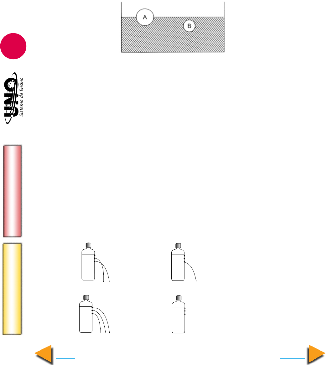 FÍSICA - Hidrostática IM PR IM IR Voltar GA BA RI TO Avançar 4 13. UFR-RJ Um bloco de massa igual a 400 g e volume 500 cm3 foi totalmente mergulha- do na água contida em um recipiente, sendo abandonado em seguida. Considerando g = 10 m/s2, determine o valor do empuxo que o bloco recebe da água, ao ser abandonado. Dado: densidade da água é 1 g/cm3 14. Acafe-SC Para medir a pressão arterial, ao nível do coração, um médico usa um manô- metro no braço de um paciente, na altura do coração, porque pontos situados no mesmo nível de um líquido estão à mesma pressão. Esta é uma aplicação do princípio de: a) Pascal d) Newton b) Stevin e) Joule c) Arquimedes 15. Fatec-SP Duas esferas A e B, de mesma massa, mas de volumes diferentes, quando colocadas num tanque com água, ficam em equilíbrio nas posições indicadas: Com relação a essa situação são feitas as seguintes afirmações: I. Os pesos das duas esferas têm a mesma intensidade. II. As densidades das duas esferas são iguais. III. As duas esferas recebem da água empuxos de mesma intensidade. Dentre essas afirmações está(ão) correta(s) apenas: a) a I. b) a II. c) a III. d) I e II. e) I e III. 16. UFRN O princípio de Pascal diz que qualquer aumento de pressão num fluido se trans- mite integralmente a todo o fluido e às paredes do recipiente que o contém. Uma experi- ência simples pode ser realizada, até mesmo em casa, para verificar esse princípio e a influência da pressão atmosférica sobre fluidos. São feitos três furos, todos do mesmo diâmetro, na vertical, na metade superior de uma garrafa plástica de refrigerante vazia, com um deles a meia distância dos outros dois. A seguir, enche-se a garrafa com água, até um determinado nível acima do furo superior; tampa-se a garrafa, vedando-se total- mente o gargalo, e coloca-se a mesma em pé, sobre uma superfície horizontal. A seguir, estão ilustradas quatro situações para representar como ocorreria o escoamento inicial da água através dos furos, após efetuarem-se todos esses procedimentos. Assinale a opção correspondente ao que ocorrerá na prática. a) c) b) d) FÍSICA - Hidrostática IM PR IM IR Voltar GA BA RI TO Avançar 5 17. UnB-DF Para medir as pressões sistólica e diastólica do coração de um paciente, os médicos seguem um procedimento-padrão. Um aparelho comum para essa medida, co- nhecido como esfigmomanômetro, consiste de uma braçadeira inflável cuja parte interna está conectada a uma pequena bomba manual e a um manômetro. Essa braçadeira é posta de modo a envolver o braço direito do paciente na altura do coração e, com o uso da bomba, é inflada. Bombeando-se ar para o interior da braçadeira, ela exerce uma pressão que bloqueia a circulação sangüínea em uma artéria, no braço. Na altura da parte interna do cotovelo do paciente, é colocado um estetoscópio que permite ouvir a pulsação san- güínea nessa artéria. Um pequeno vazamento é provocado na braçadeira, fazendo que o ar escape lentamente. A leitura do manômetro no instante em que a primeira pulsação é ouvida corresponde à pressão sistólica. Continuando o lento vazamento, uma segunda leitura, correspondente a pressão diastólica, é feita no momento em que as pulsações deixam de ser ouvidas no estetoscópio. Com o auxílio dessas informações, julgue os itens que se seguem. ( ) O ar, enquanto é bombeado para o interior da braçadeira, sofre aumento de sua temperatura. ( ) Para uma pessoa saudável, a pressão diastólica é sempre maior que a pressão sistó- lica. ( ) A pressão que se mede pelo manômetro é a pressão do ar no interior da braçadeira inflada, mas o procedimento permite igualar essa pressão com a pressão sangüínea no interior da artéria. ( ) Quando a pressão do ar no interior da braçadeira é maior que a pressão sangüínea na artéria, as pulsações não são ouvidas no estetoscópio. ( ) A “primeira pulsação” ouvida está relacionada à contração ventricular, e a “segun- da leitura”, à contração atrial. 18. UERJ Um recipiente cilíndrico de 60 cm de altura e base com 20 cm de raio está sobre uma superfície pla- na horizontal e contém água até a altura de 40 cm, conforme indicado na figura. Imergindo-se totalmente um bloco cúbico no recipien- te, o nível da água sobe 25%. Considerando π igual a 3, a medida, em cm, da aresta do cubo colocado na água é igual a: a) 10 2 c) 10 12 b) 10 2 3 d) 10 12 3 19. PUC-PR A caixa-d’água de uma residência tem a forma cúbica com aresta de 1,0 m. Com a caixa totalmente cheia, a pressão de saída da água nas torneiras é p. Para aumentar essa pressão, sugeriu-se substituir a caixa por outra na forma de um paralelepípedo. Qual ou quais das 4 caixas – representadas pelas suas dimensões no quadro a seguir – quando totalmente cheias, causaria, ou causariam, uma pressão maior que p nas torneiras? Caixa 1 Caixa 2 Caixa 3 Caixa 4 Comprimento 3,0 m 2,0 m 0,5 m 2,0 m Largura 1,5 m 1,0 m 0,5 m 0,5 m Altura 0,5 m 1,0 m 2,0 m 1,5 m a) somente a caixa 1; b) as caixas 3 e 4; c) somente a caixa 2; d) as caixas 1 e 2; e) somente a caixa 4;