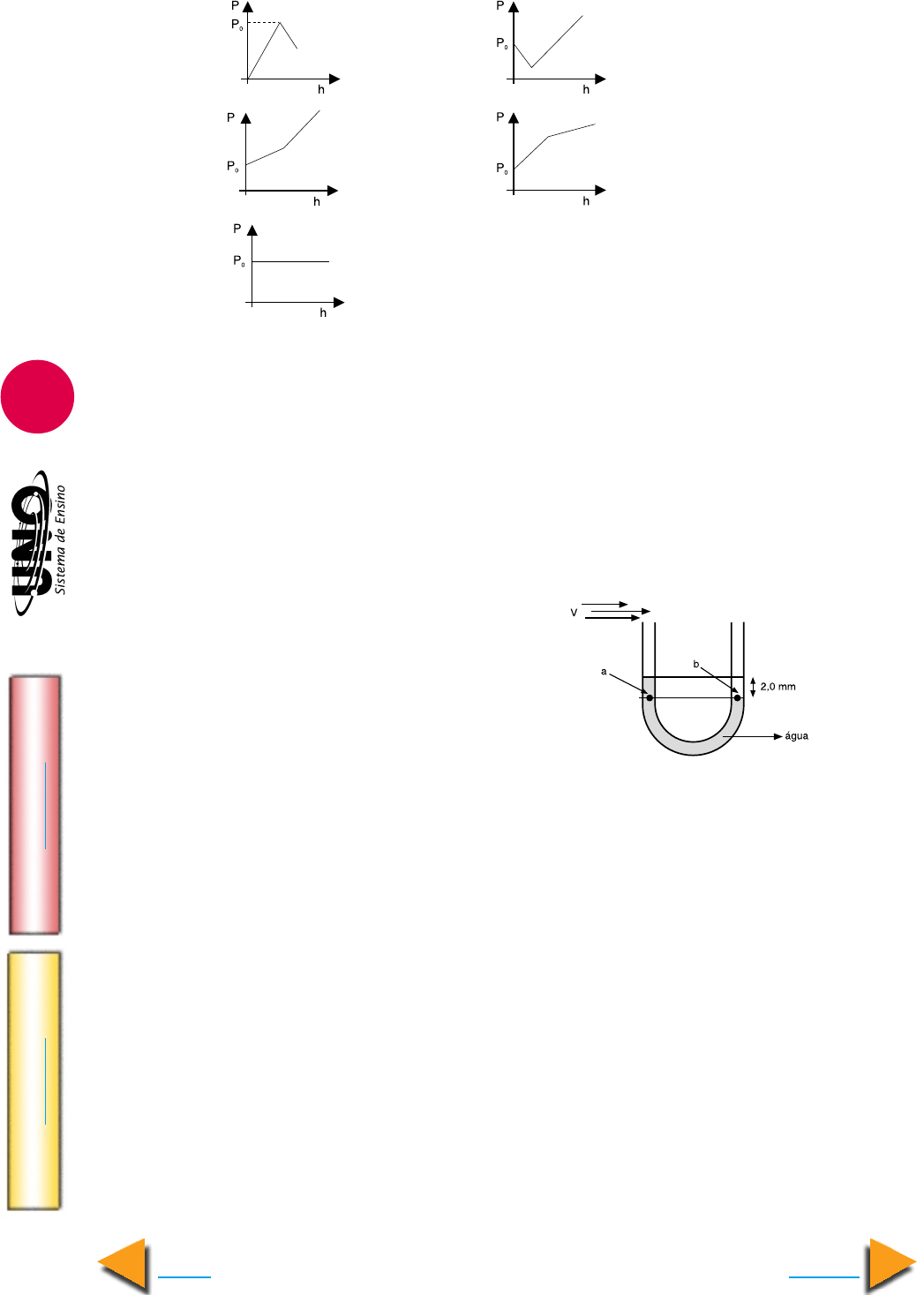 FÍSICA - Hidrostática IM PR IM IR Voltar GA BA RI TO Avançar 6 20. UESC-BA Um copo destampado contém água e óleo em equilíbrio. Sendo P o a pressão atmosférica local e tomando-se como referência a superfície livre do óleo, o gráfico que expressa a variação da pressão, p, com a profundidade, h, é: 01) 04) 02) 05) 03) 21. ITA-SP Um pequeno barco de massa igual a 60 kg tem o formato de uma caixa de base retangular cujo comprimento é 2,0 m e a largura 0,80 m. A profundidade do barco é de 0,23 m. Posto para flutuar em uma lagoa, com um tripulante de 1078 N e um lastro, observa-se o nível da água a 20 cm acima do fundo do barco. O valor que melhor repre- senta a massa do lastro em kg é: a) 260 b) 210 c) 198 d) 150 e) Indeterminado, pois o barco afundaria com o peso deste tripulante. 22. UFMS Uma pessoa sopra ar transversalmente atra- vés de um dos ramos de um tubo em U que contém água. Devido ao sopro, um desnível de 2,0 mm é mantido entre os níveis de água nos ramos do tubo, como mostra a figura abaixo. Desprezando os efei- tos de desnível devidos a tensões superficiais da água, é correto afirmar que: 01. as pressões nos pontos a e b são iguais; 02. as pressões nas superfícies dos líquidos em cada ramo são iguais; 04. a pressão na superfície do ramo da esquerda é menor que a pressão no ponto b. 08. se a velocidade do ar, V, com que a pessoa sopra for aumentada, o desnível dos ramos do tubo em U será maior que 2,0 mm. 16. se o diâmetro do ramo do lado direito do tubo em U for maior do que o diâmetro do ramo do lado esquerdo, o desnível será menor que 2,0 mm. Dê, como resposta, a soma das afirmativas corretas. 23. Cefet-PR Considere as afirmações sobre eventos mecânicos. I. Descontando o atrito caixote/piso é tão fácil arrastar um caixote de 30 kg na Terra quanto na Lua. II. Um cubo maciço de ferro exerce, em sua base de apoio, uma pressão “p”. Dobrando- se suas dimensões, a pressão ficará igual a 2p. III. A pressão exercida por um líquido em repouso no fundo do recipiente que o contém, é independente do tipo de líquido considerado. Está(ão) correta(s) a(s) afirmativa(s): a) somente I; d) somente II e III; b) somente I e II; e) I, II e III. c) somente II; FÍSICA - Hidrostática IM PR IM IR Voltar GA BA RI TO Avançar 7 24. UFR-RJ Dois blocos de gelo (1) e (2), constituídos de água pura, estão em repouso na superfície d’água, sendo a massa do bloco (2) maior que a massa do bloco (1), como mostra a figura abaixo: De acordo com o princípio de Arquimedes, pode-se afirmar que: a) o empuxo sobre o bloco (2) é maior que o empuxo sobre o bloco (1); b) o empuxo sobre o bloco (1) é maior que o empuxo sobre o bloco (2); c) o peso do bloco (1) é igual ao peso do bloco (2); d) o empuxo sobre o bloco (1) é igual ao empuxo sobre o bloco (2); e) nada se pode concluir, já que as massas são desconhecidas. 25. Fuvest-SP Um objeto menos denso que a água está preso por um fio fino, fixado no fundo de um aquário cheio de água, conforme a figura. Sobre esse objeto atuam as forças peso, empuxo e tensão no fio. Imagine que tal aquário seja transportado para a superfície de Marte, onde a aceleração gravitacional é de aproximadamente g/3, sendo g a acelera- ção da gravidade na Terra. Em relação aos valores das forças observadas na Terra, pode- se concluir que, em Marte, a) o empuxo é igual e a tensão é igual. b) o empuxo é igual e a tensão aumenta. c) o empuxo diminui e a tensão é igual. d) o empuxo diminui e a tensão diminui. e) o empuxo diminui e a tensão aumenta. 26. UFRN Um mergulhador que faz manutenção numa plataforma de exploração de petró- leo está a uma profundidade de 15,0 m, quando uma pequena bolha de ar, de volume V i , é liberada e sobe até a superfície, onde a pressão é a pressão atmosférica (1,0 atm). Para efeito desse problema, considere que: a temperatura dentro da bolha permanece constante enquanto esta existir; a pressão aumenta cerca de 1,0 atm a cada 10,0 m de profundidade; o ar da bolha é um gás ideal e obedece à relação: PV T = constante, onde P, V e T são, respectivamente, a pressão, o volume e a temperatura do ar dentro da bolha. Na situação apresentada, o volume da bolha, quando ela estiver prestes a chegar à super- fície, será aproximadamente: a) 4,5 V i b) 3,5 V i c) 1,5 V i d) 2,5 V i g