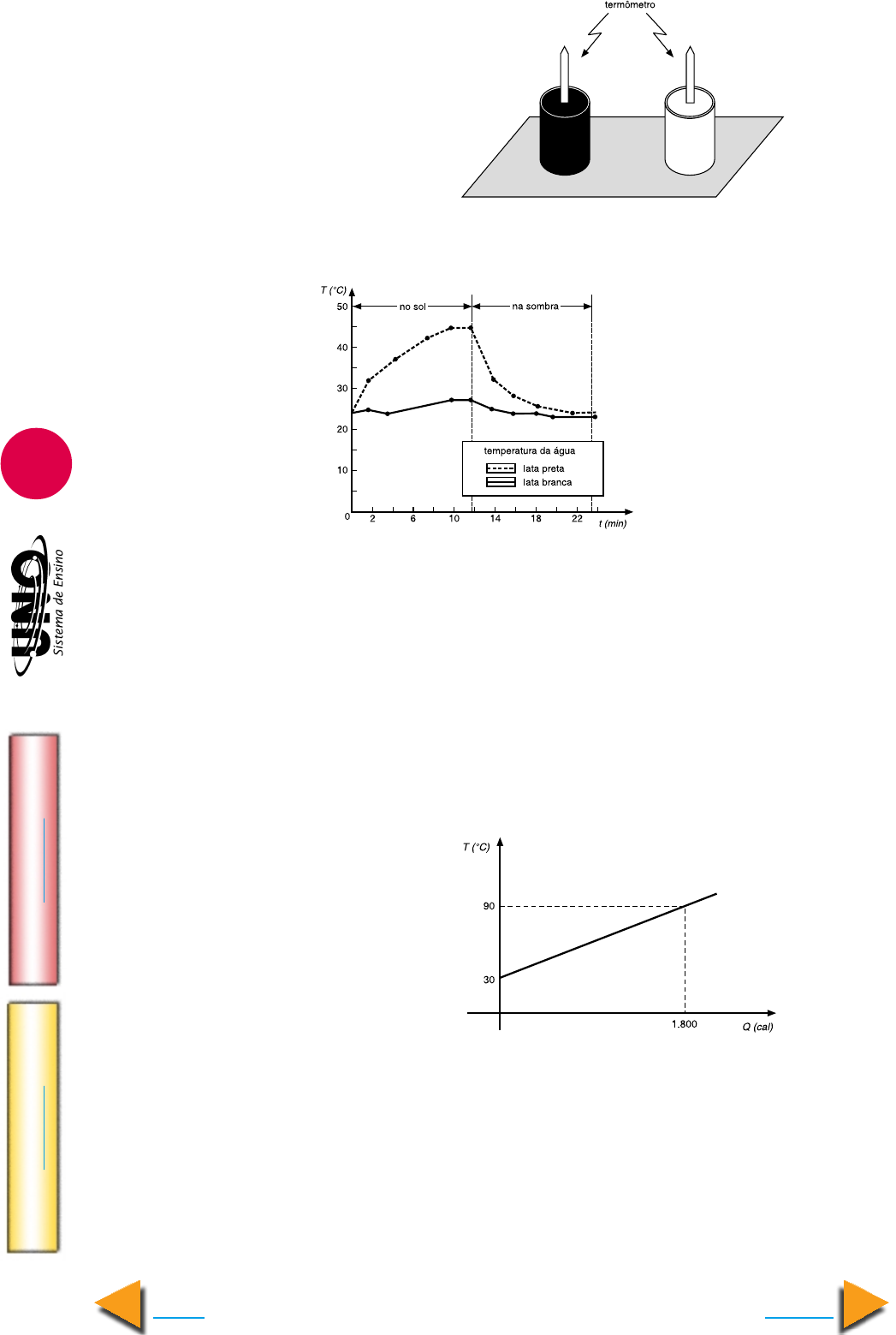 FÍSICA - Termologia, dilatação e transmissão de calor IM PR IM IR Voltar GA BA RI TO Avançar 20 86. UnB-DF No experimento ilustrado na figura ao lado, uma equipe de alunos usou duas latas fechadas, cada uma com 1 kg de água armazenado em seu interior e munida de termômetro que permitia medir a temperatura da água. Uma das latas foi pintada externamente com tinta de cor preta e a outra, de cor branca. Primeiramente, as duas latas foram expostas ao Sol, em um dia sem nebulosidade, e, em seguida, recolhi- das à sombra de uma árvore. As variações da temperatura da água em função do tempo encontram-se registradas no gráfico abaixo. Com o auxilio das informações apresentadas e considerando o calor específico da água igual a 1 kcal/(kg ºC), julgue os itens que se seguem. ( ) Estando sob a sombra de uma árvore, as latas, independentemente de sua cor, ab- sorverão as mesmas quantidades de energia luminosa. ( ) A máxima diferença de temperatura entre a água no interior da lata preta e a água no interior da lata branca foi maior que 20ºC. ( ) O valor da máxima energia térmica absorvida pela água no interior da lata preta durante a experimentação é maior que 19 kcal. ( ) Se uma terceira lata fosse acrescentada à experiência nas mesmas condições, exce- to por ter sido polida externamente até que se tivesse uma superfície prateada espe- lhada, a curva de variação da temperatura da água no seu interior em função do tempo teria seus pontos entre as duas curvas apresentadas no gráfico acima. 87. F.M. Itajubá-MG Calcular o calor específico sensível, em cal/gºC, de 400 g de uma substância cuja relação entre a temperatura (T) em função da quantidade de calor absorvida (Q) está expressa no gráfico ao lado: a) 0,800 b) 0,075 c) 0,190 d) 0,500 e) 1,050 88. UFSE Misturam-se 100 g de água a 20 ºC com 30 g de gelo a – 5,0 ºC. No equilíbrio térmico, ficam 6,0 g de gelo flutuando na água. A quantidade de calor que o gelo recebeu, em calorias, foi, aproximadamente: a) 4,8 . 104 d) 2,0 . 103 b) 2,4 . 104 e) 2,0 . 102 c) 2,4 . 103 Dados: Calor específico da água = 1,0 cal/gºC Calor latente de fusão do gelo = 80 cal/g Calor específico do gelo = 0,50 cal/gºC FÍSICA - Termologia, dilatação e transmissão de calor IM PR IM IR Voltar GA BA RI TO Avançar 21 89. Fuvest-SP O processo de pas- teurização do leite consiste em aquecê-lo a altas temperaturas, por alguns segundos, e resfriá- lo em seguida. Para isso, o leite percorre um sistema, em fluxo constante, passando por três etapas: I. O leite entra no sistema (através de A), a 5°C, sendo aquecido (no trocador de calor B) pelo leite que já foi pasteurizado e está saindo do sistema. II. Em seguida, completa-se o aquecimento do leite, através da resistência R, até que ele atinja 80°C. Com essa temperatura, o leite retorna a B. III. Novamente em B, o leite quente é resfriado pelo leite frio que entra por A, saindo do sistema (através de C), a 20°C. Em condições de funcionamento estáveis, e supondo que o sistema seja bem isolado termicamente, pode-se afirmar que a temperatura indicada pelo termômetro T, que moni- tora a temperatura do leite na saída de B, é aproximadamente de: a) 20°C b) 25°C c) 60°C d) 65°C e) 75°C 90. UFRS A seguir são feitas três afirmações sobre processos termodinâmicos envolvendo transferência de energia de um corpo para outro. I. A radiação é um processo de transferência de energia que não ocorre se os corpos estiverem no vácuo. II. A convecção é um processo de transferência de energia que ocorre em meios fluidos. III. A condução é um processo de transferência de energia que não ocorre se os corpos estiverem à mesma temperatura. Quais estão corretas? a) Apenas I. d) Apenas I e II. b) Apenas II. e) Apenas II e III. c) Apenas III. 91. Cefet-PR Considere as afirmativas abaixo: I. Quando 1 kg de água à 100ºC se transforma em vapor de água sem alteração de temperatura e sob pressão atmosférica normal, o sistema recebe calor e realiza traba- lho. II. Num dia de muito calor, deixa-se funcionar, em uma cozinha fechada, uma geladeira com porta aberta para diminuir a temperatura média da cozinha. III. Durante a fusão e a vaporização de uma substância, a energia interna aumenta. É(são) correta(s) a(s) afirmativa(s): a) I e II somente. b) I e III somente. c) II e III somente. d) I somente. e) I, II e III. 92. UFR-RJ O gráfico abaixo mostra como a temperatura de um corpo varia em função do tempo, quando aquecido por uma fonte de fluxo constante de 90 calorias por minuto. Sendo a massa do corpo igual a 100 g, determine: a) o calor específico do corpo, em cal/gºC; b) a capacidade térmica do corpo, em cal/ºC.