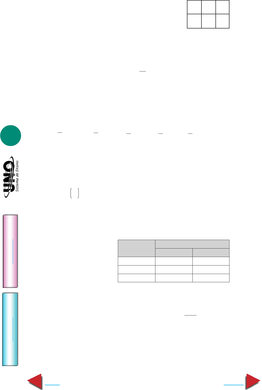 MATEMÁTICA - Binômio de Newton e probabilidade IM PR IM IR Voltar GA BA RI TO Avançar 11 63. UFRS Cada cartela de uma coleção é formada por seis quadrados coloridos, justapostos como indica a figura ao lado. Em cada cartela, dois quadrados foram coloridos de azul, dois de verde e dois de rosa. A coleção apresenta todas as possibilidades de distribuição dessas cores nas cartelas nas condições citadas e não existem cartelas com a mesma distribuição de cores. Retiran- do-se ao acaso uma cartela da coleção, a probabilidade de que somente uma coluna apre- sente os quadrados de mesma cor é de: a) 6% b) 36% c) 40% d) 48% e) 90% 64. UFRS Sendo A um ponto fixo de um círculo de raio r e escolhendo-se ao acaso um ponto B sobre o círculo, a probabilidade da corda AB ter comprimento maior que r está entre: a) 25% e 30% d) 55% e 60% b) 35% e 40% e) 65% e 70% c) 45% e 50% 65. U. Caxias do Sul-RS Suponha que você tenha marcado aleatoriamente (isto é, “no chu- te”) as respostas das questões 63 e 64. A probabilidade de que você acerte, simultanea- mente, essas duas questões é: a) 1 b) 2 c) 2 d) 1 e) 2 66. UFRS Para cada uma das 30 questões de uma prova objetiva são apresentadas 5 alternati- vas de respostas, das quais somente uma é correta. Considere as afirmações relativas à prova: I. Existem no máximo 150 maneiras diferentes de responder à prova. II. Respondendo aleatoriamente, a probabilidade de errar todas as questões é (0,8)30. III. Respondendo aleatoriamente, a probabilidade de exatamente 8 questões estarem corre- tas é (0,2)8(0,8)22. Analisando as afirmações, concluímos que: a) apenas III é verdadeira. d) apenas II e III são verdadeiras. b) apenas I e II são verdadeiras. e) I, II e III são verdadeiras. c) apenas I e III são verdadeiras. 67. UFPR Segundo dados do Con- curso Vestibular da UFPR de 1999, houve 45 412 candidatos inscritos e 3 474 vagas; destas, 38% destinavam-se aos cursos da área Tecnológica, 22% aos da área Biológica e 40% aos da área Humanística. Em cada uma das áreas, a distribuição dos candidatos aprovados, em relação ao sexo, é dada pela tabela: Considerando que só era aceita a inscrição para um curso e que todas as vagas foram preenchidas, é correto afirmar: ( ) A relação entre o número de candidatos e o número de vagas, 45412 , era a probabili- dade de um candidato ser aprovado. ( ) Escolhendo-se ao acaso um candidato aprovado na área Biológica, a probabilidade de que ele seja do sexo feminino é de 55%. ( ) Escolhendo-se ao acaso um candidato aprovado, a probabilidade de que ele não seja da área Tecnológica é de 62%. ( ) Escolhendo-se ao acaso um candidato aprovado, a probabilidade de que ele seja do sexo masculino é de 55,24%. 5 5 10 25 25 30 8 SEXO ÁREA MASCULINO FEMININO Tecnológica 70% 30% Biológica 45% 55% Humanística 44% 56% 3474 MATEMÁTICA - Binômio de Newton e probabilidade IM PR IM IR Voltar GA BA RI TO Avançar 12 68. U. Caxias do Sul-RS Um usuário não lembra exatamente a ordem da senha de sua conta bancária, mas sabe que ela é formada por quatro dígitos: 3, 6, 8 e 9. A probabilidade de o usuário digitar a senha correta na primeira tentativa é: a) 1 b) 1 c) 1 d) 1 e) 1 69. U. E. Londrina-PR A tabela abaixo apresenta, em porcentagem, o nível de formação dos docentes do ensino fundamental, em 1998, no Brasil. 4 24 64 96 256 5 125 80 40 125 (INEP/MEC – Instituto Nacional de Estudos e Pesquisas Educacionais / Ministério da Educação e Cultura) Se for sorteado um desses indivíduos, ao acaso, a probabilidade de ele ser um professor leigo é igual a: a) 1 , se a população utilizada for a da Região Norte. b) 18 , se a população utilizada for a da Região Nordeste. c) 1 , se a população utilizada for a da Região Sudeste. d) 1 , se a população utilizada for a da Região Sul. e) 6 , se a população utilizada for a da Região Centro-Oeste. LEIGOS NÍVEL NÍVEL MÉDIO SUPERIOR Brasil 7 46,8 46,2 Região Norte 19,2 63,5 17,3 Região Nordeste 14,3 61,6 24,1 Região Sudeste 1 35,9 63,1 Região Sul 2,5 36,3 61,2 Região Centro-Oeste 4,6 47,8 47,6