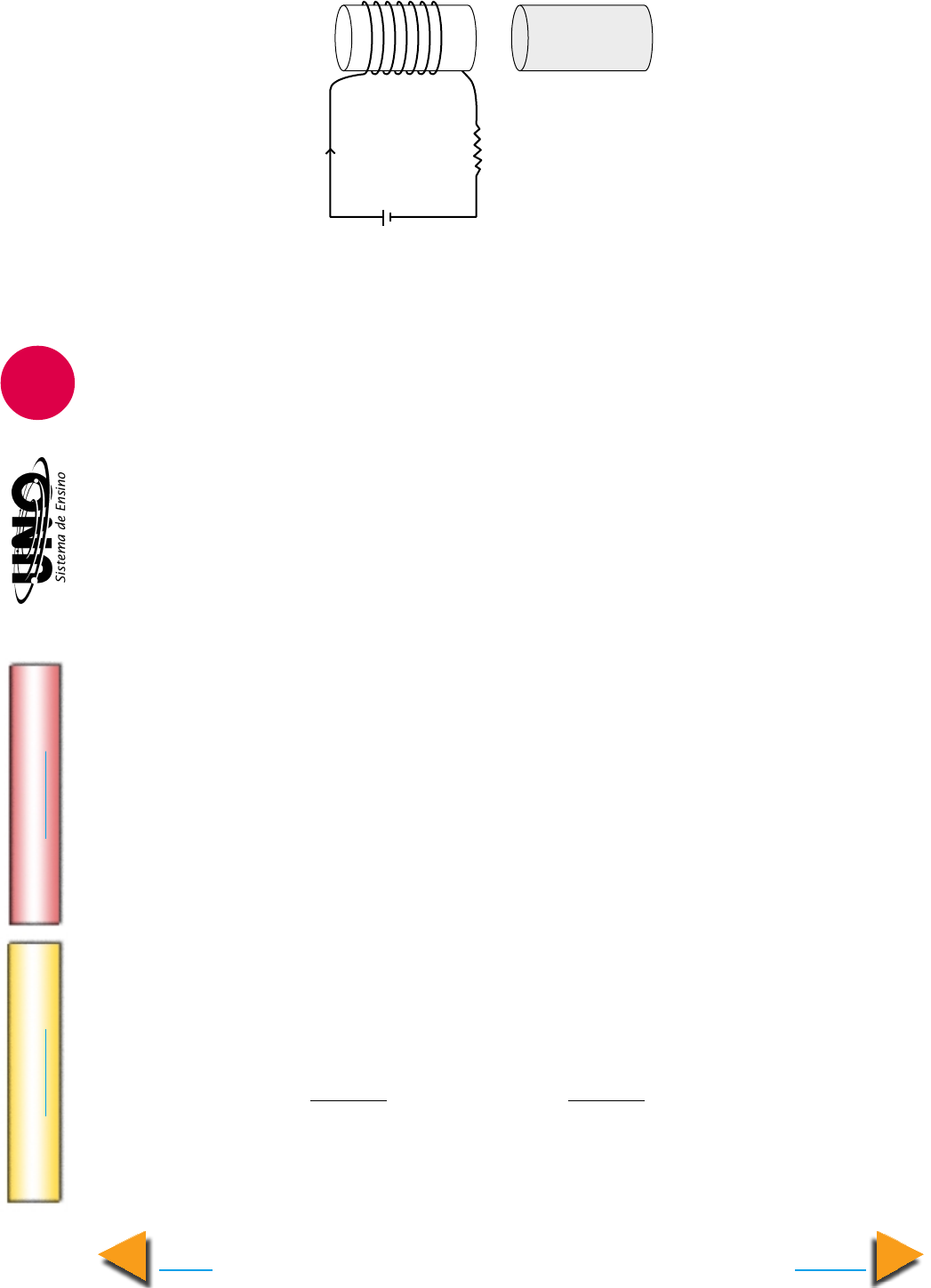 FÍSICA - Eletromagnetismo IM PR IM IR Voltar GA BA RI TO Avançar 7 22. UFMG Na figura, estão reprsentados uma bobina (fio enrolado em torno de um tubo de plástico) ligada em série com um resistor de resistência R e uma bateria. Próximo à bobi- na, está colocado um ímã, com os pólos norte (N) e sul (S) na posição indicada. O ímã e a bobina estão fixos nas posições mostradas na figura. Com base nessas informações, é CORRETO afirmar que a) a bobina não exerce força sobre o ímã. b) a força exercida pela bobina sobre o ímã diminui quando se aumenta a resistência R. c) a força exercida pela bobina sobre o ímã é diferente da força exercida pelo ímã sobre a bobina. d) o ímã é repelido pela bobina. 23. UFPR Sabe-se que em um transformador não há, necessariamente, ligação elétrica entre o condutor do enrolamento primário e o do secundário. Entretanto, a energia elétrica é trans- mitida do primário para o secundário. A partir destes fatos e dos conhecimentos sobre eletromagnetismo, é correto afirmar: ( ) A corrente elétrica do enrolamento secundário não influi no funcionamento do primário. ( ) O transformador só funciona com corrente elétrica variável. ( ) É a variação do fluxo do campo magnético nos enrolamentos que permite a transmissão da energia elétrica. ( ) A diferença do potencial nos terminais do enrolamento secundário é sempre menor que a diferença de potencial nos terminais do primário. ( ) A corrente elétrica é sempre a mesma nos enrolamentos primário e secundário. 24. U. E. Ponta Grossa-PR Sobre um transformador ideal em que o número de espiras do enrola- mento secundário é menor que o do enrolamento primário, assinale o que for correto: 01) A potência elétrica na entrada do enrolamento primário desse transformador é igual à potência elétrica na saída do enrolamento secundário. 02) Se ligarmos os terminais do enrolamento primário a uma bateria de 12 V, teremos uma ddp menor no enrolamento secundário. 04) A energia no enrolamento primário é igual à energia no enrolamento secundário, ca- racterizando o princípio da conservação de energia. 08) As correntes nos enrolamentos primário e secundário desse transformador são iguais. 16) A transferência de potência do enrolamento primário para o enrolamento secundário não ocorre por indução. Dê como resposta a soma das alternativas corretas. 25. UFRS Assinale a alternativa que preenche corretamente as lacunas do parágrafo abaixo. Quando um ímã é aproximado de uma espira condutora mantida em repouso, de modo a induzir nessa espira uma corrente contínua, o agente que movimenta o ímã sofre o efeito de uma força que ao avanço do ímã, sendo a realização de trabalho para efetuar o deslocamento do ímã. a) se opõe – necessária d) é favorável – desnecessária b) se opõe – desnecessária e) é indiferente – desnecessária c) é favorável – necessária bateria Ri ímã N S FÍSICA - Eletromagnetismo IM PR IM IR Voltar GA BA RI TO Avançar 8 Considere as seguintes situações: I. A espira se mantém em repouso e a intensidade do campo magnético varia no tempo. II. A espira se mantém em repouso e a intensidade do campo magnético permanece cons- tante no tempo. III. A espira passa a girar em torno do eixo OO’ e a intensidade do campo magnético permanece constante no tempo. Em quais dessas situações ocorre indução de corrente elétrica na espira? a) Apenas em I. b) Apenas em II. c) Apenas em III. d) Apenas em I e III. e) Em I, II e III. 28. U. E. Maringá-PR Uma carga Q = -3C desloca-se com velocidade v = 4 m/s, na direção do eixo x, formando um ângulo de 30º com o campo magnético B de intensidade 15 T. Os vetores v e B estão no plano XY. Qual o módulo, em Newtons, da força magnética que atua na carga? Dados: Sen 30º = Cos 30º = 26. U. Potiguar-RN Pode-se obter o aspecto das linhas de indução de uma região de campo magnético salpicando limalha de ferro sobre uma folha de papel colocada horizontalmen- te. As partículas de ferro, na região do campo magnético, imantam-se e comportam-se como pequenos ímãs, alinhando-se com o vetor indução magnética. Analise as afirma- ções abaixo e as figuras ao lado. Figura I: Representa a distribuição da lima- lha de ferro na folha de papel, colocada sobre um ímã em forma de barra. Figura II: Representa a distribuição da limalha de ferro na folha de papel, colocada sobre um ímã em forma de ferradura. Figura III: Um fio, percorrido por corrente contínua, atravessa um pedaço de papel e a limalha de ferro se arruma conforme a figura. Figura IV: Fazendo as espiras de um solenóide, percorrido por corrente contínua, atraves- sarem o papel, vê-se que a limalha de ferro forma linhas paralelas e eqüidistantes dentro do solenóide. Pode-se afirmar que são corretas apenas: a) I e II b) III e IV c) I, II e III d) I, II e IV 27. UFRS A figura abaixo representa uma espira condutora quadrada, inicialmente em repouso no plano da página. Na mesma região, existe um campo magnético uniforme, de intensidade B, perpendicular ao plano da página. Fig. I Fig. II Fig. III Fig. IV O O’ B 2 1 2 3