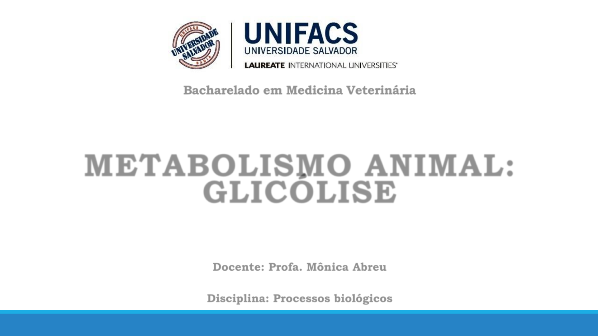 Bacharelado em Medicina Veterinária METABOLISMO ANIMAL: GLICÓLISE Docente: Profa. Mônica Abreu Disciplina: Processos biológicos Objetivos da aula Objetivos de aprendizagem: Identificar os diferentes carboidratos da reação; Esquematizar o processo de oxidação da glicose nas células animais; Atividade Pontuada 1 – Leitura de artigo + Mapa conceitual. Glicose; Relembrando: O que é? o Carboidrato simples (monossacarídeo) utilizado como fonte de energia pelos seres vivos, sendo um dos principais nutrientes da célula. o É constituída por seis carbonos, sendo, portanto, um tipo de hexose = C6H12O6. o Esse monossacarídeo também participa da formação de carboidratos complexos, como o amido, glicogênio e celulose. Glicose; o A glicose é obtida por meio da alimentação, e sua quantidade em nosso sangue (glicemia) é regulada pela ação de dois hormônios que agem de maneira contrária: o A insulina (baixa o nível de açúcar) e o glucagon (aumenta o nível de açúcar). o Tanto níveis elevados quanto níveis baixos de glicose podem ser prejudiciais ao organismo. Glicose; o Seu transporte é feito por difusão facilitada: Proteínas (GLUT4); Psiu: As GLUTs garantem o transporte de uma área com maior concentração de C6H12O6 para outra com menor concentração. Em algumas células o transporte pode ocorrer acoplado ao íon sódio, ex: Epitélio intestinal (Delgado). Psiu II: A velocidade do transporte de glicose aumenta consideravelmente devido à ação da insulina, entretanto, no caso do transporte juntamente aos íons sódio, o transporte ocorre de maneira independente da ação da insulina. . Glicose; Função o Obtenção de energia – Respiração celular: o Célula obtém energia a partir de uma série de processos de degradação da glicose. o Etapas da Respiração celular: 1)Glicólise; 2)Ciclo do ácido cítrico; 3)Fosforilação oxidativa; Psiu: Além da respiração celular, não podemos esquecer-nos da fermentação, que é um processo anaeróbico, que ocorre sem a presença de oxigênio. Glicólise ou via de Ebden-Meyerhof; O que é? o Processo que pode ocorrer na presença ou não de oxigênio; o É uma via metabólica que ocorre no citoplasma de todos os seres vivos; o O produto principal dessa via é a formação de duas moléculas de ácido pirúvico (C3H4O3) e de moléculas de ATP. o Processo que envolve 10 reações distintas = Liberação de energia; Intermediários metabólicos. o As reações ocorrem a partir da catalise de enzimas especificas. Glicólise ou via de Ebden-Meyerhof; Psiu: A glicólise é um processo anaeróbico (fungos e bactérias) onde se observa a formação de um produto final estável (lactato), no citoplasma celular. Psiu II: Em condições de aerobiose, o metabolismo da glicose prossegue com as demais vias produtoras de energia (ciclo de Krebs e cadeia respiratória), mas somente se a célula possuir mitocôndrias funcionais, uma vez que esses processos são todos intramitocondriais. Glicólise; Processo Glicólise; Processo Glicólise anaeróbica: é a degradação da glicose sem a necessidade de O2, tendo como produto final o acido lático, esta via é muito mais rápida que a glicólise aeróbica sendo utilizada quando exercícios rigorosos são realizados. Forma Ionizada Glicólise; Processo Glicólise aeróbica: é a degradação da glicose na presença de O2, tendo como produto final o piruvato que por sua vez é transportado para dentro da mitocôndria para completar sua oxidação ate CO2 e H2, ativando o ciclo de krebs e a cadeia respiratória. Fermentação LáticaGlicólise aeróbica Glicólise; Aeróbica Completa Passo 1: A molécula instável de glicose, quando se quebra, forma duas moléculas de ácido pirúvico e gera quatro moléculas de ATP. Como no início do processo são utilizados fosfatos provenientes de duas moléculas de ATP, o saldo líquido é de duas moléculas. Glicólise; Aeróbica Completa Passo 2: A partir da Oxidação de NADH, temos liberação de Co2 e formação de Acetil_CoA Glicólise; Aeróbica Completa Passo 3: Acetil_CoA entra em CK, liberando 6 NADH e 2 FADH Glicólise; Aeróbica Completa Passo 4: Pela via de fosforilação oxidativa, forma- se 34 ATP’s Glicólise; Processo De uma maneira resumida, podemos escrever a glicólise de acordo com a seguinte equação química: C6H12O6 + 2ADP + 2Pi+ 2NAD + → 2C3H403 + 2ATP + 2NADH + 2H + No processo de glicólise, ocorre a liberação de quatro elétrons e quatro íons H+. Das quatro moléculas H+, duas ficam livres no citoplasma, enquanto as outras duas, juntamente aos quatro elétrons, são capturadas pelo dinucleotídio de nicotinamida-adenina (NAD+) e formam o NADH. O NAD+ é considerado um aceptor de elétrons. Glicólise; Oxidação Redução Glicólise; Processo O ácido pirúvico formado no processo de glicólise, com a presença de oxigênio, é usado na mitocôndria no processo de respiração celular. Quando, no entanto, não há oxigênio suficiente, o piruvato é transformado em ácido lático ou etanol (fermentação). Glicólise; Processo A glicólise ocorre no citoplasma da célula e pode ser dividida em duas fases: a fase de investimento e a fase de compensação. o Fase de investimento: a célula gasta ATP. o Fase de compensação: a célula produz ATP. Onde podemos vê de forma clara essa situação? O processo é independente um do outro? Glicólise; Processo Glicólise; Artigo