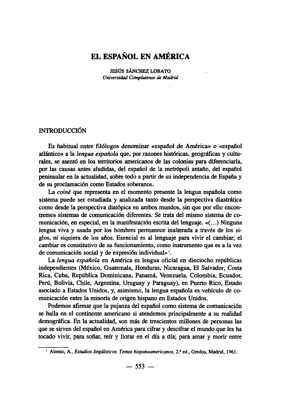 EL ESPAÑOL EN AMÉRICA JESÚS SÁNCHEZ LOBATO Universidad Complutense de Madrid INTRODUCCIÓN Es habitual entre filólogos denominar «español de América» o «español atlántico» a la lengua española que, por razones históricas, geográficas y cultu- rales, se asentó en los territorios americanos de las colonias para diferenciarla, por las causas antes aludidas, del español de la metrópoli antaño, del español peninsular en la actualidad, sobre todo a partir de su independencia de España y de su proclamación como Estados soberanos. La coiné que representa en el momento presente la lengua española como sistema puede ser estudiada y analizada tanto desde la perspectiva diastrática como desde la perspectiva diatópica en ambos mundos, sin que por ello encon- tremos sistemas de comunicación diferentes. Se trata del mismo sistema de co- municación, en especial, en la manifestación escrita del lenguaje. «(...) Ninguna lengua viva y usada por los hombres permanece inalterada a través de los si- glos, ni siquiera de los años. Esencial es al lenguaje para vivir el cambiar; el cambiar es constitutivo de su funcionamiento, como instrumento que es a la vez de comunicación social y de expresión individual»'. La lengua española en América es lengua oficial en dieciocho repúblicas independientes (México, Guatemala, Honduras, Nicaragua, El Salvador, Costa Rica, Cuba, República Dominicana, Panamá, Venezuela, Colombia, Ecuador, Perú, Bolivia, Chile, Argentina, Uruguay y Paraguay), en Puerto Rico, Estado asociado a Estados Unidos, y, asimismo, la lengua española es vehículo de co- municación entre la minoría de origen hispano en Estados Unidos. Podemos afirmar que la pujanza del español como sistema de comunicación se halla en el continente americano si atendemos principalmente a su realidad demográfica. En la actualidad, son más de trescientos millones de personas las que se sirven del español en América para cifrar y descifrar el mundo que les ha tocado vivir, para soñar, reír y llorar en el día a día; para amar y morir entre ' Alonso, A., Estudios lingüísticos. Temas hispanoamericanos, 2.* ed., Gredos, Madrid, 1961. — 553 — COMUNICACIONES • JESÚS SÁNCHEZ LOBATO quienes les han visto nacer y crecer. En definitiva, el peso del español en el mundo se ha trasladado del país que lo acunó —España— a los diferentes paí- ses americanos que lo eligieron como idioma nacional definitivamente unido al grito de independencia2. La lengua española, en su vasta geografía actual, presenta diversos tonos, diferentes acentos, unos más acentuados que otros —cierto es—, pero todos los hablantes de español —no importa su origen—, absolutamente todos, cantamos la misma canción. En el mundo de habla hispana las nacionalidades, con sus peculiaridades culturales, sociales e históricas, ofrecen plurales hábitos lingüísticos entre sí, variedad de tonos y de acentos, pero siempre desde la misma melodía. En la sinfonía de lo hispánico tienen cabida múltiples notas. Somos capaces de reco- nocernos y de comprendernos allá donde nos encontremos. La lengua, y su rea- lidad dialectal, se está equilibrando y regulando: el fenómeno de la urbaniza- ción, es decir, el corrimiento migratorio del siglo xx —sobre todo a partir de su segunda mitad— hacia las ciudades de un lado y de otro, el enorme influjo de los poderosos medios de comunicación: prensa, radio y televisión, tamizan ma- tices y expanden usos y modas, tanto sociales, culturales como lingüísticos, a los cuatro vientos. Conviene, sin embargo, precisar que siempre permanecerán en la pluralidad de nacionalidades que conformamos el mundo hispánico, usos, modismos, neo- logismos, etc., singulares y peculiares como elementos inherentes y característi- cos de la forma de ser de nuestros pueblos. EL ESPAÑOL DE AMÉRICA El español de América no responde a una uniformidad idiomática, al igual que el español de España, sino que entre los diversos usuarios del idioma pode- mos reconocer sus diversidades, en primer lugar nacionales y posteriormente diatópicas y diastráticas. No por ello podemos hablar de una coiné en su con- junto distinta de la que pueda presentar el español peninsular, ya que en la Pe- nínsula coexisten, entre otras, claramente diferenciadas dos subnormas: la caste- llana y la andaluza. 2 El número de hablantes de español, por países, es el siguiente: Argentina: 31.030.000; Bolivia: 6.611.000; Colombia: 28.231.000; Costa Rica: 2.569.000; Cuba: 10.246.000; Chile: 12.431.000; Ecuador: 9.577.000; El Salvador: 5.403.000; Guatemala: 6.917.000; Honduras: 4.514.000; México: 79.563.000; Nicaragua: 3.385.000; Panamá: 2.227.254; Paraguay: 3.531.000; Puerto Rico: 3.300.000; Perú: 20.207.000; República Dominicana: 6.560.000; Uruguay: 3.035.000; Estados Unidos: 19.500.000; Venezuela: 19.500.000. — 554 — MISCELÁNEA En la actualidad, y desde el registro estándar, asimilado a la norma de cul- tura, la lengua que fluye de la pluma de los Cortázar, García Márquez, Vargas Llosa, Miguel Ángel Asturias, Neruda, Borges, Octavio Paz, etc., salvo en el lé- xico, tratamientos pronominales, no presenta graves disfunciones respecto de la que fluye de la pluma de los Cela, Delibes, Alberti, García Lorca, Blas de Ote- ro, A. Zamora, F. Umbral, etc. El sistema lingüístico del español sirve de cauce de expresión y de comunicación, es plenamente válido para comunicarse, desde la norma culta, tanto a españoles como a hispanoamericanos sin esfuerzo al- guno. La expresión español de América agrupa matices muy diversos: no es igual el habla cubana que la argentina, ni la de un mejicano a la de un chileno... Pero, aunque no exista uniformidad lingüística en Hispanoamérica (debido, so- bre todo, al sustrato indígena que los españoles encontraron: quechua, náhuatl, guaraní...), la impresión de comunidad general no está injustificada: sus varie- dades lingüísticas