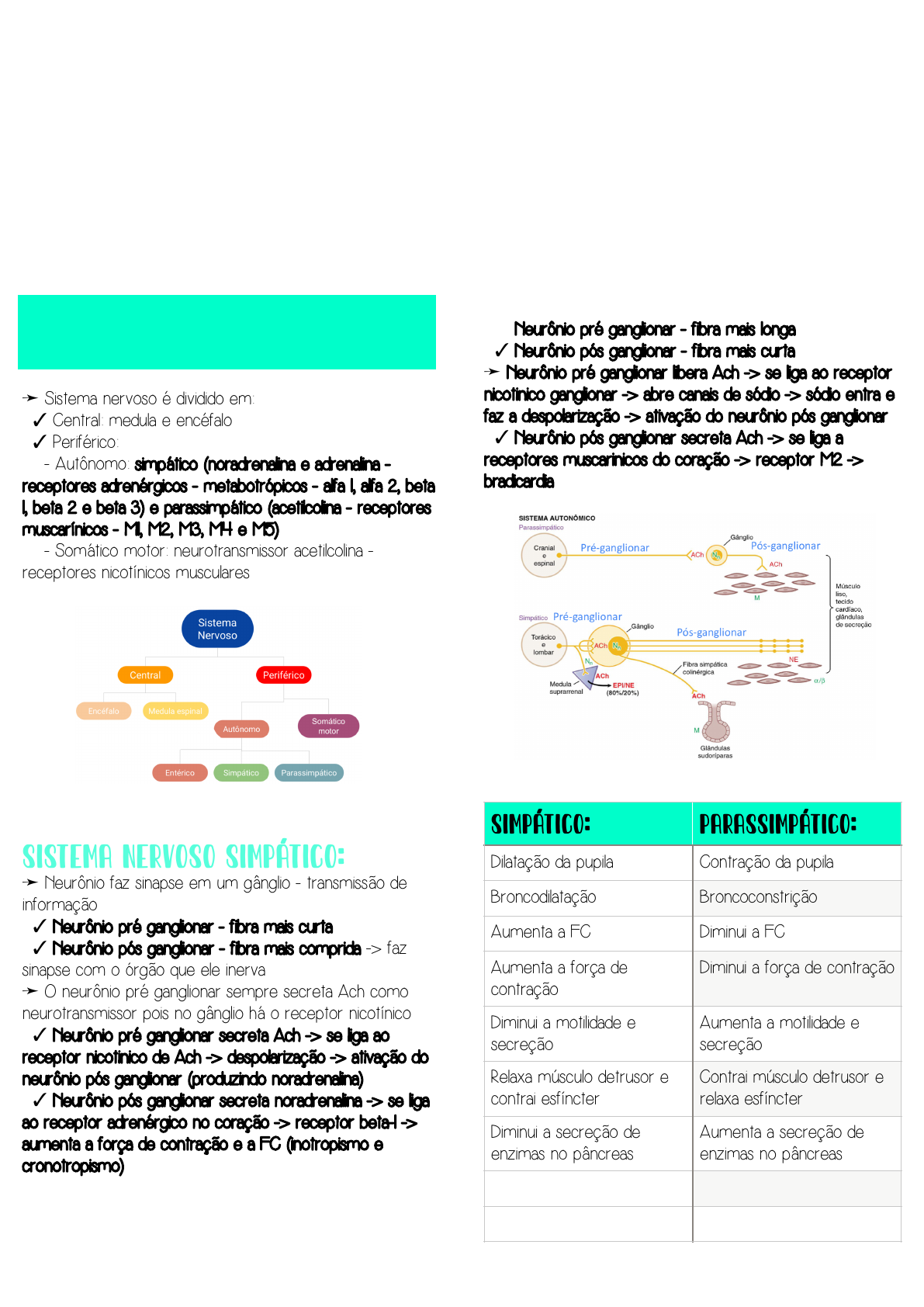 Camila Mariana Castro de Oliveira Medicina Nove de Julho FarmAcologia do sistema nervoso autônomo parassimpático ➛ Sistema nervoso é dividido em: ✓ Central: medula e encéfalo ✓ Periférico: - Autônomo: simpático (noradrenalina e adrenalina - receptores adrenérgicos - metabotrópicos - alfa 1, alfa 2, beta 1, beta 2 e beta 3) e parassimpático (acetilcolina - receptores muscarínicos - M1, M2, M3, M4 e M5) - Somático motor: neurotransmissor acetilcolina - receptores nicotínicos musculares Sistema nervoso simpático: ➛ Neurônio faz sinapse em um gânglio - transmissão de informação ✓ Neurônio pré ganglionar - fibra mais curta ✓ Neurônio pós ganglionar - fibra mais comprida -> faz sinapse com o órgão que ele inerva ➛ O neurônio pré ganglionar sempre secreta Ach como neurotransmissor pois no gânglio há o receptor nicotínico ✓ Neurônio pré ganglionar secreta Ach -> se liga ao receptor nicotinico de Ach -> despolarização -> ativação do neurônio pós ganglionar (produzindo noradrenalina) ✓ Neurônio pós ganglionar secreta noradrenalina -> se liga ao receptor adrenérgico no coração -> receptor beta-1 -> aumenta a força de contração e a FC (inotropismo e cronotropismo) Sistema nervoso parassimpático: ➛ Neurônio faz sinapse em um gânglio ✓ Neurônio pré ganglionar - fibra mais longa ✓ Neurônio pós ganglionar - fibra mais curta ➛ Neurônio pré ganglionar libera Ach -> se liga ao receptor nicotinico ganglionar -> abre canais de sódio -> sódio entra e faz a despolarização -> ativação do neurônio pós ganglionar ✓ Neurônio pós ganglionar secreta Ach -> se liga a receptores muscarinicos do coração -> receptor M2 -> bradicardia Simpático: Parassimpático: Dilatação da pupila Contração da pupila Broncodilatação Broncoconstrição Aumenta a FC Diminui a FC Aumenta a força de contração Diminui a força de contração Diminui a motilidade e secreção Aumenta a motilidade e secreção Relaxa músculo detrusor e contrai esfíncter Contrai músculo detrusor e relaxa esfíncter Diminui a secreção de enzimas no pâncreas Aumenta a secreção de enzimas no pâncreas Saliva espessa (pois diminui) Saliva diluída Ejaculação Ereção Farmacologia do sistema nervoso Introdução: autonomo parassimpatico Camila Mariana Castro de Oliveira Medicina Nove de Julho ➛ Noradrenalina, dopamina 1) Tirosina entra no neurônio 2) Tirosina sofre ação da tirosina hidroxilase 3) Formação da L-DOPA (percursor da dopamina) 4) L-DOPA sofre ação da DOPA-descarboxilase 5) A DOPA-descarboxilase produz a dopamina 6) A dopamina entra na vesícula e sofre ação da Vmat (transportador vesicular de monoaminas) 7) Dopamina sofre ação da dopamina beta-hidroxilase e forma noradrenalina 8) Ocorre despolarização para que a vesícula com noradrenalina seja liberada na fenda sináptica - Potencial de ação age em canais de cálcio voltagem dependente -> cálcio entra -> vesículas se fundem -> liberam noradrenalina na fenda 9) Noradrenalina se liga aos seus receptores adrenérgicos (muito rápido - milissegundos) 10) Recaptação usando o NET- transportador que permite que a noradrenalina volte para o neurônio e para a vesícula -> transportador NET (transportador de noraepinefrina/ noradrenalina) 11) Dentro do corpo do neurônio existe a enzima MAO (monoamina oxidase) - enzima que degrada as monoaminas (serotonina, noradrenalina e dopamina) - MAO-A: degrada principalmente noradrenalina e serotonina - MAO-B: degrada principalmente a dopamina 12) a MAO metaboliza a noradrenalina 13) A noradrenalina pode sofrer autorregulação por autorreceptores alfa-2 inibitório - Promove a redução do cálcio - Reduz a exocitose (saída de neurotransmissor) - Reduz a quantidade de neurotransmissor liberado (feedback) Receptores adrenérgicos: ➛ Alfa-1: constrição (vaso, músculo liso, esfíncter) - vasoconstrição, midríase, contração da próstata e esfíncter ➛Alfa-2: pré-sináptico autoinibitório que reduz a liberação de noradrenalina/norepinefrina ➛ Beta-1: coração - aumento da FC (cronotropismo) e da força de contração (inotropismo), aumento da secreção de renina ➛ Beta-2: dilatação de músculo liso (brônquico), vasodilatação, glicogenólise ➛ Beta-3: lipólise Catecolaminas: Não sofrem inervação do parassimpático, sofre ação somente do simpático: - Vasos sanguíneos (constrição) - Rins (aumenta secreção de renina) - Músculos pilomotores (aumenta a contração) - Glândulas sudoríparas (sudorese) - Fígado (glicogenolise) - Tecido adiposo (lipólise) - Fármacos que estimulam o alfa-2 inibitório (agonista): diminui a quantidade de noradrenalina liberada - Fármacos que inibem o alfa-2 inibitório (antagonista): aumenta a quantidade de noradrenalina liberada - Fármacos que inibem a recaptação pela NET: agonista indireto -> mais neurotransmissores na fenda, maior liberação de noradrenalina A ação desses receptores são diferentes pois cada um está acoplado a uma proteína G Camila Mariana Castro de Oliveira Medicina Nove de Julho ➛ Receptores muscarínicos 1) Colina entra no neurônio 2) Acetil-CoA se liga a colina por meio da enzima colina-acetil- transferase 3) Formação da acetilcolina - armazenada na vesícula 4) Acetilcolina sofre ação do transportador Vchat 5) Ocorre despolarização - cálcio entra e vesícula se funde na membrana do neurônio 6) Liberação de acetilcolina na fenda sináptica 7) Acetilcolina se liga aos seus receptores - Parassimpático: receptor muscarinico - Simpático: receptor nicotinico 8) Metabolização pela enzima acetilcolinesterase (Ache) - metaboliza a acetilcolina formando dois compostos: colina e acetato - Colina é recaptada para dentro do neurônio e acetato é excretado 9) Autoinibição pelo receptor M2 Receptores colinérgicos: Receptores muscarínicos: ➛ Acoplados à proteína G ➛ Ímpares: estimulatórios (M1, M3 e M5) - ligados a proteína G