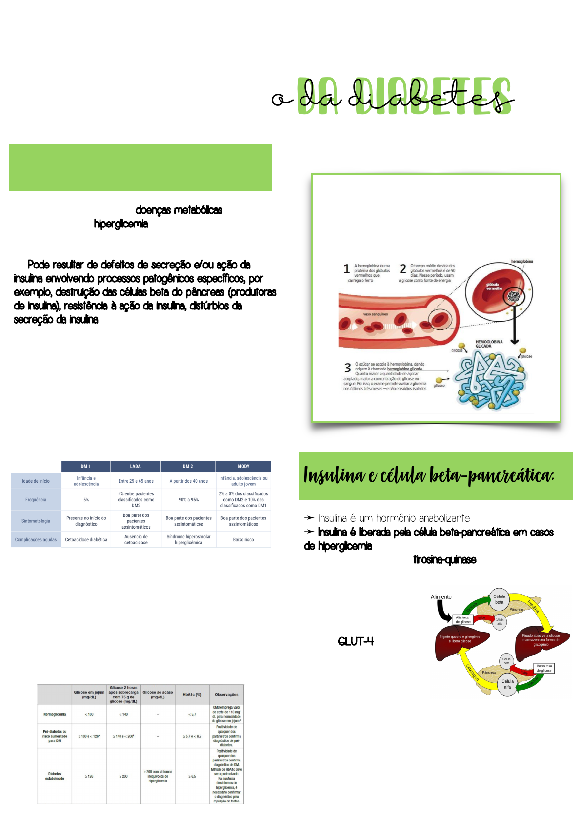 Camila Mariana Castro de Oliveira Medicina Nove de Julho Tratamento da diabetes ➛ Diabetes é um grupo de doenças metabólicas caracterizadas por hiperglicemia e associadas a complicações, disfunções e insuficiência de vários órgãos, especialmente olhos, rins, nervos, cérebro, coração e vasos sanguíneos ➛ Pode resultar de defeitos de secreção e/ou ação da insulina envolvendo processos patogênicos específicos, por exemplo, destruição das células beta do pâncreas (produtoras de insulina), resistência à ação da insulina, distúrbios da secreção da insulina, entre outros Classificação da diabetes: ➛ DM-1: deficiência de insulina por autodestruição imune das células beta-pancreáticas ➛ DM-2: resistência à insulina combinada com a perda progressiva de secreção de insulina ➛ DM gestacional ➛ DM monogenica (MODY) Sinais e sintomas: ➛ DM-1: cansaço fácil, muita sede, aumento do apetite, emagrecimento, urina aumenta ➛ DM-2: cansaço fácil, aumento do apetite, muita sede, ganho de peso, urina aumentada Diagnóstico: ➛ Insulina é um hormônio anabolizante ➛ Insulina é liberada pela célula beta-pancreática em casos de hiperglicemia ✓ Receptor de insulina: tirosina-quinase -> presente no músculo esquelético, tecido adiposo e hepatócitos - Síntese de glicogênese e lipogenese ✓ Transportador de insulina: GLUT-4 -> presente na musculatura esquelética e no tecido adiposo - Ao ativar o receptor tirosina-quinase há a ativação de respostas intracelulares e uma dessas respostas aumenta a exposição do GLUT-4, fazendo com que haja um aumento da captação de glicose nas células, controlando a glicemia Tratamento da diabetes Introdução: Insulina e célula beta-pancreática: Hemoglobina glicada: ➛ Reflete o comportando da glicemia do paciente nos últimos três meses Camila Mariana Castro de Oliveira Medicina Nove de Julho Liberação de insulina: ➛ Glicose entra na célula beta-pancreática através do transportador GLUT-2 (presente na célula beta) ➛ Glicose é armazenada na forma de moléculas de ATP após passar pelo ciclo de krebs ➛ Presença do Canal de íons K+ sensíveis ao ATP na célula beta-pancreática ✓ O potássio tende a sair quando o canal está aberto pois há uma concentração maior de K+ dentro da célula ✓ O excesso de ATP, por conta da hiperglicemia, bloqueia esse canal - aumenta a concentração de K+ dentro da célula (processo de despolarização) ➛ Presença do Canal de Ca+2 sensíveis a voltagem na célula beta-pancreática ✓ Ao despolarizar há abertura do canal de cálcio fazendo com que haja um influxo desse íon (aumento da concentração de Ca+2 intracelular) ✓ Cálcio é responsável por fazer exocitose -> liberação de insulina na circulação ➛ Presença de um receptor metabotrópico na célula beta- pancreática (acoplado a uma proteína G) ✓ Incretinas (GLP1 e GYP) se ligam aos receptores metabotropicos e aumentam a produção de AMPc que fosforila e ativa outras proteínas, facilitando a exocitose ✓ Incretinas - hormônio liberado pelas células do TGI ✓ São importantes para liberação de insulina ✓ Enzima DPP-4: produzida para controlar os efeitos da incretinas ➛ Secretagogos de insulina (hipoglicemiantes): ✓ Inibidores da DPP-4: ao inibir essa enzima haverá uma maior ação de incretinas, fazendo com que haja uma maior liberação de insulina ✓ Sulfonilureias e Metiglinidas: agem bloqueando o canal de K+ sensíveis ao ATP, facilitando a despolarização e a exocitose liberando insulina ✓ Incretinomiméticas de GLP1: agonista de GLP1, ativa o metabotropico e aumenta a secreção de insulina ➛ Sensibilizadores de insulina (anti-hiperglicemiantes): biguandas e tiazolidinedionas ➛ Moduladores da absorção de nutrientes no TGI: inibidores de alfa-glicosidade intestinal ➛ Inibidores da SGLT-2 (promovem glicosúria): dalagliflozina, empagliflozina e canagliflozina Sulfonilureias: ➛ Classe secretagogo de insulina (hipoglicemiante) ➛ Clorpromida, glibenclamida, gliclazida, glipizida, glimepirida ➛ As sulfonilureias bloqueiam canais de K+ resultando na despolarização e influxo de cálcio que induz a exocitose da insulina (agem sobre a células beta- pancreáticas) Receptor adrenérgico alfa-2 acoplado a proteína G (metabotrópico) -> adrenalina agindo nesse receptor inibe a liberação de insulina Fármac Hipoglicemiant: Camila Mariana Castro de Oliveira Medicina Nove de Julho Uso clinico: ➛ DM-2 fases inicias (presença de células beta) com 50-80% de resposta em pacientes selecionados ➛ Glibenclamida - risco aumentado de hipoglicemia (disfunção renal), porém pouco atravessa a placenta, sendo uma escolha alternativa a insulina em gestantes ➛ Alto potencial de redução da HbA1C (2%) ➛ Controle da glicemia de jejum e de 24h Efeitos colaterais: ➛ Aumento de massa corporal (cuidado com pacientes obesos) ➛ Hipoglicemia (principalmente glibenclamida e clorpropamida - cuidado com pacientes idosos e com pessoas incapacitadas) ➛ Glipizida ou glimepirida são mais mais seguro na disfunção renal Interação medicamentosa: ➛ Fármacos que podem potencializar os efeitos das sulfonilureias causando hipoglicemia: ✓ Antifúngicos azois ✓ Beta-bloqueadores ✓ Cloranfenicol ✓ Claritromicina ✓ Inibidores de monoaminoxidase ✓ Probenecida ✓ Sulfonamida ➛ Fármacos que podem reduzir os efeitos das sulfonilureias causando a perda do controle da glicemia: ✓ Antipsicóticos atípicos ✓ Corticosteroides ✓ Diuréticos ✓ Niacina ✓ Fenotiazinicos ✓ Simpaticomiméticos Metiglinidas: ➛ Classe secretagogo de insulina ➛ Repaglinida, nateglinida ➛ As glinidas bloqueiam canais de K+ resultando na despolarização e influxo de cálcio que induz a exocitose da insulina (agem sobre as células beta-pancreáticas) ➛ Início de ação rápida e duração mais curta ➛ Reguladores glicêmicos pós-prandiais ➛ Menos potentes q