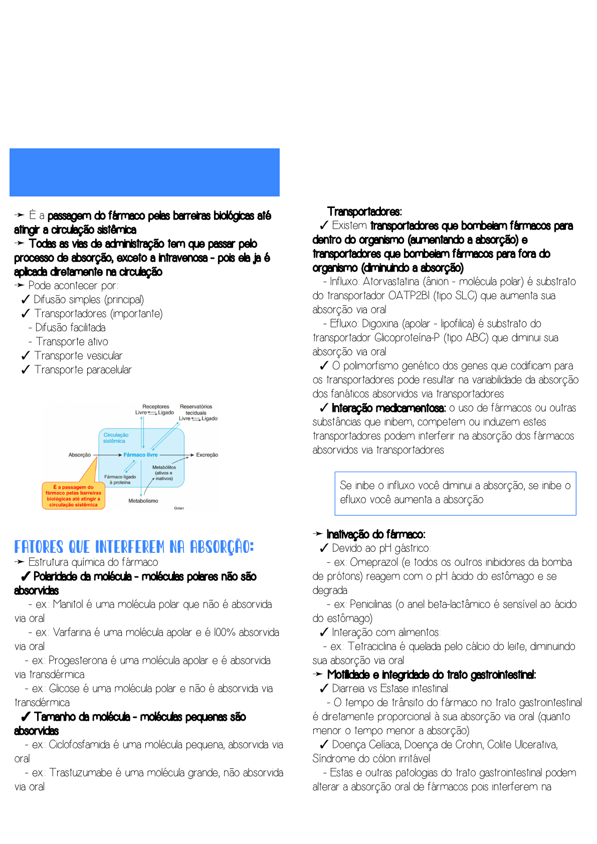 Camila Mariana Castro de Oliveira Medicina Nove de Julho Farmacocinética ➛ É a passagem do fármaco pelas barreiras biológicas até atingir a circulação sistêmica ➛ Todas as vias de administração tem que passar pelo processo de absorção, exceto a intravenosa - pois ela ja é aplicada diretamente na circulação ➛ Pode acontecer por: ✓ Difusão simples (principal) ✓ Transportadores (importante) - Difusão facilitada - Transporte ativo ✓ Transporte vesicular ✓ Transporte paracelular Fatores que interferem na absorção: ➛ Estrutura química do fármaco ✓ Polaridade da molécula - moléculas polares não são absorvidas - ex.: Manitol é uma molécula polar que não é absorvida via oral - ex.: Varfarina é uma molécula apolar e é 100% absorvida via oral - ex.: Progesterona é uma molécula apolar e é absorvida via transdérmica - ex.: Glicose é uma molécula polar e não é absorvida via transdérmica ✓ Tamanho da molécula - moléculas pequenas são absorvidas - ex.: Ciclofosfamida é uma molécula pequena, absorvida via oral - ex.: Trastuzumabe é uma molécula grande, não absorvida via oral - ex: Ácido hialurônico é uma molécula grande não absorvida via oral e/ou transdermica ➛ Transportadores: ✓ Existem transportadores que bombeiam fármacos para dentro do organismo (aumentando a absorção) e transportadores que bombeiam fármacos para fora do organismo (diminuindo a absorção) - Influxo: Atorvastatina (ânion - molécula polar) é substrato do transportador OATP2B1 (tipo SLC) que aumenta sua absorção via oral - Efluxo: Digoxina (apolar - lipofilica) é substrato do transportador Glicoproteína-P (tipo ABC) que diminui sua absorção via oral ✓ O polimorfismo genético dos genes que codificam para os transportadores pode resultar na variabilidade da absorção dos fanáticos absorvidos via transportadores ✓ Interação medicamentosa: o uso de fármacos ou outras substâncias que inibem, competem ou induzem estes transportadores podem interferir na absorção dos fármacos absorvidos via transportadores ➛ Inativação do fármaco: ✓ Devido ao pH gástrico: - ex: Omeprazol (e todos os outros inibidores da bomba de prótons) reagem com o pH ácido do estômago e se degrada - ex: Penicilinas (o anel beta-lactâmico é sensível ao ácido do estômago) ✓ Interação com alimentos: - ex.: Tetraciclina é quelada pelo cálcio do leite, diminuindo sua absorção via oral ➛ Motilidade e integridade do trato gastrointestinal: ✓ Diarreia vs Estase intestinal: - O tempo de trânsito do fármaco no trato gastrointestinal é diretamente proporcional à sua absorção via oral (quanto menor o tempo menor a absorção). ✓ Doença Celíaca, Doença de Crohn, Colite Ulcerativa, Síndrome do cólon irritável - Estas e outras patologias do trato gastrointestinal podem alterar a absorção oral de fármacos pois interferem na permeabilidade intestinal. Farmacocinetica Absorção: Se inibe o influxo você diminui a absorção, se inibe o efluxo você aumenta a absorção Camila Mariana Castro de Oliveira Medicina Nove de Julho ➛ É o transporte (ida e volta) do fármaco entre a circulação sistêmica e outro compartimento ➛ Pode acontecer por: ✓ Difusão simples ✓ Transportadores ✓ Transporte vesicular ✓ Transporte paracelular ➛ Exemplos de alguns compartimentos importantes: ✓ Sistema nervoso central ✓ Placenta ✓ Músculos ✓ Tecido adiposo ✓ Interstício ✓ Epiderme ➛ A ligação à proteínas plasmáticas é também considerado um processo de distribuição do fármaco Fatores que interferem na distribuição: ➛ Propriedade do fármaco ✓ ex: Heparina é uma molécula grande e polar que permanece no plasma sanguíneo e não é distribuída pelos tecidos ✓ ex: Fentanil é uma molécula apolar que é rapidamente distribuída para o SNC e tecido adiposo ➛ Perfusão do tecido. ✓ Quanto maior a perfusão (fluxo sanguíneo) no tecido, mais rápida é a distribuição do fármaco. ✓ A velocidade de distribuição pode interferir na cinética do fármaco, isto é na velocidade de decaimento da concentração plasmática do fármaco em função do tempo (meia-vida). ➛ Barreiras especiais em determinados tecidos/órgãos ✓ Barreira hematoencefálica ✓ Barreira placentária Velocidade de distribuição vs. concentração plasmática: ➛ Distribuição muito rápida: (instantânea) ✓ Quando isso acontece o fármaco apresenta uma única taxa de decaimento da concentração plasmática que corresponde apenas a taxa de eliminação, pois o fármaco foi rapidamente distribuído - Nesses casos a meia vida observada é única e constante - Este é chamado modelo monocompartimental de decaimento (é como se o organismo fosse composto de um único compartimento) ou seja, imaginamos que o fármaco é imediatamente distribuído no organismo Diribuição: Distribuição de THC: - THC é uma molécula apolar e lipofilica e por isso se observa uma lenta acumulação de THC nos tecidos adiposos Camila Mariana Castro de Oliveira Medicina Nove de Julho ➛ Distribuição lenta: ✓ Quando isso acontece o fármaco vai apresentar inicialmente uma taxa de decaimento maior (correspondente a distribuição), seguida de uma taxa de decaimento baixa (correspondente a eliminação) - Nesses casos o fármaco vai apresentar dois valores de meia vida - A meia vida inicial será menor que a meia vida final - Esse é o modelo bicompartimental de decaimento (primeiro a distribuição, depois a eliminação) Barreira hematoencefálica: ➛ É uma barreira de proteção ao SNC ➛ Ela é formada por: ✓ Capilares ricos em junções de adesão que fecham os espaços intercelulares impedindo a passagem de fármacos por transporte paracelular - Impede a entrada de fármacos hidrofílico ✓ Células que não permitem o transporte vesicular ✓ Celular ricas em transportadores do tipo ABC (glicoproteina-P) que bombeiam fármacos para fora do