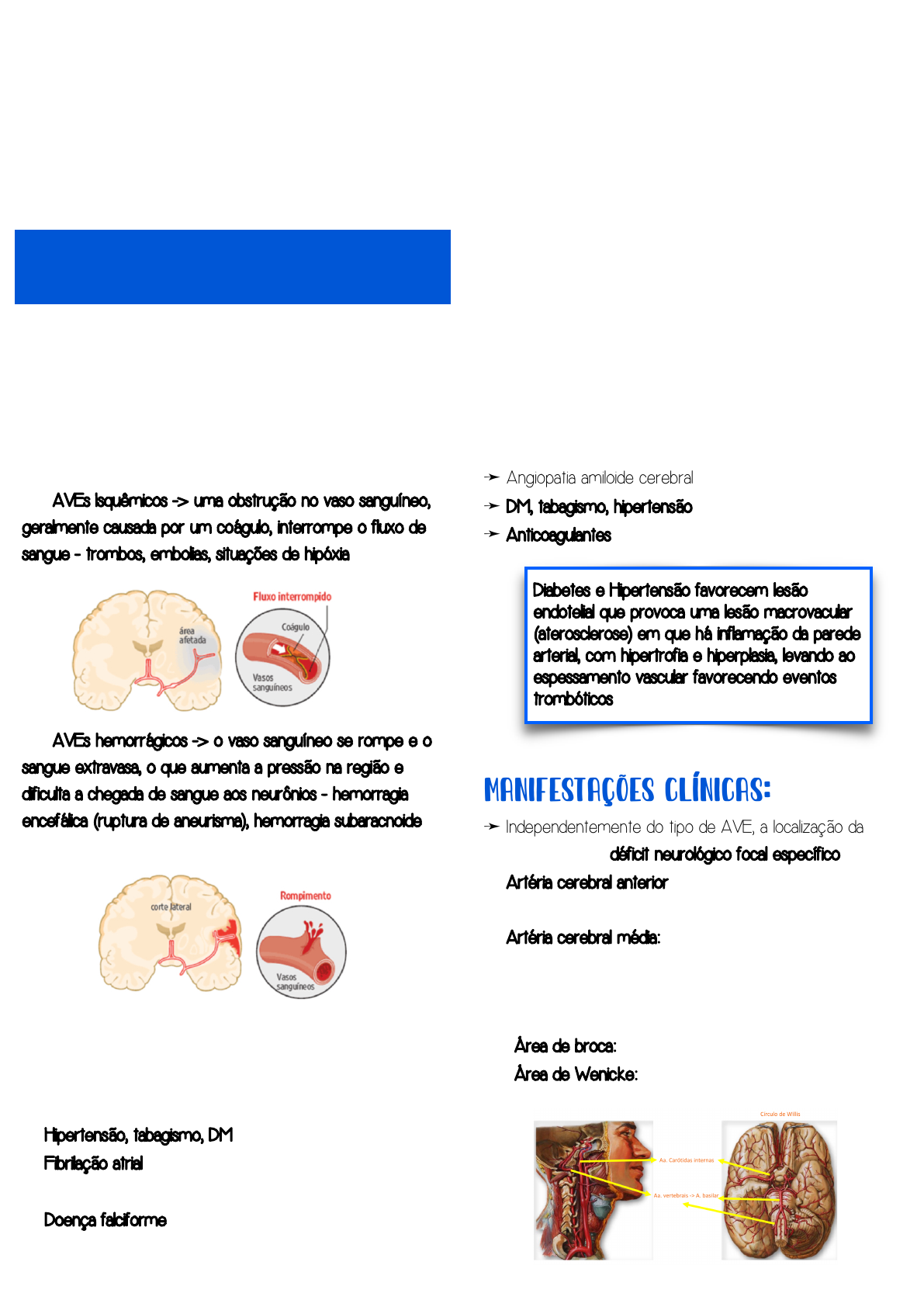 Camila Mariana Castro de Oliveira Medicina Nove de Julho Doenças cerebrovasculares ➛ Segunda causa mais comum de óbito por doença vascular no mundo (primeira: IAM) ➛ Acidentes vasculares cerebrais (AVCs) ou encefálicos (AVEs) ➛ Artéria cerebral média -> é a mais acometida ➛ Dois tipos: ✓ AVEs Isquêmicos -> uma obstrução no vaso sanguíneo, geralmente causada por um coágulo, interrompe o fluxo de sangue - trombos, embolias, situações de hipóxia ✓ AVEs hemorrágicos -> o vaso sanguíneo se rompe e o sangue extravasa, o que aumenta a pressão na região e dificulta a chegada de sangue aos neurônios - hemorragia encefálica (ruptura de aneurisma), hemorragia subaracnoide Fator de risco - AVC isquêmico: ➛ Idade avançada ➛ História familiar de AVE ➛ Hipertensão, tabagismo, DM ➛ Fibrilação atrial ➛ Estenose da artéria carótida ➛ Doença falciforme ➛ Dislipidemias Fator de risco - AVC hemorrágico: ➛ Idade avançada ➛ Sexo masculino ➛ Etnia ➛ História familiar de AVE ➛ Hemofilia ➛ Angiopatia amiloide cerebral ➛ DM, tabagismo, hipertensão ➛ Anticoagulantes Manifestações clínicas: ➛ Independentemente do tipo de AVE, a localização da lesão determina o déficit neurológico focal específico ➛ Artéria cerebral anterior: paralisia e perda de sensibilidade de membros inferiores, incontinência urinária ➛ Artéria cerebral média: paralisia e perda de sensibilidade de membros superiores e face, síndrome de negligência (paciente deixa de perceber um lado do corpo), alterações de linguagem ✓ Área de broca: dificuldade de fala ✓ Área de Wenicke: dificuldade de compreensão Doencas cerebrovasculares Acidente Vascular Encefálico: Diabetes e Hipertensão favorecem lesão endotelial que provoca uma lesão macrovacular (aterosclerose) em que há inflamação da parede arterial, com hipertrofia e hiperplasia, levando ao espessamento vascular favorecendo eventos trombóticos Camila Mariana Castro de Oliveira Medicina Nove de Julho Fisiopatogenia: ➛ Trombose e tromboembolia -> infartos encefálicos ✓ Infarto hemorrágico por obstrução venosa - trombose venosa em veias superficiais / seios da dura-máter ➛ Aterosclerose (diabetes + HAS): artéria cerebral média (trombose), carótida interna (embolia) -> infarto ➛ Trombos de origem cardíaca: fibrilação atrial, endocardite -> tromboembolismo -> infarto ➛ Arterioloesclerose hialina (diabetes + HAS): redução da luz de vasos -> isquemia -> infartos lacunares ✓ Principais locais: núcleo da base e mesencéfalo ➛ Encefalopatia hipóxico isquêmica: isquemia cerebral local ✓ Hipotensão arterial grave (choque), parada cardíaca, cirurgias cardíacas, hipóxia neonatal, aumento extremo da PIC Morfologia macroscópica: ➛ Primeiras 6h: aparência inalterada (RM pode perceber alterações precoces) ➛ Próximas 48h: palidez (infarto branco), amolecimento e edema (aumento de volume); limite córtico/medular e entre o tecido morto e residual indistinto AVE Isquêmico: Complicações agudas do ave isquêmico: ➛ Infarto -> morte celular -> inflamação ➛ Lesão da BHE -> edema vasogênico + edema celular ➛ Efeito de massa: herniações Camila Mariana Castro de Oliveira Medicina Nove de Julho ➛ De 2 a 10 dias: parênquima gelatinoso (aparecimento de necrose liquefativa), friável; limite com parênquima residual aparente ➛ De 10 dias a 3 semanas: parênquima infartado liquefeito (necrose liquefativa), expandindo até sua reabsorção; cavitação parenquimatosa, presença de cicatriz glial na área de infarto, atrofia do parênquima (hidrocefalia ex vácuo) Morfologia microscópica: ➛ Após 12h: necrose neuronal (neurônios vermelhos necróticos) e edema (vasogênico e citotóxico), degeneração hidrópica da glia, degeneração da mielina ➛ De 12 a 48h: recrutamento de neutrófilos, ativação de macrófagos e micróglia (células grânulo-gordurosas (predominam durante 3 semanas seguintes) ➛ Após 1 semana: astrócitos reativos ou gemistocísticos (gliose), concomitante à ação microglial/ macrofágica ➛ Após meses de evolução: deposição fibrilar ao redor da área reabsorvida, fibrose perivascular ✓ Ocupação por LCR da área desprovida de parênquima Princípios terapêuticos associados a fisiopatogenia: ➛ Área isquêmica central x Zona de penumbra ✓ Área isquêmica central: região que só recebe irrigação da artéria obstruída ✓ Zona de penumbra: ao redor da área isquêmica central, são neurônios que estão começando a ter problemas e apresentam poucas horas de vida após esse evento, mas ainda são viáveis se forem reperfundidos ➛ Trombólise: até 4,5h do início dos sintomas - RTPA (ativador do plasminogenio tecidual recombinante) -> se não efetivo: angioplastia ➛ Prevenção: AAS ➛ Risco além desse tempo: conversão hemorrágica do infarto devido lesão tecidual, inclusive endotelial ➛ Suspeita de AVE hemorrágico, histórico de traumas encefálicos - outras hemorragias -> não realizar RTPA ➛ Dois tipos: ✓ Hemorragia intracerebral - vaso do parênquima rompe e sangra ✓ Hemorragia subaracnoide - ruptura de um vaso subaracnoide AVE Hemoágico: Há o uso de terapia trombolítica para romper o trombo e liberar o fluxo sanguíneo do vaso, favorecendo a reperfusão tecidual. Não é aconselhado fazer uso da terapia trombolítica após 4,5h do início dos sintomas pois tem grandes riscos de hemorragia por reperfusão - essa área de infarto é uma região restrita em que há inflamação e reparo tecidual (gliose) Camila Mariana Castro de Oliveira Medicina Nove de Julho ➛ Letalidade maior pois o aumento da PIC é muito mais rápido ➛ A coleção intracraniana de sangue extravasado leva ao aumento da PIC e compressão de estruturas adjacentes - morte do tecido adjacente e/ou herniações ➛ Muito relacionados com a hipertensão e aos microaneurismas e aneurisma sacular Hemorragias e hematomas loba