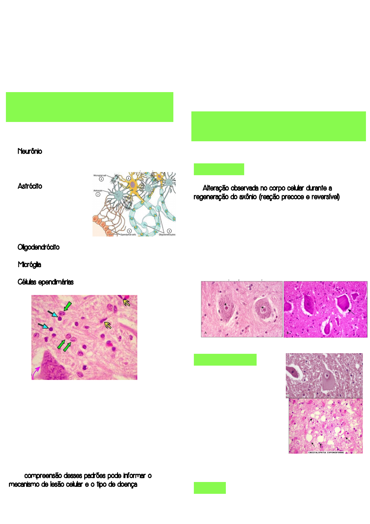 Camila Mariana Castro de Oliveira Medicina Nove de Julho Neuropatologia ➛ Lesão do SNC: alteração em célula da Glia, principalmente astrócitos ➛ Neurônio (1) - seta curva: corpúsculo de nissi (RER) - indicativo de lesão quando rebatido para as extremidades ➛ Astrócito (2) - seta verde: núcleo globoso mais claros próximo de vasos, responsável pela sustentação ao tecido nervoso e formação da barreira hematoencefálica ➛ Oligodendrócito (3) - seta azul: próximo de axônios - síntese de bainha de mielina ➛ Micróglia (4) - seta amarela: núcleo alongado similar ao macrófago tecidual ➛ Células ependimárias (5) Patologia celular do SNC: ➛ Os neurônios requerem um suprimento contínuo de oxigênio e glicose para atender as necessidades metabólicas ➛ A manutenção e a qualidade das proteínas precisam ser cuidadosamente reguladas para garantir a integridade celular ➛ Caso haja hipóxia, isquemia, trauma, infecção ou lesão química, o tecido nervoso responde com características peculiares ➛ A compreensão desses padrões pode informar o mecanismo de lesão celular e o tipo de doença Corpo celular - pericário: Cromatólise: ➛ Reação axonal ➛ Alteração observada no corpo celular durante a regeneração do axônio (reação precoce e reversível) ➛ Secção (axotomia) ou dano grave do axônio de neurônios motores (Substância cinza - corno anterior da medula espinal) ➛ Aumento de proteínas envolvidas na regeneração do axônio (estado metabólico aumentado) ➛ Aumento do tamanho e arredondamento do corpo celular (tumefação), deslocamento periférico do núcleo, aumento do tamanho do nucléolo e dispersão da substância de nissi do centro para a periferia da célula Armazenamento: ➛ Tumefação ao celular/ degeneração espongiforme ➛ Modificações na permeabilidade da membrana citoplasmática ➛ Contorno do neurônio torna-se abaulado, enquanto diminui a basofilia do citoplasma (célula opaca) ➛ Evolução da tumefação com aspecto vacúolos no neuropilo (degeneração espongiforme) Atrofia: ➛ Atrofia simples: Neuropatologia Introdução: Alteraçõ Neuronais: Camila Mariana Castro de Oliveira Medicina Nove de Julho ✓ Processos crônicos, no envelhecimento e processos crônicos isquêmico ✓ Retração do corpo neuronal com basofilia citoplasmática (cor mais azulada) e hipercromasia nuclear ✓ Consequente atrofia muscular, paralisia e mórte ➛ Atrofia pigmentar: ✓ Acúmulo de lipofuscina (cor marrom) Necrose: ➛ Neurônios vermelhos ou isquêmicos ➛ Alterações em decorrência de anóxia por isquemia aguda ➛ Neurônios vermelhos ficam evidentes em torno de 12 a 24h após lesão ➛ Retração do corpo celular (forma triangular), picnose do núcleo, desaparecimento do nucléolo e perda da substância de nissi, com intensa eosinofilia citoplasmática (mais vermelha) ✓ Pode sofrer lise e calcificação Erro inato: ➛ Doenças genéticas ➛ Deficiência de enzimas lisossomicas resultam em acúmulo do substrato no citoplasma de neurônios ➛ Pericário abaulado e espumoso com o núcleo deslocado para a periferia ➛ Esfingolipidose: distúrbios do metabolismo de esfingolipídeos de origem genética, autossômicos recessivos, incomuns e que degeneram progressivamente o sistema nervoso central. Inclusões protéicas: ➛ Doenças degenerativas do SNC ➛ Doença de Alzheimer (emaranhados neurofibrilares resultante do acúmulo da proteína TAU hiperfosforilada) ➛ Inclusões intracitoplasmáticas (em torno do núcleo ou ocupando todo o pericário) ➛ Inclusões intracitoplasmática ➛ Imunorreatividade para alfa-sinucleina (proteína envolvida na homeostase da vesícula pré-sináptica) ➛ Doença de parkinson (corpúsculo de Lewy) Infecções virais: ➛ Corpúsculos de inclusão nuclear ou citoplasmático ➛ A infecção viral pode levar a inclusões intranucleares e/ou citoplasmáticas anormais (resultantes da replicação viral) ✓ Infecção herpética (corpúsculo de cowdry) ✓ Raiva (corpúsculo de negri) Camila Mariana Castro de Oliveira Medicina Nove de Julho ✓ Citomegalovírus (inclusões no núcleo e citoplasma) Dendritos: ➛ Redução da ramificação dendrítica é encontrada no envelhecimento, na doença de Alzheimer e após axotomia ➛ Alterações no padrão da ramificação dendritica e na forma e no número de espinhos são encontradas em algumas doenças associadas a retardamento mental e na epilepsia do lobo temporal Axônio: ➛ Lesão axonal aguda é um achado comum em traumatismos cranioencefálicos. ✓ Axotomia primária: Sem ruptura, interrupção do fluxo axonal, tumefação e fragmentação do segmento afetado (axotomia secundária) Reações dos astrócitos à lesão: Tumefação: ➛ Processo de isquemia (degeneração hidrópica - célula mais envolvida neste processo - edema citotoxico) ➛ Aumento da expressão de aquaporina Gliose: ➛ A gliose é o indicador histopatológico mais importante de lesão do SNC, independentemente da etiologia ➛ Caracterizada tanto pela hipertrofia quanto pela hiperplasia dos astrócitos (astrocitose) ➛ Reparo e cicatrização do tecido nervoso ➛ Astrócito reativo à lesão ➛ Núcleo aumenta de tamanho e se torna vesiculares, desenvolvendo nucléolos proeminentes ➛ Expansão citoplasmática, rosa-brilhante e irregular ao redor de um núcleo excêntrico, numerosos prolongamentos vigorosos e ramificados (astrócitos gemistocíticos) ➛ Aumento na expressão da proteína GFAP (proteína fibrilar ácida glial) Astrócito de Alzheimer tipo 2: ➛ Não relacionado à doença de Alzheimer, mas descrito pela primeira vez pelo mesmo indivíduo ➛ Hiperamonemia de longa duração (doença hepática crônica, doença de Wilson ou em distúrbios metabólicos hereditários) ➛ Célula da substância cinzenta que possui um núcleo grande, cromatina central de coloração pálida, uma gotícula intranuclear de glicogênio, e membrana n