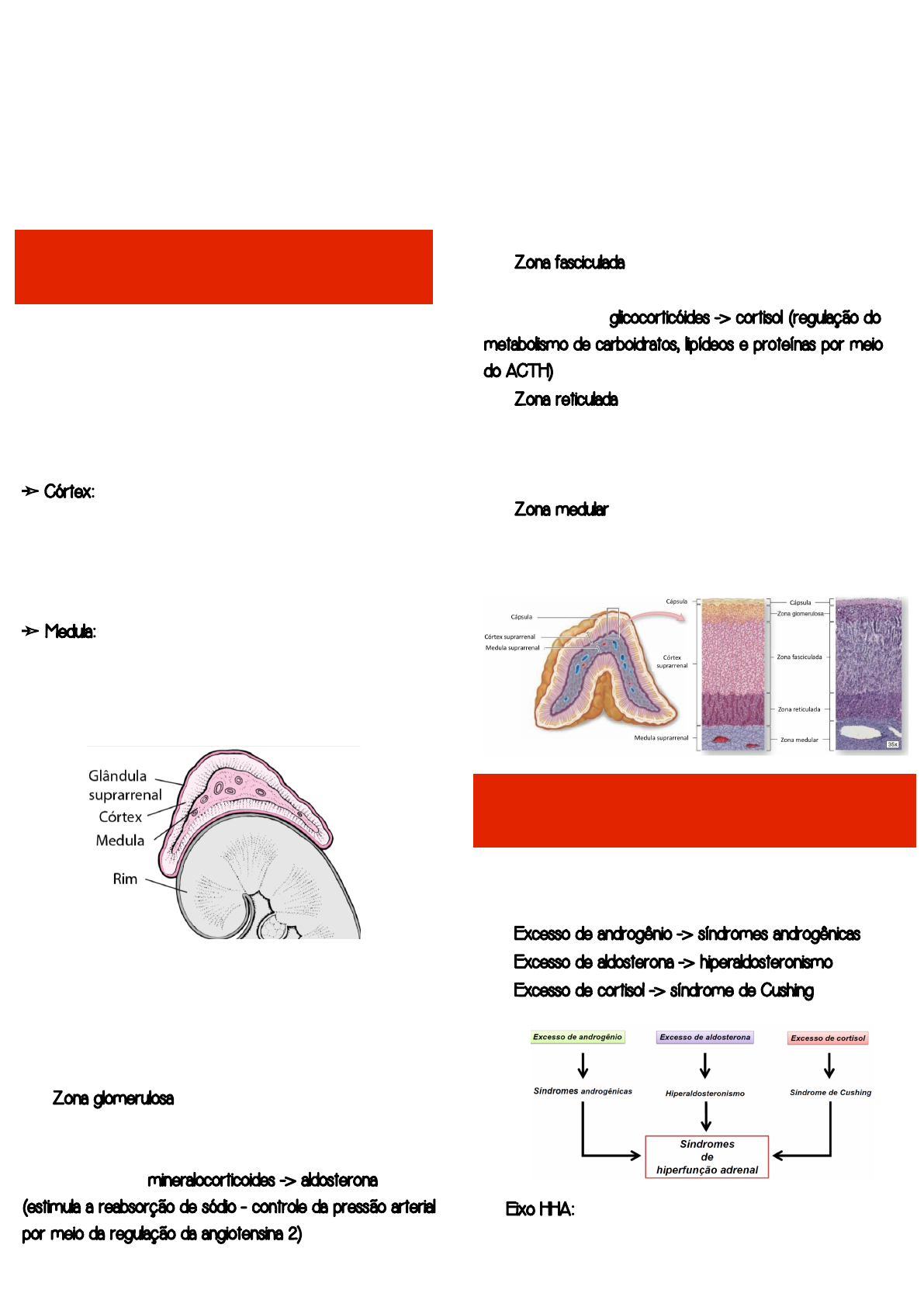Camila Mariana Castro de Oliveira Medicina Nove de Julho Patologia da suprarrenal Anatomia: ➛ Glândula adrenal ➛ Superiores e ligeiramente anteriores ao polo superior de cada rim ➛ Cápsula de tecido conjuntivo denso - fibras reticulares ➛ Córtex: ✓ Porção secretora de esteroides ✓ Situa-se abaixo da cápsula e constitui quase 90% da glândula ✓ Origem: mesoderma embrionário ➛ Medula: ✓ Porção secretora de catecolaminas ✓ Situa-se abaixo do córtex e forma o centro da glândula ✓ Origem: neuroectoderma embrionário Histologia: ➛ Dividida em: ✓ Cápsula ✓ Zona glomerulosa - células piramidais ou colunares, organizado em forma de alças (glomérulos), envolvidas por capilares sanguíneos fenestrados - Secreção de mineralocorticoides -> aldosterona (estimula a reabsorção de sódio - controle da pressão arterial por meio da regulação da angiotensina 2) ✓ Zona fasciculada - células globosas ricas em gotículas de lipídio citoplasmático (espongiócitos) - Secreção de glicocorticóides -> cortisol (regulação do metabolismo de carboidratos, lipídeos e proteínas por meio do ACTH) ✓ Zona reticulada - células cúbicas dispostas em cordões irregulares, formando uma rede anastomosada separados por capilares fenestrados - Síntese de androgenos fracos ✓ Zona medular - presença de células cromafins (neurônios pós-ganglionares modificados) organizadas em cordões ou aglomerados arredondados ➛ Hiperfuncionamento adrenocorticotrófico ➛ Pode ser: ✓ Excesso de androgênio -> síndromes androgênicas ✓ Excesso de aldosterona -> hiperaldosteronismo ✓ Excesso de cortisol -> síndrome de Cushing ➛ Eixo HHA: maior secreção no período da noite e da manhã Patologia da suprarrenal Introdução: Hiperadrenalismo: Camila Mariana Castro de Oliveira Medicina Nove de Julho ✓ Concentrações mantidas por feedback negativo - o aumento da produção de cortisol faz com que haja o feedback negativo, diminuindo a estimulação do hipotálamo e da hipófise, diminuindo a liberação de CRH e ACTH Hipercortisolismo - síndrome de Cushing: ➛ Distúrbio causado por condições que produzem níveis elevados de glicocorticoides ➛ Causas: ✓ Exógenas -> administração exógena crônica de glicocorticoides ✓ Endógenas -> dependente ou independente de ACTH Adenoma hipofisário - endógeno dependente de ACTH: ➛ Mais prevalente em mulheres ➛ Causado principalmente por macroadenoma hipofisário produtor de ACTH (causa primária) ➛ Tumor hipotalâmico produtor do hormônio liberador de corticotrofina - CRH (causa secundária) ➛ Adrenal apresenta graus variados de hiperplasia cortical nodular (bilateral) ➛ Suprarrenal secreta altas concentrações de cortisol no plasma sanguíneo (hipercortisolismo) Secreção ectópica de ACTH - dependente de ACTH: ➛ Mais prevalente em homens ➛ Tumores não hipofisárias que secretam ACTH - carcinoma de células pequenas do pulmão ➛ Neoplasia neuroendócrina que secreta CRH ➛ Responsável por 10% dos casos endógenos Neoplasias adrenais primárias - independentes de ACTH: ➛ Adenoma adrenal (10% das causas independentes de ACTH) - hipercortisolismo mais brando ➛ Carcinoma adrenal (5% das causas independentes de ACTH) - hipercortisolismo mais grave ➛ Aumento da concentração de cortisol sérico e diminuição da concentração de ACTH sérico ➛ Caso haja neoplasia unilateralmente a glândula afetada não sofre atrofia - hipercortisolismo provoca feedback negativo e diminui a secreção de ACTH Hiperplasia adrenal - independente de ACTH: ➛ A maioria dos casos de hiperplasia cortical adrenal são dependentes de ACTH ➛ Hiperplasia macronodular (independente de ACTH) Doença de Cushing -> é dependente de ACTH Síndrome de Cushing -> é independente de ACTH Camila Mariana Castro de Oliveira Medicina Nove de Julho ✓ Superexpressão de receptores para hormônios não ACTH, hormônios luteinizantes e hormônio anti-diurético nas células corticais suprarrenais ✓ Causas desconhecidas ➛ Síndrome de McCune-Albright (subgrupo de hiperplasia macronodular) ✓ Mutações somáticas que ativam GNAS, que, por sua vez, codificam a Gs-Alfa estimulatória ✓ Hiperplasia por aumento de AMPc Morfologia - atrofia cortical: ➛ Uso de glicocorticóides exógenos (supressão de ACTH endógeno) ➛ Bilateral ➛ Zona fasciculada diminuída ➛ Zona glomerulosa é de espessura normal Morfologia - hiperplasia difusa: ➛ Indivíduos com a síndrome de Cushing dependente de ACTH ➛ Córtex amarelo e engrossado ➛ Aumento bilateral ➛ Zona reticular expandida é pobre em lipídeos ➛ Células eosinofílicas (rosas) compactas, circundadas por uma zona externa de células vacuoladas ricas em lipídeos Morfologia - hiperplasia nodular: ➛ Nódulos pigmentados proeminentes na glândula adrenal micronodular ➛ Nódulos são compostos de células contendo o pigmento lipofuscina (pigmento intracelular rico em lipídeos), visto na parte direita do campo ✓ Macronodular: nódulos menores que 3cm ✓ Micronodular: nódulos de 1 a 3cm Morfologia - Adenoma: ➛ Tumores amarelos envoltos por cápsulas bem desenvolvidas ➛ Maioria pesando menos de 30g ➛ Células bem diferenciadas, similares àquelas encontradas na zona fasciculada normal ➛ Semelhante aos espongiócitos (gotículas de lipídeos) Morfologia - carcinoma: ➛ Massa encapsulada (200 a 300g) ➛ Anaplasia, pleomorfismo, núcleos bizarros e presença de mitoses atípicas Camila Mariana Castro de Oliveira Medicina Nove de Julho Hiperaldosteronismo: ➛ Secreção crônica de aldosterona em excesso ➛ Pode ser primário ou secundário a uma causa externa a adrenal Hiperaldosteronismo primário: ➛ Aumento de aldosterona e diminuição de renina ➛ Manifesta-se principalmente como hipertensão sistêmica ✓ Hipertrofia ventricular esquerda com diminuição do volume sistólico ✓ Hipocalemia - diminuição da concentração de K+ sérico ➛ 