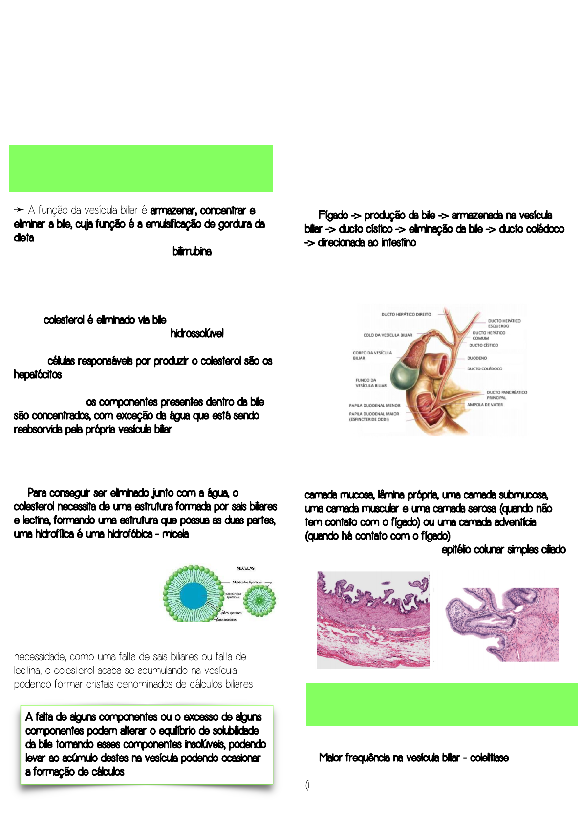 Camila Mariana Castro de Oliveira Medicina Nove de Julho PAtologia da vesícula biliar ➛ A função da vesícula biliar é armazenar, concentrar e eliminar a bile, cuja função é a emulsificação de gordura da dieta ➛ Um dos componentes da bile é a bilirrubina que pode ser indireta (não conjugada) e direta (conjugada), sendo esta a mais encontrada na vesícula biliar ➛ Junto da bile temos outros componentes liberados como os sais biliares, água e, principalmente, o colesterol ✓ O colesterol é eliminado via bile ✓ O colesterol é um componente hidrossolúvel, por isso não consegue ser eliminado através da urina ✓ As células responsáveis por produzir o colesterol são os hepatócitos ➛ A bile é drenada em direção a veia porta ➛ Composição: os componentes presentes dentro da bile são concentrados, com exceção da água que está sendo reabsorvida pela própria vesícula biliar Colesterol: ➛ Componente hidrofóbico ➛ Para conseguir ser eliminado junto com a água, o colesterol necessita de uma estrutura formada por sais biliares e lectina, formando uma estrutura que possua as duas partes, uma hidrofílica é uma hidrofóbica - micela ➛ A micela armazena o colesterol no meio protegido por uma camada hidrofóbica e uma camada hidrofílica, permitindo que assim ele seja eliminado junto da água ➛ Caso haja um aumento de colesterol e os outros componentes não supram essa necessidade, como uma falta de sais biliares ou falta de lectina, o colesterol acaba se acumulando na vesícula podendo formar cristais denominados de cálculos biliares Trajeto da bile: ➛ Produção: fígado ➛ Armazenamento: vesícula biliar ➛ Fígado -> produção da bile -> armazenada na vesícula biliar -> ducto cístico -> eliminação da bile -> ducto colédoco -> direcionada ao intestino ✓ O ducto colédoco se junta com o ducto pancreático principal que carrega outras substâncias juntando com a bile até a papila duodenal maior (esfíncter de oddi) Histologia: ➛ Na parede da vesícula biliar podemos encontrar uma camada mucosa, lâmina própria, uma camada submucosa, uma camada muscular e uma camada serosa (quando não tem contato com o fígado) ou uma camada adventícia (quando há contato com o fígado) ➛ O epitélio da vesícula biliar é epitélio colunar simples ciliado ➛ Doença mais comum das vias biliares ➛ Maior frequência na vesícula biliar - colelitiase ➛ Sintomas: processos obstrutivos e complicações (inflamação - colecistites) Patologia da vesicula biliar Introdução: A falta de alguns componentes ou o excesso de alguns componentes podem alterar o equilíbrio de solubilidade da bile tornando esses componentes insolúveis, podendo levar ao acúmulo destes na vesícula podendo ocasionar a formação de cálculos Litíase Biliar: Camila Mariana Castro de Oliveira Medicina Nove de Julho Natureza dos cálculos biliares: ➛ Colesterol: ✓ Originados na vesícula biliar ✓ Puros (concentrações crescentes de colesterol) ou mistos (colesterol + bilirrubinato de cálcio) ➛ Pigmentares: ✓ Originados na vesícula ou colédoco ✓ Composto principalmente por bilirrubinato de cálcio (pouco colesterol) Fatores de risco: ➛ Idade - predomínio a partir dos 40-50 anos ✓ Aumento da secreção do colesterol e redução da formação de sais biliares ➛ Sexo - mais frequente em mulheres ✓ Estrógeno - maior quantidade de estrógenos circulantes: maior secreção de colesterol na bile (maior captação e síntese) ➛ Obesidade e dislipidemia ✓ Maior secreção de colesterol na bile ➛ Perda rápida de peso ✓ Hipomotilidade da vesícula e maior secreção de colesterol ➛ Hereditariedade ✓ Histórico familiar, alteração genética que desequilibra a síntese e secreção dos componentes biliares ➛ Hemólise ✓ Maior quantidade de bilirrubina não conjugada na bile ➛ Doenças do íleo ✓ Diminuição da recaptação entérica de sais biliares Fisiopatogenia: Patogênese dos cálculos de colesterol: ➛ Ocorrem quando as concentrações de colesterol excedem a capacidade solubilizante dos sais biliares (supersaturação) e o colesterol gera núcleos em cristais sólidos de monoidrato de colesterol ✓ Formação de bile supersaturada de colesterol - redução de sais biliares e lecitina ✓ Hipomotilidade da vesícula biliar ✓ Nucleação e cristalização aceleradas - crescimento ✓ Hipersecreção de muco ➛ Os cálculos de colesterol surgem exclusivamente na vesícula biliar e classicamente são duros e amarelo-pálidos, os sais de bilirrubina podem conferir- lhes a coloração preta ➛ Quando compostos predominantemente de colesterol, são radiolucentes; a deposição de carbonato de cálcio em 10% a 20% dos cálculos é suficiente para torná-los radiopacos ➛ Os cálculos únicos são ovoides; cálculos múltiplos tendem a ser facetados Patogênese dos cálculos pigmentares: ➛ Maior quantidade de bilirrubina não conjugada na bile - mais comum devido a condições hemoliticas crônicas ➛ Precipitação da bilirrubina com sais de cálcio ✓ Pretos: mais associados a hemólise crônica ✓ Marrons: associados à infecções (beta-glicuronidase bacteriana) Quadro clínico: ➛ Aproximadamente 70% a 80% dos pacientes com cálculos biliares permanecem assintomáticos por toda a vida ➛ Os sintomas incluem dor espasmódica, em cólica, devido à passagem dos cálculos nos ductos biliares (os cálculos menores causam sintomas com mais frequência do que os maiores), dor em hipocôndrio direito (ponto de Murphy) ou epigástrica, podendo haver irradiação para o dorso, febre discreta, náuseas e inapetência ➛ Nos exames de imagem podemos identificar variações associadas ao tamanho e radiopacidade dos cálculos. Camila Mariana Castro de Oliveira Medicina Nove de Julho ➛ Complicações mais graves incluem empiema, perfuração, fístulas - icterícia, inflamação da árvore biliar (colangite), colestase obstrutiva ou