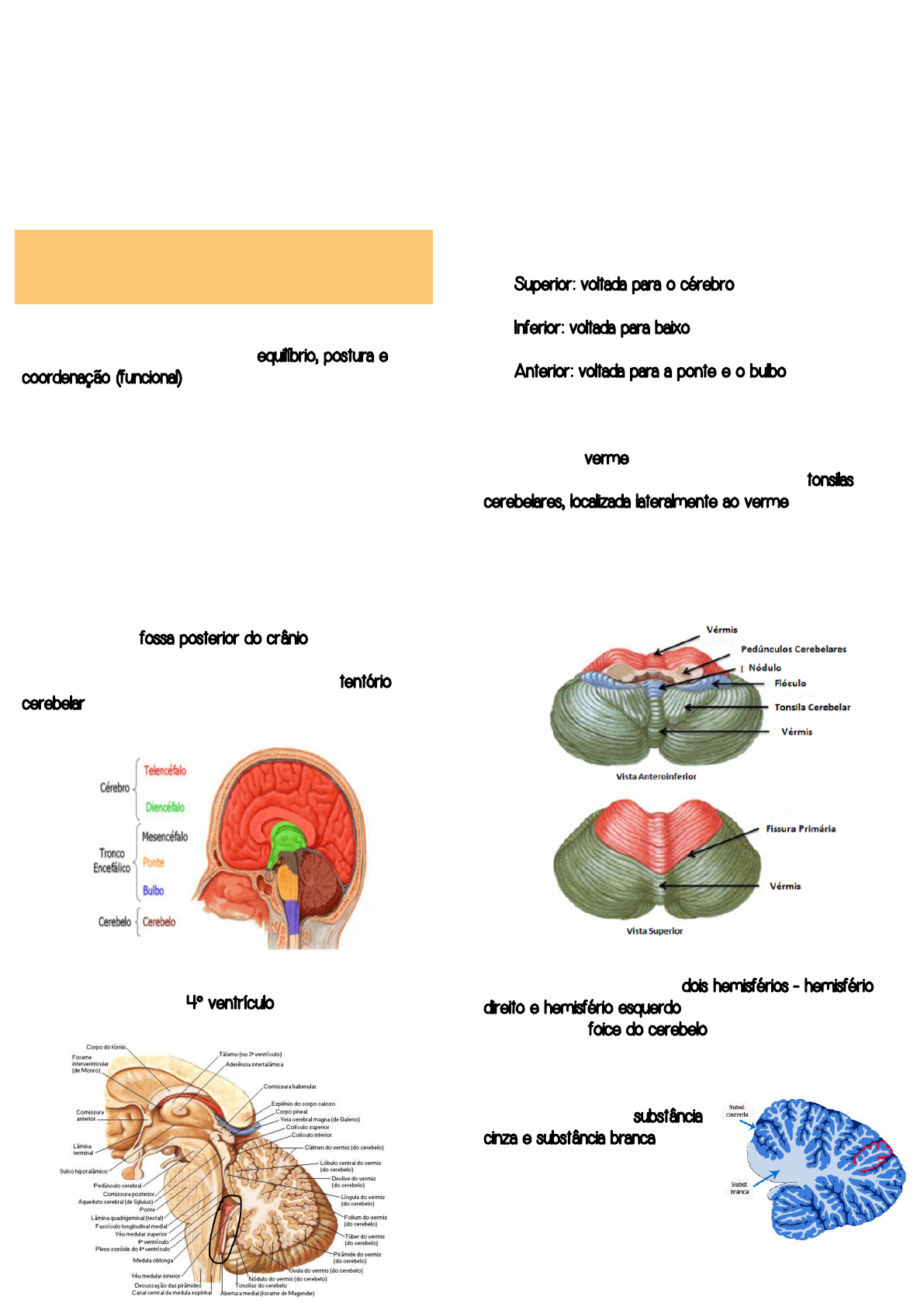 Camila Mariana Castro de Oliveira Medicina Nove de Julho Anatomia do cerebelo ➛ Cerebelo significa “cérebro pequeno” e suas principais funções estão relacionadas com o equilíbrio, postura e coordenação (funcional) ➛ Quando o cerebelo estiver afetado de alguma forma, pode ocorrer: ✓ Vertigem ✓ Perda de equilíbrio ✓ Comprometimento da postura ✓ Tônus muscular alterado ✓ Dificuldades na coordenação fina dos movimentos voluntários (planejamento e correção) ✓ Aprendizagem motora ✓ Funções não motoras ➛ O cerebelo pertence ao encéfalo ➛ Localizado na fossa posterior do crânio ✓ Posterior a ponte e ao bulbo ✓ Abaixo/Inferior ao cérebro (separado pelo tentório cerebelar) ➛ Entre a ponte, o bulbo e o cerebelo existe um espaço que recebe o nome de 4° ventrículo ➛ O cerebelo possui 3 faces: ✓ Superior: voltada para o cérebro - predominantemente retilínea (plana) ✓ Inferior: voltada para baixo - predominantemente arredondada (convexo) ✓ Anterior: voltada para a ponte e o bulbo (convexo) - Os pedúnculos cerebelares só são visíveis na vista anterior ➛ A região central do cerebelo que une os dois hemisférios é chamada de verme ✓ O cerebelo possui estruturas chamadas de tonsilas cerebelares, localizada lateralmente ao verme ✓ Se ocorrer uma herniadas dessas tonsilas, o bulbo pode ser comprimido (parte posterior) comprimindo assim a FC e a FR podendo causar uma parada respiratória e até levar a óbito ➛ O cerebelo é dividido em dois hemisférios - hemisfério direito e hemisfério esquerdo -> esses hemisférios são separados pela foice do cerebelo (prega de dura-máter) ✓ O direito controla o lado direito do corpo ✓ O esquerdo controla o lado esquerdo do corpo ➛ O cerebelo possui substância cinza e substância branca ✓ Substância cinza: localizada na região periférica -> chamada de “córtex cerebelar” ✓ Substância branca: localizada na região central -> Anatomia do cerebelo Generalidad: Camila Mariana Castro de Oliveira Medicina Nove de Julho chamada de “corpo medular ou centro branco medular” - A substância branca é composta por corpo medular e alguns núcleos cerebelares e também possui uma projeção de lâminas esbranquiçadas em direção ao córtex, recebendo o nome de “lâminas brancas do cerebelo” ➛ O cerebelo possui algumas dobras caracterizando as voltas do cerebelo denominadas de folhas e entre cada folha existe um espaço denominado de fissura Fissuras do cerebelo: ➛ As fissuras tem como objetivo demarcar a identificação dos 3 lobos do cerebelo ➛ As mais importantes são: ✓ Fissura prima -> localizada depois do cúlmen ✓ Fissura póstero-lateral -> localizada depois da úvula Lobos do cerebelo: ➛ Lobo rostral ou anterior: corresponde a área até a fissura prima ✓ Responsável por movimentos grotescos ➛ Lobo flóculo-nodular: responsável pelo equilíbrio ➛ Lobo caudal ou posterior: corresponde a área da fissura prima até a fissura póstero-lateral ✓ Responsável por movimentos finos ➛ Substância cinzenta: córtex do cerebelo ➛ Substância branca: corpo medular do cerebelo e lâminas brancas do cerebelo Núcleos centrais: ➛ Localizados na substância branca ➛ Divididos em: ✓ Núcleo do fastígio ou fastigial - relacionado com o equilíbrio ✓ Núcleos globosos - relacionado com a postura ✓ Núcleo emboliforme - relacionado com a postura ✓ Núcleo denteado - relacionado com a coordenação motora Anatomia interna: Camila Mariana Castro de Oliveira Medicina Nove de Julho Divisão filogenética: ➛ O cerebelo é dividido também em 3 regiões que correspondem com os lobos, sendo eles: ✓ Aquicerebelo: relacionado com o lobo flóculo nodular - equilíbrio ✓ Paleocerebelo: relacionado com o lobo anterior - posterior ✓ Neocerebelo: relacionado com o lobo posterior - coordenação dos movimentos Divisão funcional: ➛ É uma divisão longitudinal ✓ Zona medial: onde estão localizados o núcleos fastigiais e também onde está localizado o verme ✓ Zona intermédia: onde estão localizados o núcleo interpósito e por estar lateralmente ao verme pode ser chamada de paravermiana ✓ Zona lateral: onde está localizado os núcleos denteados e os hemisférios ➛ Formadas por 3 camadas: ✓ Molecular - Axônios da célula granular - Células em cesto: inibe a célula de purkinje - Células estrelada: inibe a célula de purkinje ✓ Purkinje - Célula de purkinje: inibe o núcleo cerebelar (eferência) ✓ Granular - Célula granular: excitatoria de celular de purkinje - Célula de golgi: inibe a célula granular Aferência: ➛ Entrada de informações no cerebelo ➛ Estimula/Excita o núcleo e depois busca o córtex cerebelar ➛ Fibras trepadeiras: aferentes e excitatória ✓ Sua ação vem do complexo olivar ✓ Faz o aperfeiçoamento ✓ Excita os núcleos e os dendritos das células de purkinje que inibem os núcleos ✓ Dosagem (excitação e inibição): movimento de excitação e inibição Hiologia do cerebelo: Conexõ do cerebelo: Camila Mariana Castro de Oliveira Medicina Nove de Julho ➛ Fibras musgosas: aferentes e excitatória - entra no cerebelo, vai até a camada granular e excita a célula granular, a célula granular excita todas as células da camada molecular (estrelada, golgi, em cesto, purkinje), a célula de golgi ao ser excitada inibe a célula granular, a célula em cesto e a estrelada inibem a célula de purkinje quando são excitadas ✓ Excita (sinapse) células granulares na camada granular ✓ Dos nervos vestibulares: fasc. Vestíbulo-cerebelar ✓ Da medula: tronco espino-cerebelar anterior e posterior ✓ Da ponte: fibras ponto-cerebelares Eferência: ➛ Saída de informações do cerebelo ➛ A eferência parte sempre de um núcleo e esse núcleo está sendo inibido pela célula de purkinje ✓ Zona medial: fibras fastígio-vestibulares (trato vestibulo- espinhal) e fibras fastígio reticulares (trato r