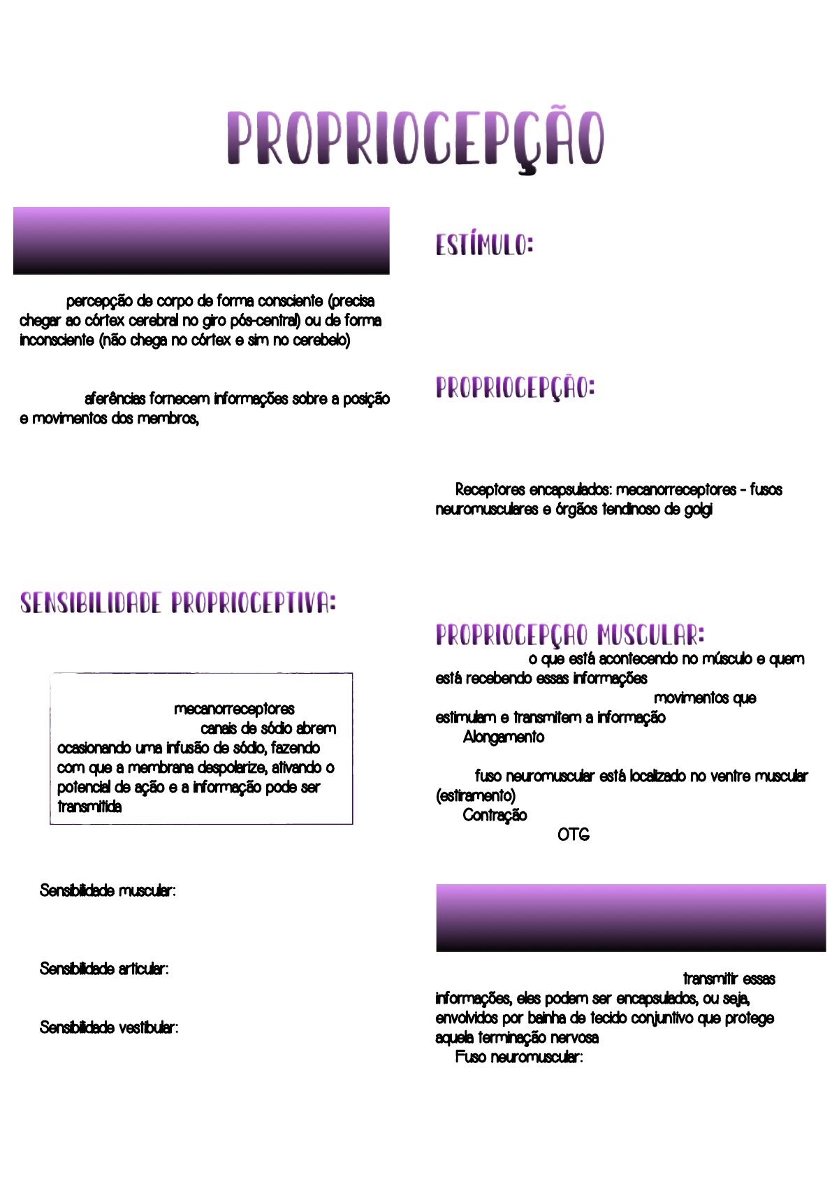 Camila Mariana Castro de Oliveira Medicina Nove de Julho Propriocepção ➛ É a percepção de corpo de forma consciente (precisa chegar ao córtex cerebral no giro pós-central) ou de forma inconsciente (não chega no córtex e sim no cerebelo) ➛ A propriocepção designa as aferências sensoriais originadas em músculos e articulações ✓ Essas aferências fornecem informações sobre a posição e movimentos dos membros, permitindo que o sistema nervoso tenha uma noção do nosso corpo no espaço ➛ Detectada por receptores especiais em ventres musculares, tendões musculares, cápsulas articulares e ligamentos ➛ Informações veiculado da periferia para o SNC por neurônios sensitivos somáticos (fibras aferentes somáticas gerais) SENSIBILIDADE PROPRIOCEPTIVA: ➛ É a sensibilidade que fornece as informações para o SN, seja consciente ou inconsciente ➛ É uma noção geral e pode ser separada em muscular, articular e vestibular ➛ Sensibilidade muscular: formada por comprimentos de fibras musculares e força de contração ✓ É captado pelos receptores denominadas de fuso neuromuscular/OTG ➛ Sensibilidade articular: responsável pela detecção da posição articular e movimentos articulares ✓ É captado por receptores articulares ➛ Sensibilidade vestibular: responsável pelas informações sobre a posição, movimentos lineares e angulares da cabeça ✓ Receptores especiais localizados no aparelho vestibular - orelha interna Estímulo: ➛ São as informações que recebemos para transformar o movimento em potencial de ação ➛ Em cada movimento há uma informação detectada, transmitindo os potenciais de ação até os terminais nervosos Propriocepção: ➛ Localização dos corpos celulares nos neurônios periféricos - gânglio da raiz dorsal (gânglio sensitivo) ✓ Exceção: núcleo mesencefalico do trigêmeo ➛ Neurônios pseudounipolares ➛ Receptores encapsulados: mecanorreceptores - fusos neuromusculares e órgãos tendinoso de golgi ➛ Axônio de grande diâmetro e espessa bainha de mielina ➛ Rápida condução - maior velocidade de propagação do impulso nervoso (propriocepção, tato discriminativo e sensação vibratória) Propriocepçao muscular: ➛ Representa o que está acontecendo no músculo e quem está recebendo essas informações ➛ Movimentos musculares: são os movimentos que estimulam e transmitem a informação ✓ Alongamento: responsável pelo aumento do comprimento muscular, por exemplo, o fuso neuromuscular - O fuso neuromuscular está localizado no ventre muscular (estiramento) ✓ Contração: é a tensão muscular - Por exemplo, o OTG (órgão tendinoso de golgi) - O OTG se localiza no tendão muscular ➛ São os receptores responsáveis por transmitir essas informações, eles podem ser encapsulados, ou seja, envolvidos por bainha de tecido conjuntivo que protege aquela terminação nervosa ➛ Fuso neuromuscular: formado por células musculares que detectam o grau de estiramento do músculo, é um receptor encapsulado Propriocepcao Introdução: Esses receptores de sensibilidade proprioceptiva são mecanorreceptores, ou seja quando estimulados, os canais de sódio abrem ocasionando uma infusão de sódio, fazendo com que a membrana despolarize, ativando o potencial de ação e a informação pode ser transmitida Mecanoeceptor: Camila Mariana Castro de Oliveira Medicina Nove de Julho ➛ Órgão neurotendineo (OTG): são terminações nervosas sensitivas intercaladas as fibras colagenas da tensão que detectam o nível de tensão (contração) muscular, é um receptor encapsulado ➛ Receptores articulares: são mecanorreceptores localizados nas articulações (principalmente na cápsula articular das articulações sinoviais) auxiliando na localização angular dos membros Fuso neuromuscular: ➛ Exemplo de macanorreceptor que fornece informações sobre o estiramento do ventre muscular de músculos estriados esqueléticos ➛ Encapsulado - cápsula protetora de tecido conjuntivo ➛ Possui um líquido rico em sódio - facilita o influxo de sódio provando a despolarização quando a fibra é estirada (terminal anulo-espiral) ➛ Por ele ser encapsulado, apresenta-se enrolado em uma fibra (terminal intrafusais - sensores) ✓ Todas as outras fibras fora da cápsula protetora, não pertencem ao fuso neuromuscular e então são chamadas de fibras extrafusais (realizam contração e geram tensão) ✓ Quando os músculos sofrem estiramento essas fibras extrafusais se despolarizam ➛ Reflexo miomático: é a garantia da manutenção da tensão, uma resposta de defesa quando está esticando demais - contração ➛ Há dois tipos de fibras intrafusais: ✓ Fibra do saco nuclear: localizadas na porção central do fuso, contém um agregado de núcleos sitiados numa região média de célula mais alargada ✓ Fibra de cadeia nuclear: localizadas na porção lateral do fuso, apresenta numerosos núcleos dispostos em fileiras ➛ Há dois tipos de fibras nervosas aferentes: ✓ Fibras 1A: é uma fibra sensitiva que capta as informações do fuso neuromuscular, responsável pela informação da velocidade e direção do movimento - Terminações dispostas na porção média de ambas as células, informação da velocidade e direção do movimento ✓ Fibras 2: responsável pela informação da posição estática do membro - Terminações dispostas nas extremidades de ambas as células, informações da posição estática do membro ➛ Há dois tipos de fibras nervosas motoras: ✓ Fibra motora alfa: é a fibra motora que atua para que haja contração das fibras extrafusais ✓ Fibra motora gama: é a fibra motora que atua para que haja contração das fibras intrafusais - somente nas regiões periféricas Órgão neurotendíneo (OTG): ➛ Receptor encapsulado ➛ Exemplo de mecanoreceptor encontrado no tendão muscular e que responde ao aumento de tensão sobre o Coativação alfa-gama: ambos precisam ser ativados p