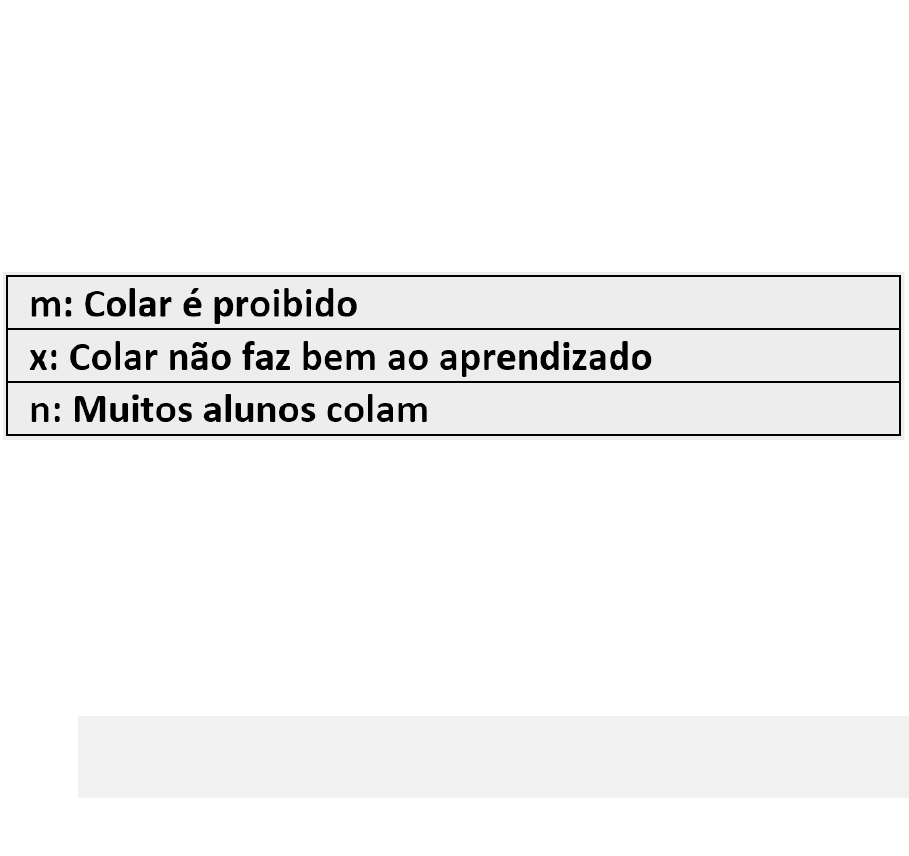 3. A cola não autorizada é um problema existente em muitas salas de aula, e a pessoa mais prejudicada nesse processo é o aluno. Com a cola, os dados para a análise do professor são distorcidos, pois ele verifica, com base nos dados da avaliação, onde estão os pontos ainda não desenvolvidos pela turma, para, assim, preparar estratégias que desenvolvam as habilidades que ainda apresentaram dificuldades. Considere o problema da cola representado nas sentenças abaixo: a) Colar é proibido, mas muitos alunos colam. b) Colar não é proibido e faz bem ao aprendizado. As sentenças acima podem ser representadas através de proposições e conectivos lógicos. Considere também que m, x e n representem as proposições listadas na tabela a seguir: Com base nas proposições acima, os conectivos estudados e considerando a notação introduzida na Unidade de Aprendizagem, analise e julgue as alternativas apresentadas abaixo: I - A sentença aa pode ser corretamente representada por m ^ (~ n). II - A sentença b pode ser corretamente representada por (~ m) ^ (~ x). III - A sentença a pode ser corretamente representada por m ^ n. IV - A sentença b pode ser corretamente representada por (~ m) v ( x). Assinale a alternativa correta. D. II e III. A alternativa II está correta. A negação da proposição x que representa “Colar não faz bem ao aprendizado” será “Colar faz bem ao aprendizado”. A alternativa III está correta, é uma proposição composta com o conectivo “e”.