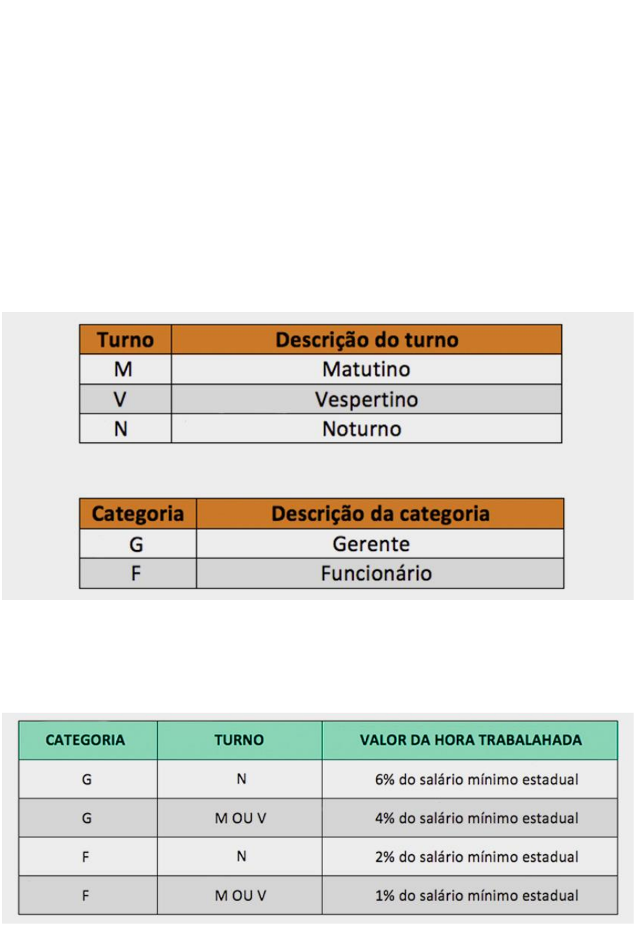 Desafio Comandos condicionais de múltipla escolha (pseudocódigo) Sabendo que uma rede hoteleira deseja informatizar sua folha de pagamento, desenvolva em pseudocódigo uma solução conforme regras apresentadas pela empresa, de acordo com as especificações abaixo: O funcionário possui os seguintes dados de entrada: código, número de horas trabalhadas no mês, turno de trabalho (M – matutino, V – vespertino ou N – noturno), categoria (F – funcionário, G – gerente). Faça um algoritmo que: - Leia as informações dos funcionários: código (inteiro), número de horas trabalhadas (inteiro) no mês, turno (caractere) e categoria (caractere). Não leia somente o valor da hora trabalhada (real), pois será calculada. - Considere sempre a digitação de uma única letra para representar o turno de trabalho e a categoria do funcionário, conforme as tabelas: - Calcule o valor da hora trabalhada, conforme as regras apresentadas na tabela a seguir. O valor do salário mínimo deve ser solicitado pelo algoritmo, pois ele varia de estado para estado e a rede de hotéis está distribuída por todo o País. Utilizar o comando de seleção múltipla (ou um comando escolha e outro pode ser se encadeado – não utilizar se simples para esse item) para testar a categoria e o turno para calcular o valor da hora trabalhada. - Calcule o salário inicial do funcionário com base no valor da hora trabalhada e no número de horas trabalhadas. - Calcule o valor do auxílio-alimentação recebido pelo funcionário de acordo com seu salário inicial, conforme a tabela a seguir. Utilizar o comando de seleção composto encadeado. - Imprima como saída o código, número de horas trabalhadas, valor da hora trabalhada, salário inicial, auxílio alimentação e salário final (salário inicial + auxílio-alimentação). a) Represente uma solução no VisuAlg para o problema descrito em forma de pseudocódigo para simular a folha da empresa. Entregue o arquivo .alg desenvolvido. b) Realize o teste de mesa para as seguintes entradas: Com salário mínimo de R$ 780,00 Padrão de resposta esperado a) Represente uma solução para o problema descrito em forma de pseudocódigo para simular a folha da empresa. b) Realize o teste de mesa para as seguintes entradas: Com salário mínimo de R$ 780,00 Desafio Comandos condicionais de múltipla escolha (pseudocódigo)