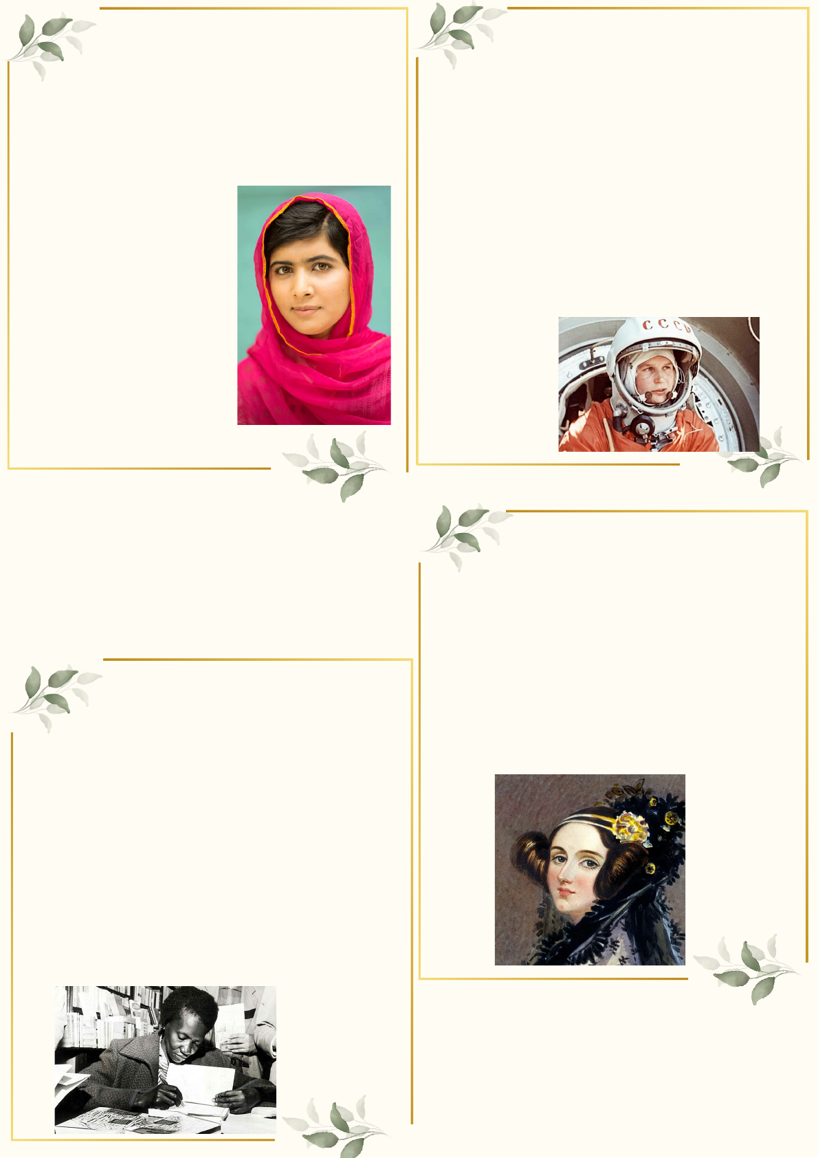 Mulheres que mudaram o mundo Malala Yousafzai, nascida em 1997, é uma militante dos direitos das crianças e da educação, uma jovem paquistanesa que foi baleada pelo Talibã por defender o direito das meninas de irem à escola. Em 2008, com 11 anos, Malala já defendia em seu blog o direito das meninas de frequentar a escola. Com 12 anos, para continuar indo à escola, escondia o uniforme dentro da mochila para não ser atacada e espancada no caminho. Com 17 anos, foi a mais jovem ganhadora do Prêmio Nobel da Paz. Mulheres que mudaram o mundo "Valentina Tereshkova foi uma cosmonauta soviética que ficou conhecida como a primeira mulher a ir ao espaço. Ela tripulou a Vostok 6, em 1963, permanecendo no espaço por 71 horas e realizando 48 voltas na Terra." "Tereshkova era uma operária que fazia parte do Partido Comunista da União Soviética. Além disso, ela era paraquedista amadora e realizava saltos com grande frequência, sendo seu primeiro salto feito quando ela tinha 22 anos. Até março de 1962, Tereshkova tinha feito mais de 120 saltos." "Carolina Maria de Jesus (1914-1977) foi uma escritora, compositora e poetisa brasileira, mais conhecida por seu livro Quarto de Despejo: Diário de uma Favelada, publicado em 1960. Carolina de Jesus foi uma das primeiras escritoras negras do Brasil e é considerada uma das mais importantes escritoras do país. A autora viveu boa parte de sua vida na favela do Canindé, na Zona Norte de São Paulo. Em 1958, tem seu diário publicado com auxílio do jornalista Audálio Dantas. O livro fez um enorme sucesso e chegou a ser traduzido para catorze línguas Ada Lovelace (1815-1852) nasceu em Londres e no século XIX, em 1842, desenhou o primeiro algoritmo usado por uma máquina analítica, uma calculadora. O feito possibilitou que, hoje, diversas tarefas sejam realizadas em um computador ao mesmo tempo. O método criado por ela é considerado o primeiro programa de computador do mundo. Mulheres que mudaram o mundo Mulheres que mudaram o mundo https://pt.wikipedia.org/wiki/Lista_de_favelas_da_cidade_de_S%C3%A3o_Paulo#Canind%C3%A9 https://pt.wikipedia.org/wiki/Zona_Norte_de_S%C3%A3o_Paulo https://pt.wikipedia.org/wiki/Aud%C3%A1lio_Dantas Mulheres que mudaram o mundo Frida Kahlo (1907-1954) nasceu no México. Teve uma vida marcada por paixões, dor, sofrimento e perseverança. Aos 18 anos sofreu um acidente que a fez ficar muito tempo de cama, passando por 30 cirurgias. Mesmo nessas condições Frida começou a pintar. Ela pintava autorretratos com base na visão que tinha a partir de um espelho em sua cama, pois dizia que queria pintar o que via com os próprios olhos, ou seja, algo que ela conhecia totalmente. Frida retratava sua vida em suas telas sempre com cores fortes e traços marcantes, características únicas das obras de Kahlo. Mulheres que mudaram o mundo Maria Quitéria (1792-1853) foi a primeira mulher a fazer parte do exército brasileiro. A baiana fingiu ser homem para poder entrar nas Forças Armadas que lutavam contra os portugueses em 1822, durante a Independência do Brasil. Ela utilizou o nome de seu cunhado, soldado Medeiros, já que somente homens faziam parte do Exército. Semanas depois de entrar para o Exército, Maria Quitéria teve sua identidade revelada. No entanto, o major Silva e Castro não permitiu que ela saísse das tropas, já que era importante para a luta contra os portugueses por sua facilidade com o manejo de armas e sua disciplina em batalha. "Amélia Earhart (1897-1939) nasceu no Kansas, EUA. Nas décadas de 1920 e 1930, Earhart alcançou vários recordes, por ter sido a mulher a voar a maior altitude e a maior velocidade. Acima de tudo, porém, foi a primeira mulher a atravessar o Atlântico. Em 1937, decidiu ser a primeira mulher a dar a volta ao mundo. A sua viagem não seria a primeira travessia aérea à volta do mundo – feito realizado por uma equipa norte-americana em 1924 –, mas a mais longa: uma extenuante rota de 47.000 quilómetros, nas proximidades do equador. Entretanto, os aviadores nunca chegaram ao seu destino, em 1939 Amélia foi declarada morta. Maria Anna Mozart (1751-1829) nasceu na Áustria. Era irmã mais velha do famoso músico e compositor Mozart. Nannerl, como ela era conhecida também foi uma musicista, era um prodígio no piano e se apresentava com seu irmão. Mas quando ela completou 18 anos, apresentar-se em público passou a ser uma coisa que não era socialmente aceitável. Enquanto seu irmão saia em turnês, ela era deixada em casa para costurar e procurar um marido. Mozart se tornou um dos músicos mais renomados do mundo e se inspirou muito em sua irmã, compondo peças musicais para ela. Mulheres que mudaram o mundo Mulheres que mudaram o mundo Mulheres que mudaram o mundo Dona Ivone Lara (1921-2018) foi uma cantora e compositora brasileira. Conhecida como Rainha do Samba e Grande Dama do Samba ela foi a primeira mulher a assinar um samba-enredo e a fazer parte da ala de compositores de uma escola, a Império Serrano, revolucionando o universo machista do samba. Também criou inúmeros clássicos do samba de raiz inspirados no cotidiano popular e conquistou respeito e reverência da MPB ao longo dos 96 anos de vida. Mulheres que mudaram o mundo Dandara dos Palmares (1654-1694) foi uma guerreira negra do período colonial do Brasil. Zumbi dos Palmares foi seu marido e juntos eles lutavam contra o domínio português no Quilombo (local formado pelos negros fugidos da escravidão), situado onde hoje é o estado do Alagoas. Dandara dominava técnicas da capoeira e lutou ao lado de homens e mulheres nas muitas batalhas consequentes a ataques ao Quilombo de Palmares. Após ser presa, cometeu suicídio se jogando de uma pedreira ao abismo para não retornar à condição de escrava. June Almeida (1930-2007) foi uma virologista nascida na Escócia e que descobriu o primeiro coronavírus em 1964, em seu laboratório no hospital St. Thomas, em Londres. Entretanto, nessa época, q