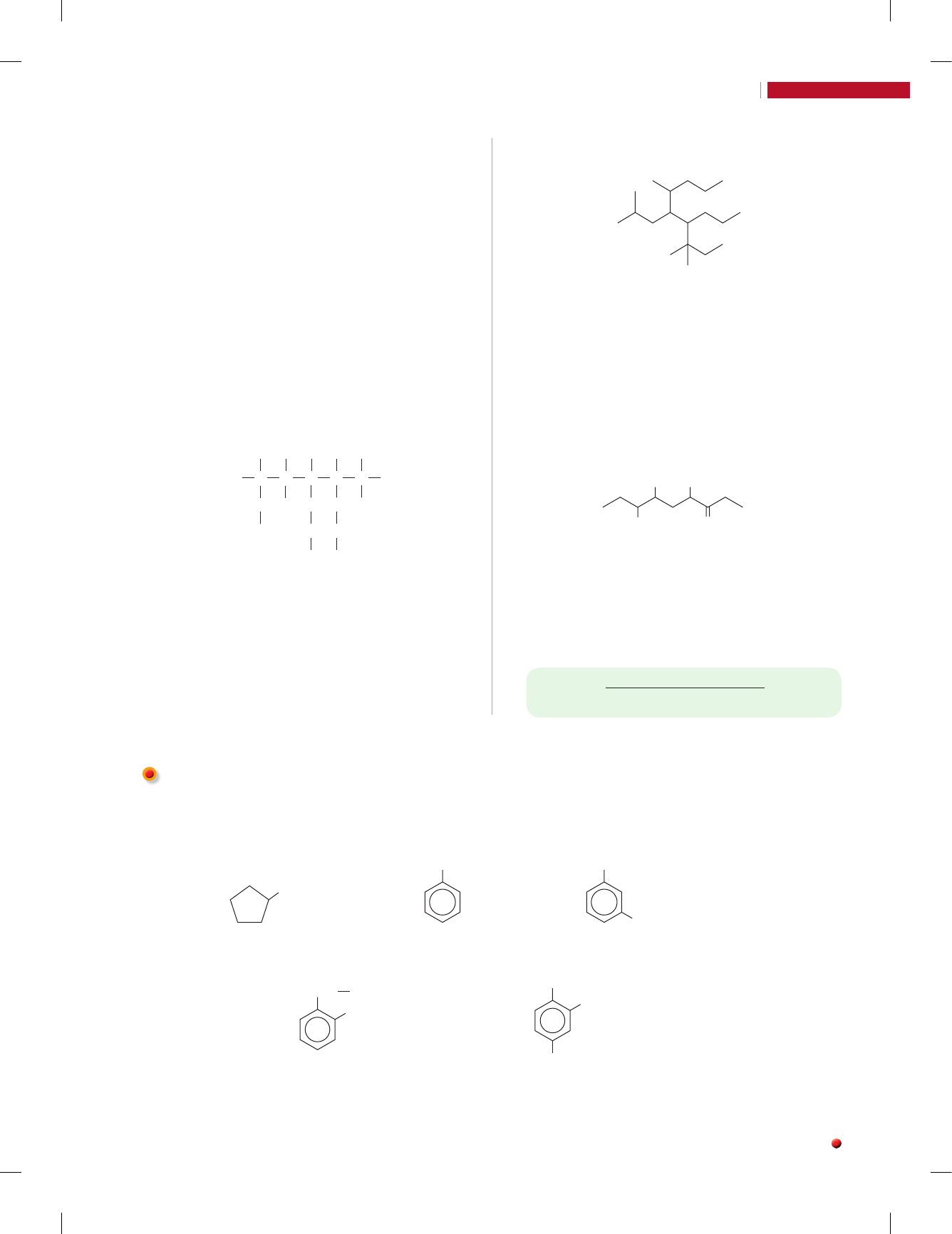 Capítulo 1 Introdução à Química dos compostos de carbono 45 R ep ro d uç ão p ro ib id a. A rt . 1 84 d o C ód ig o P en al e L ei 9 .6 10 d e 19 d e fe ve re iro d e 19 98 . m Comentário dos autores: A simbologia me representa um grupo metil. o nome oficial (nomenclatura IUPAC) é: a) 2,3-dimetilpentano. b) 1,1,2-trimetil butano. c) 2,metil-3-etilbutano. d) 2,etil-3-metilbutano. e) 1,1-dimetil-2-etil-propano. 72. (Uesb-BA) O número de átomos de carbono na cadeia do 2,2,3-trimetilpentano é: a) 2 b) 3 c) 4 d) 7 e) 8 73. (UFSM-RS) CH3C CH3 H C H H C H C H C H H CH2 CH3 CH2 CH2 CH3 CH2 CH2 CH3 Segundo a IUPAC, o nome correto do alcano apre- sentado é: a) 3-metil-5-propil-6-etiloctano. b) 4-etil-7-metil-5-propilnonano. c) 3-metil-6-etil-5-propilnonano. d) 6-etil-5-propil-3-metiloctano. e) 7-etil-7-metil-6-etilnonano. 74. (UFF-RJ) Analise a estrutura abaixo e considere as regras de no menclatura da IUPAC. 9.6 Nomenclatura de hidro car bo ne tos de cadeia mista Quando um hidro car bo ne to pos sui cadeia car bô ni ca mista, a nomen cla tu ra é feita de um modo similar ao que mos tra mos para as cadeias aber tas rami fi ca das. Veja os exemplos: CH3 metil-ciclo-pentano 1,3-dimetil-benzenometil-benzeno (trivial: tolueno) CH3 CH3 CH3 1 3 CH2 CH3 1 CH3 2 1-etil-2-metil-benzeno (ordem alfabética: e antes de m) CH3 1 CH3 2 4 CH3 1,2,4-trimetil-benzeno Determine a opção que indica as cadeias laterais liga- das, respectivamente, aos carbonos de números 4 e 5 da cadeia hidrocarbônica principal. a) propil e isobutil d) propil e terc-pentil b) metil e isobutil e) metil e propil c) terc-pentil e terc-butil 75. (UFRGS-RS-modificado) A serricornina, utilizada no controle do caruncho-do-fumo, é o feromônio sexual da Lasioderma serricorne. Considere a estrutura química desse feromônio. OOH Me Me A cadeia dessa estrutura pode ser classificada como: a) acíclica, normal, heterogênea e saturada. b) alifática, ramificada, homogênea e insaturada. c) alicíclica, ramificada, homogênea e saturada. d) acíclica, ramificada, homogênea e saturada. e) alifática, normal, homogênea e saturada. 46 9.7 Uso dos pre fi xos orto, meta e para Quando uma molé cu la com um anel benzênico con tém dois gru pos liga dos a esse anel, além da manei ra de dar nome que aca ba mos de ver, exis te outra, igual men te cor re ta. Tratase do uso dos pre fi xos orto, meta e para. Os prefixos orto, meta e para podem ser utilizados apenas quando um anel benzênico possuir dois grupos a ele ligados: • orto indica posição 1,2; • meta indica posição 1,3; • para indica posição 1,4. CH3 CH3 meta-dimetil-benzenoorto-dimetil-benzeno (trivial: orto-xileno) (trivial: meta-xileno) (trivial: para-xileno) CH3 CH3 CH3 CH3 para-dimetil-benzeno C2H5 CH3 orto-etil-metil-benzeno No exemplo ao lado, k C2H5 é uma maneira resumida de representar o grupo etil, k CH2k CH3 9.8 Subdivisões dos aromáticos Os hidrocarbonetos aromáticos costumam ser subdivididos em: a) Mononucleares ou monocíclicos: aqueles com apenas um anel benzênico. Exemplos: CH3 toluenobenzeno antracenonaftaleno fenantreno • Com anéis condensados CH2 CH2 b) Polinucleares ou policíclicos: aqueles com dois ou mais anéis benzênicos. Entre eles, há os polinucleares com anéis isolados e os com anéis condensados. Veja os exemplos: • Com anéis isolados CH3 CH3 meta-dimetil-benzenoorto-dimetil-benzeno (trivial: orto-xileno) (trivial: meta-xileno) (trivial: para-xileno) CH3 CH3 CH3 CH3 para-dimetil-benzeno C2H5 CH3 orto-etil-metil-benzeno No exemplo ao lado, k C2H5 é uma maneira resumida de representar o grupo etil, k CH2k CH3 • Atenção Benzeno, tolueno e naftaleno causam irritação nos olhos e vias respiratórias, além de dores de cabeça, tontura e náuseas. TÓXICOS R ep ro d uç ão p ro ib id a. A rt . 1 84 d o C ód ig o P en al e L ei 9 .6 10 d e 19 d e fe ve re iro d e 19 98 . Benzeno Tolueno Naftaleno TÓXICOS a d il so n s ec c o