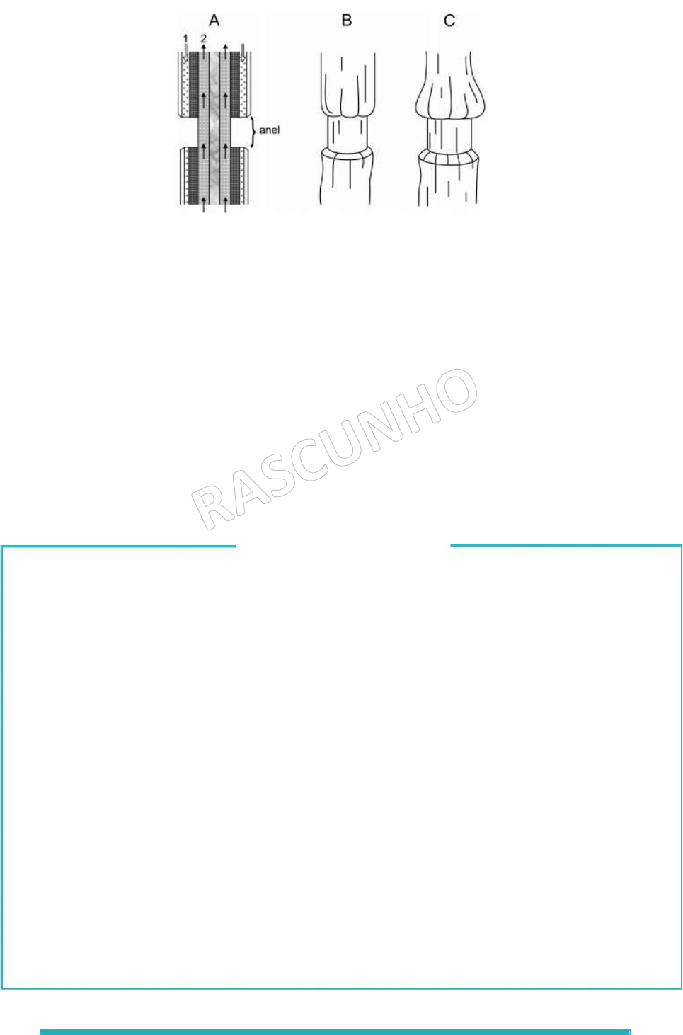 111 89. (Uel) As figuras a seguir ilustram a prática conhecida como Anel de Malpighi. Essa prática consiste na retirada de um anel contendo alguns tecidos do caule ou dos ramos de uma árvore. Em A, está representado o movimento da condução de seiva, em B, o caule principal da planta após a retirada do anel e, em C, o aspecto apresentado pelo caule principal após algumas semanas. Com base nas figuras, responda aos itens a seguir. a) Qual a função dos tecidos representados pelos números 1 e 2 em A? Em C, o que ocorrerá com a planta após algum tempo e por quê? b) O anel de Malpighi interfere no fluxo em massa de solutos. Como ocorre esse fluxo em massa? Resolução e Respostas Definitivas