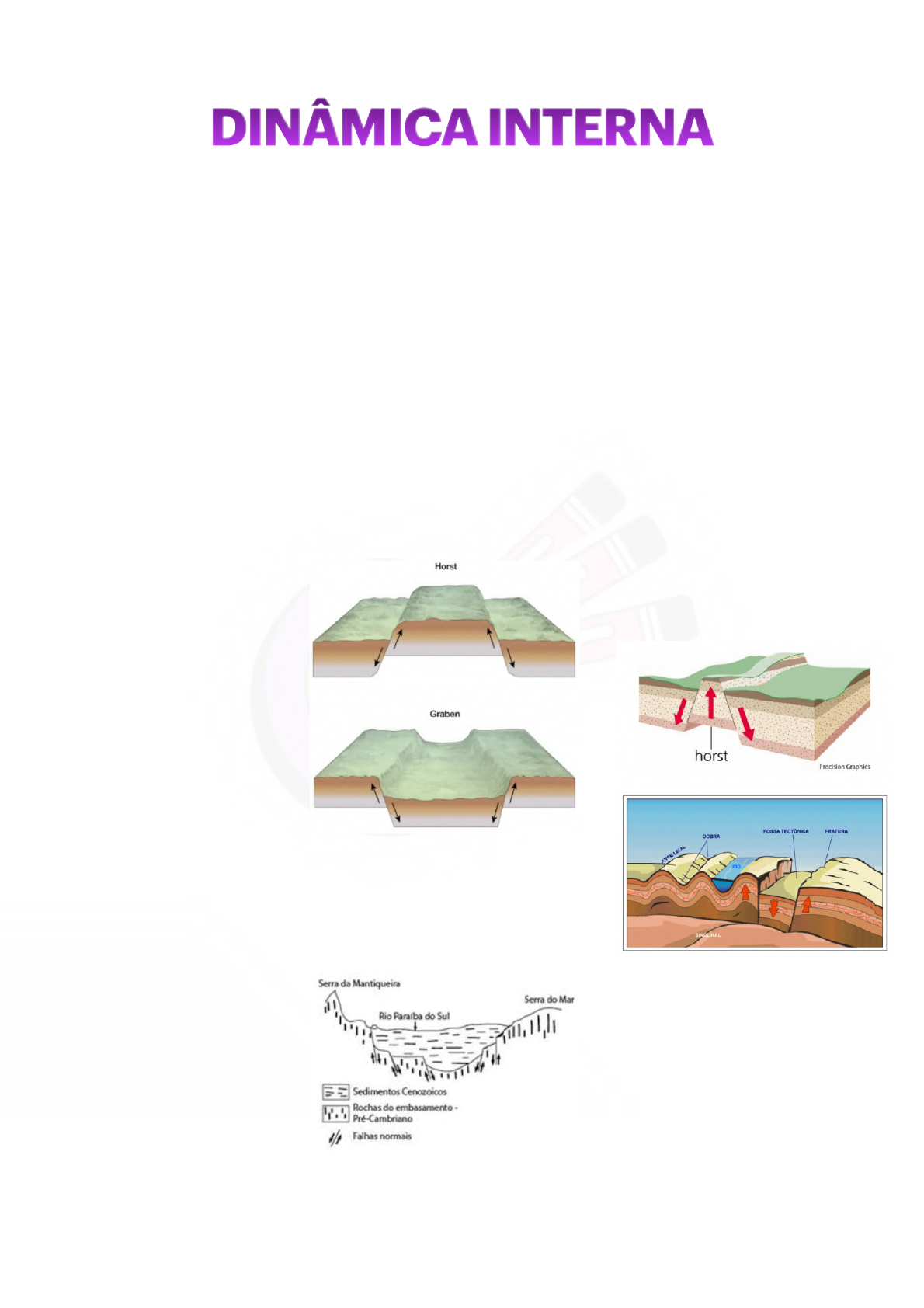 @vestibularesumido 11 • Refere-se aos agentes endógenos: tectonismo, vulcanismo e os terremotos. • O tectonismo ou diastrofismo atuam de forma lenta e prolongada na superfície da Terra, manifestando por meio da epirogênese (processo de grandes amplitudes, subida ou descida de grandes áreas da crosta terrestre) ou orogênese (de curta duração geológica, mas de grande intensidade, gerando dobramentos, fraturas e falhas que formarão as montanhas). • O vulcanismo é a atividade de expulsão do material magmático do interior da crosta terrestre para a superfície. • O Brasil foi palco de diversas atividades vulcânicas, sendo que a mais recente ocorreu na Era Cenozóica (Terciário) levando à formação das nossas ilhas oceânicas, como a de Fernando de Noronha. • Na região Sul, durante a Era Mesozóica, houve um dos maiores derrames basálticos do mundo, originando o solo fértil denominado terra roxa. • A maior parte dos vulcões existentes do mundo (80%) está concentrada na região denominada Círculo de Fogo do Pacífico. • Os gêiseres correspondem a jatos intermitentes e periódicos de água a elevadas temperaturas, típicos de algumas regiões vulcânicas. A água expelida tem origem nas caldas freáticas, que se localizam próximas da bolsa magmática. • Epicentro é a região da superfície terrestre, por cima do hipocentro, onde é máxima a intensidade de um abalo sísmico e onde este atinge, em primeiro lugar, a superfície do solo.Hipocentro é a região do interior da Terra onde se origina um sismo; foco sísmico. DINÂMICA INTERNA • O vulcanismo intraplaca é responsável pela formação dos HotSpots (pontos de anomaliatermalnointeriordaTer ra, ligados a sistemas de convecção do manto e responsáveis pelo vulcanismo que ocorre no interior de placas tectônicas). - HotSpots em regiões oceânicas-> escoamento de lava basáltica. - HotSpots em regiões continentais->tipo explosivo. Horst brasileiro: Serra da Mantiqueira e Serra do Mar Gabren brasileiro: vale do rio Paraíba @vestibularesumido 12 Estruturas geológicas: corresponde à base rochosa sobre a qual se assentam as formas de relevo. Encontra-se na Terra os escudos cristalinos,as bacias sedimentares e os dobramentos modernos. • Escudos cristalinos: foram formados na Era Pré- Cambriana e são constituídos por rochas cristalinas ou por rochas metamórficas bastante antigas, como o gnaisse. • Correspondem aos terrenos mais antigos pelos processos erosivos. E abrigam grandes reservas de minerais metálicos, tais como minério de ferro, ouro, manganês, bauxita, entre outros. • Bacias sedimentares: correspondem às áreas côncavas existentes no embasamento cristalino recobertas por sedimentos de diferentes origens que foram transportados e depositados ao longo do tempo geológico. São estruturas geológicas marcadas pela presença de combustíveis fosseis (petróleo, gás natural, xisto, etc) e minerais não metálicos, como o calcário o sal- gema. • Dobramentos modernos: tiveram origem no entrechoque de placas. • Essas regiões correspondem aos terrenos mais recentes, produzidos pela tectônica das placas e, por isso, instáveis, nos quais predominam uma intensa atividade sísmica e vulcanismos. O Himalaia é um dos mais conhecidos dobramentos modernos do mundo. • Coluna geológica: história da evolução terrestre. Divide-se em escala relativa do tempo, sequência estratigráfica e escala absoluta de tempo; considera a radioatividade natural de determinados elementos químicos. A Terra possui cerca de 4,5 bilhões de anos e a história da mesma é dividida em Éons, Eras, Períodos, Épocas, Idades e Fases. ESTRUTURAS GEOLÓGICAS E COLUNA GEOLÓGICA • Estrutura geológica do Brasil: o território brasileiro está localizado no centro da Placa Tectônica Sul-Americana. E é formada por escudos cristalinos/crátons e por bacias sedimentares. - escudos cristalinos: correspondem a 36% da área territorial. São constituídos por rochas magnéticas intensivas e rochas metamórficas. As estruturas cristalinas brasileiras apresentam grande importância econômica, pois nelas se encontram as principais jazidas de minerais metálicos, como no caso do Quadrilátero Ferrífero (MG), da Serra dos Carajás (PA), do Maciço do Urucum (MS), etc. - bacias sedimentares: cobrem 64% da área total do território brasileiro. Sua importância econômica está ligada à presença de recursos minerais energéticos, como o petróleo e o carvão mineral. Ex.: Bacia Amazônica, do Paraná, do Pantanal Mato- Grossense, etc. • rochas magmáticas: resultam da consolidação e da cristalização do magma. Tipos: intrusiva ou plutônicas (são rochas que se resfriam lentamente, como granito, feldspato, etc) e extrusivas ou vulcânicas (seu arrefecimento é rápido, como o basalto). • rochas sedimentares: compostas por sedimentos transportados pela água e pelo vento, podendo ser pelos seguintes processos, deposição dos materiais de origem biológica ou precipitação de substâncias em solução. • rochas metamórficas: surgem quando as altas temperaturas e pressões do interior da Terra atuam em qualquer outro tipo de rocha, alterando sua constituição. O estudo dessa rochas permite a identificação de grandes eventos geotectônicos.