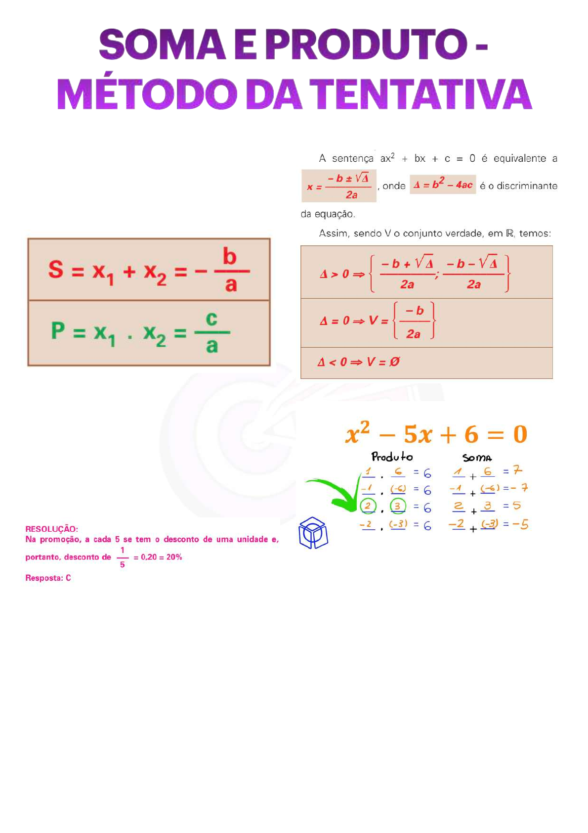 @vestibularesumido 19 SOMA E PRODUTO - MÉTODO DA TENTATIVA Soma e produto: S = a soma das duas raizes P = produto das duas raizes (MODELO ENEM) – As promoções do tipo “leve 5 e pague 4”, ou seja, levando-se um conjunto de 5 unidades, paga-se o preço de 4, acenam com um desconto sobre cada conjunto vendido de: a) 10% b) 15% c) 20% d) 25% e) 30% @vestibularesumido 20 PROBLEMAS DE 1º E 2º GRAUS (MODELO ENEM) – A soma dos gastos efetuados por um município para erradicar as doenças X e Y é igual a R$ 77.000,00. Reduzindo-se R$ 5.000,00 nos gastos com a erradicação da doença X e mantendo-se os gastos para a erradicação de Y, a razão entre os gastos para a erradicação de X e Y, nessa ordem, será igual a 5/4. Nessas condições, é correto afirmar que os gastos para erradicar a doença X superam os gastos para erradicar a doença Y em: a) R$ 9.000,00 b) R$ 11.000,00 c) R$ 12.000,00 d) R$ 13.000,00 e) R$ 15.000,00 (FUVEST – MODELO ENEM) – Se Amélia der R$ 3,00 a Lúcia, então ambas ficarão com a mesma quantia. Se Maria der um terço do que tem a Lúcia, então esta ficará com R$ 6,00 a mais do que Amélia. Se Amélia perder a metade do que tem, ficará com uma quantia igual a um terço do que possui Maria. Quanto possui cada uma das meninas Amélia, Lúcia e Maria? ( M O D E L O E N E M ) – No grá f i co, es tão representados os gols marcados e os gols sofridos por uma equipe de futebol nas dez primeiras part idas de um determinado campeonato. Considerando que, neste campeonato, as equipes ganham 3 pontos para cada vitória, 1 ponto por empate e 0 ponto em caso de derrota, a equipe em questão, ao final da décima partida, terá acumulado um número de pontos igual a: a) 15 b) 17 c) 18 d) 20 e) 24