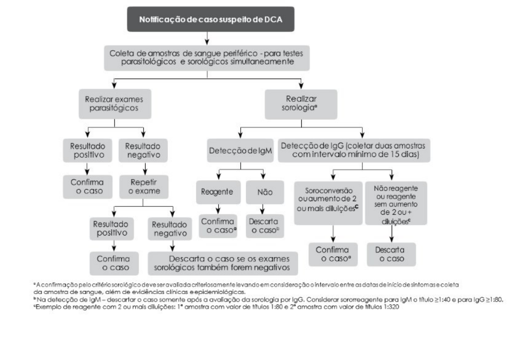 Os casos suspeitos de doença de Chagas aguda - DCA são de notificação obrigatória às autoridades locais de saúde, conforme Portaria de Consolidação nº 4, de 28 de Setembro de 2017, anexo V - Capítulo I. A unidade de saúde notificadora deve utilizar a ficha de notificação/investigação do Sistema de Informação de Agravos de Notificação – Sinan (http://portalsinan.saude.gov.br/doenca-de-chagas-aguda), encaminhando-a para ser processada conforme o fluxo estabelecido pela Secretaria Municipal de Saúde. Na ocorrência de surtos por transmissão oral, além da notificação individual obrigatória, é importante que estes surtos sejam notificados e investigados com a colaboração das equipes de vigilância epidemiológica das doenças de transmissão hídrica e alimentar. http://portalsinan.saude.gov.br/surto Os casos crônicos até o momento não devem ser notificados no Sinan, porém, perante a identificação de um caso crônico está indicada a realização de investigação sorológica nos demais membros da família (pais, irmãos e filhos) e outras pessoas que convivem ou conviveram com o doente, na intenção de identificar outros portadores da doença. Todos os portadores de T. cruzi devem ser avaliados e acompanhados pelas equipes de saúde da família e por especialistas sempre que indicado pelo médico da equipe. Ref: Ministerio da saúde - Doença de Chagas: o que é, causas, sintomas, tratamento e prevenção