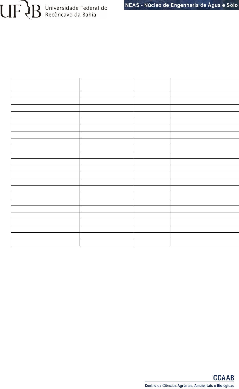 www.ufrb.edu.br/neas +55 (75) 3621-2798 Rua Ruy Babosa, 710 – Campus Universitário CEP 44380-000 – Cruz das Almas - BA 5. Entre dois pontos no solo, na horizontal, existe um gradiente de potencial de 1,7x10-3 (cm3/cm3)/cm de solo. O fluxo de água é de 0,26 cm/dia. Qual a condutividade hidráulica nessa região ? 6. Foi realizado um teste de infiltração, cujos resultados então apresentados na tabela abaixo. T - Tempo acumulado (min) Leitura na régua (cm) Diferença (cm) I - Infiltração acumulada (cm) 0 5,0 1 3,4/5,0 2 4,6 3 4,3 4 4,1 5 3,9/5,0 10 4,2 15 3,6/5,0 20 4,5 30 3,7/5,0 40 4,3 50 3,7 60 3,1/5,0 70 4,2 80 4,0 100 3,1/5,0 120 4,2 140 3,4/5,0 170 3,8/5,0 200 3,9/5,0 230 4,0 260 3,0/5,0 290 4,0 a) Determinar a equação da Infiltração b) Determinar a equação da velocidade de infiltração c) A velocidade de infiltração básica do solo (VIB) d) Determine o tempo necessário para a infiltração de uma lâmina de água correspondente a 30mm? 7. Estudar o capítulo 2 “Relação Solo-Água-Planta e Atmosfera” (Livro: Manual de Irrigação; Salassier Bernardo) 8. Dentro de uma tubulação de água de secção transversal de 20 cm2 passam 150 cm3 de água em 8 minutos. Qual a vazão e a densidade de fluxo da água ?