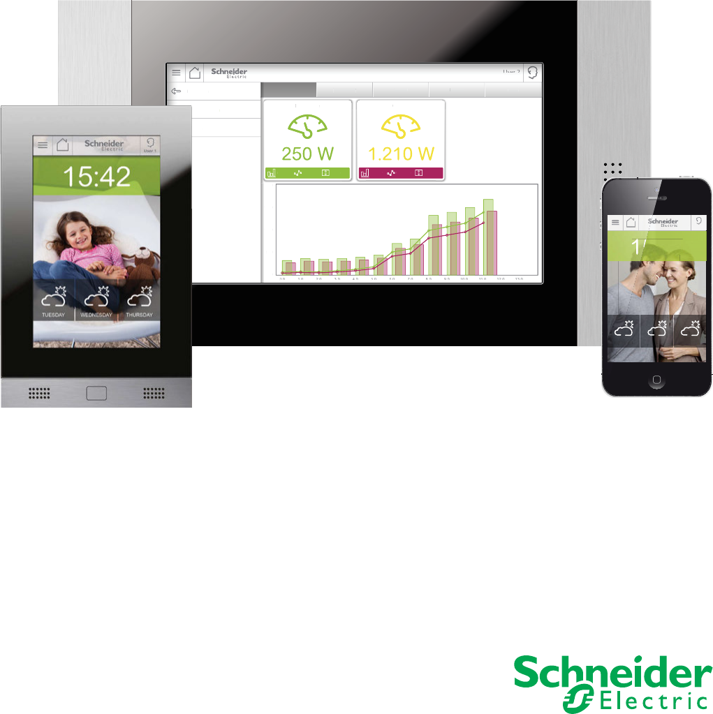 Building Control Systems KNX Catalogue Plan for intelligent Future Safety User 2 Today Yesterday Week Month Year 2000 1500 1000 500 0 0.0 1.0 2.0 3.0 4.0 5.0 6.0 7.0 8.0 9.0 10.0 11.0 12.0 13.0 Microwave 250 W Display Compare Scope Display Compare Scope Cooker 1.210 W Previous Consumption Loads UUsseerr 22 Today Yesterday Week Month Year 2000 1500 1000 500 0 0.0.00 1.1.00 2.2.00 3.3.00 4.4.00 5.5.00 6.6.00 7.7.00 8.8.00 9.9.00 1010.0.0 1111.0.0 1212.0.0 1313.0.0 Microwave Display Compare Scope Display Compare Scope Cooker Previous Consumption Loads User 1 THURSDAYWEDNESDAYTUESDAY 15:42 TU 11.2019 | Building control systems2 | KNX | Plan for intelligent Future Safety Efficiency is the success factor in modern buildings Contemporary building control has got to be easy and intelligent Building control systems | 11.2019 Plan for intelligent Future Safety | KNX | 3 Content Presentation 4 Software 23 Overview power supplies 24 System components 25 Energy measurement 34 Interfaces/gateways 361 Wiser for KNX / spaceLYnk 38 U.motion 42 Visualization 56 Control and display devices 57 Access Control 60 Push-button 62 Binary inputs 82 Presence detectors and movement detectors 88 Other sensors 106 Switch actuators 116 Blind/switch actuators 136 Blind actuators 140 Dimming actuators/control units 146 DALI 155 Other actuators 159 Room temperature control units 160 Accessories 176 Index 177 11.2019 | Building control systems4 | KNX | Plan for intelligent Future Safety Intelligent building control simply implemented! Building control systems | 11.2019 Plan for intelligent Future Safety | KNX | 5 KNX combines current requirements into one system Energy efficiency Comfort Safety & securityFlexibility KNX combines modern building technologies in one system A KNX system grows with the customers' requirements Combining building control with the technologies of the future Light Control Safety and Security Devices Mobile Devices Building Control Network Connectivity Door Entry Systems Energy Management Smart Metering Blind and Shutter Control HVAC Cost efficiency Intelligent networking of all building systems can avoid unnecessary energy consumption and re- duce operating costs on a sustained basis. The ability to expand modular KNX system technology ensures economical solutions that are guaranteed to remain tailor-made over the long haul. Safety and security To let residents feel as safe as possible, building technology must be able to react in a fast and intelligent way in any situation and at any time. No matter whether the building is full of life or quiet. Comfort Everyone nowadays expects more comfort and convenience in their domestic and working lives. What is called for are comfortable solutions that can be operated straightforwardly and without fuss, to make living and working easier. Flexibility In order to allow for flexible room usage over several decades, it is necessary for building functions to be adapted to the users' require- ments easily in a cost-effective way – without the need for walls to be opened up and new cables to be laid. KNX is the intelligent building control system for all areas in which your customers live and work. From single-family houses to office complexes, the comprehensive port- folio of KNX solutions from Schneider Electric enables you to achieve flexible, energy- efficient, comfortable and safe solutions that are easy to plan, install and operate. 11.2019 | Building control systems6 | KNX | Plan for intelligent Future Safety Building control systems | 11.2019 Plan for intelligent Future Safety | KNX | 7 KNX offers convincing flexibility and cost efficiency. Whether in new buildings or for retrofitting, in private homes, offices, hotels or public buildings – KNX installations can easily be expanded and adapted again and again to new requirements. The advantages of modern building control with KNX Greater safety, security, comfort and efficiency in all building types The more extensive the application, the greater the efficiency reduce the complexity of the wiring and make the system both clearly comprehensible and easy to expand. The Engineering Tool Software (ETS) makes the planning, installation and con- figuration of KNX easy, quick and efficient. Flexibility and expandability Changes of use are also effortless with KNX. The installation can be adapted to modified re- quirements or future developments at any time. Additional components can be integrated into the existing bus system without requiring further installation work. Low operating costs KNX enables the operating costs of a building to be reduced in the long term by only activat- ing loads such as air conditioning, heating and lighting when they are actually needed. Control is effected automatically by means of time profiles as well as movement and presence de- tectors, thus leading to significant energy sav- ings in offices and public buildings in particular. Time savings By networking all components via a single bus, it is possible to simplify the cable routing, Comfort, safety and security in private homes In private homes, the priority is on control con- venience with high levels of safety and security. KNX conveniently connects different utilities together, realising comfortable solutions that are easy to operate and have intelligent functions for when the residents are not at home. Intelligent light and scene control provides the household- ers with a good feeling of safety and security – day and night. Furthermore, the possibilities of KNX do not end at the boundaries of the property. Many functions can also be controlled from mobile devices or PCs by online access. Flexibility and efficiency in offices and public buildings Flexibility and cost efficiency are particularly im- portant when it comes to commercial buildings. Due to their large number of differently used areas, offices and public buildings offer plenty of scope for significant energy-savings. Automated building control can be perfectly