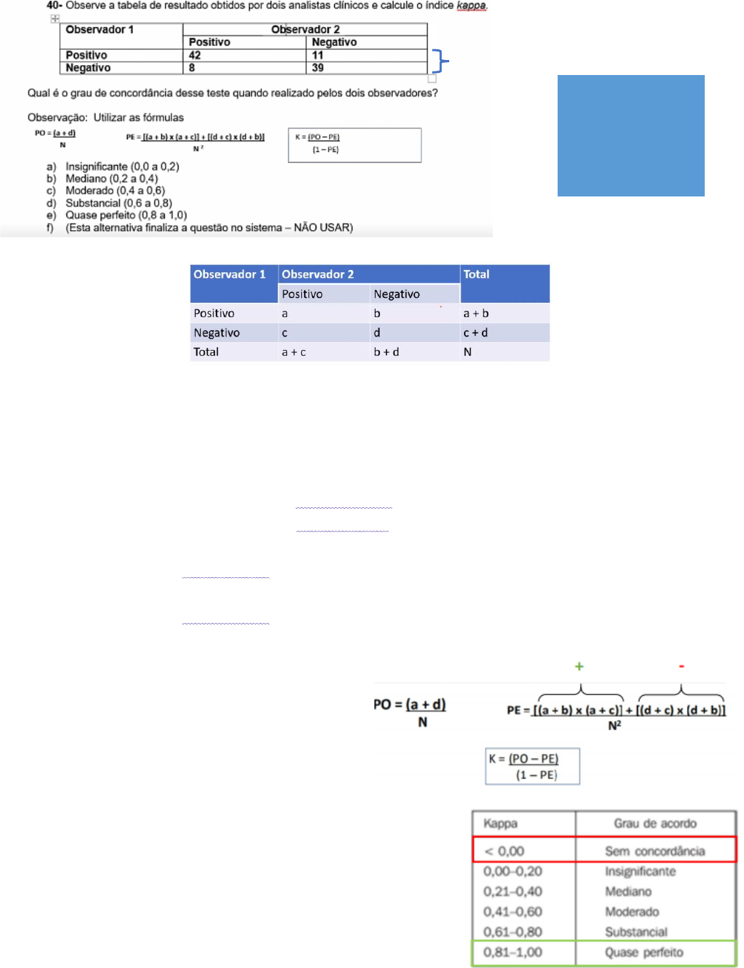 Índice Kappa • Concordância de um teste quando dois ou mais operadores o executam. • Relação entre a concordância observada (PO) e a esperada (PE). Exercício para treinar a;b;c;d → é a concordância e não o número de testes. Foram mandados X testes para duas operadores e os resultados foram os seguintes. Quantas vezes eles concordaram e discordaram no resultado? − O valor de “a” é quantas vezes elas concordaram que o resultado era positivo → a=? − O valor de “d” é quantas vezes elas concordaram que o resultado era negativo → d=? − O valor de “c” é quantas vezes o operador 1 achou o resultado negativo e o operador 2 achou o resultado positivo (discordaram) → c=? − O valor de “b” é quantas vezes o operador 2 achou o resultado negativo e o operador 1 achou o resultado positivo (discordaram) → b=? − N = número de testes/amostras ➢ Concordância observada (PO)= ➢ Concordância observada (PO)= ➢ Concordância esperada (PE) = ➢ Concordância esperada (PE)= ➢ Concordância esperada (PE)= ➢ Índice Kappa (K) = ➢ Índice Kappa (K) = ➢ Índice Kappa (K) = *Se não houvesse discordância entre os testes realizados pelas duas operadoras o K=1 que seria perfeito. Cálculos N = 100 A resolução está na pág. 2 mas tenta fazer passo a passo sozinhos antes de ir ver. Resolução