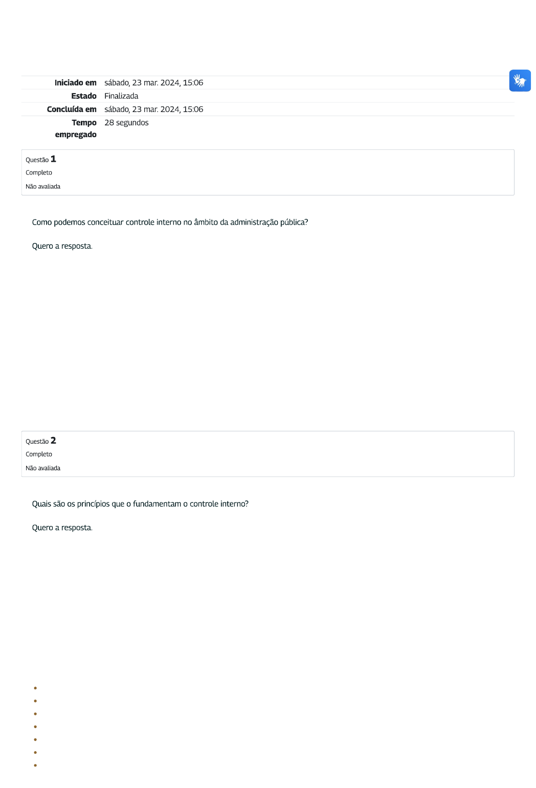 Controle interno pode ser definido como o conjunto de atividades e procedimentos para assegurar que os objetivos da administração pública sejam alcançados com legalidade e bom desempenho. Principais princípios do controle interno: relação custo-benefício; qualificação adequada, treinamento e rodízio de funcionários; delegação de poderes e definição de responsabilidades; segregação de funções; instruções devidamente formalizadas; controle sobre as transações; aderência a diretrizes e normas legais. Exercício de fixação - Módulo 4: Revisão da tentativa https://mooc41.escolavirtual.gov.br/mod/quiz/review.php?attempt=2... 1 of 3 23/03/2024, 15:06 A gestão de riscos consiste na adoção de medidas que diminuam a possibilidade de determinada área da Administração Pública ficar refém de agentes internos ou externo que possa interferir no seu correto funcionamento. Exercício de fixação - Módulo 4: Revisão da tentativa https://mooc41.escolavirtual.gov.br/mod/quiz/review.php?attempt=2... 2 of 3 23/03/2024, 15:06 As unidades de controle interno, para atingir as finalidades básicas, devem desempenhar, no mínimo, o seguinte conjunto de atividades: avaliar o cumprimento de metas previstas para a entidade; avaliar a execução das ações de governo, visando a comprovar o nível de execução das metas, o alcance dos objetivos e a adequação do gerenciamento; a execução do orçamento, comprovando a conformidade da execução com os limites e as destinações estabelecidas na legislação pertinente; a gestão dos administradores públicos, verificando a legalidade e a legitimidade dos atos e examinando os resultados quanto à economicidade, eficiência e eficácia da gestão orçamentária, financeira, patrimonial, de pessoal e demais sistemas administrativos e operacionais; exercer o controle das operações de crédito, avais, garantias, direitos e haveres do respectivo ente federado, para aferir a sua consistência e a adequação; as renúncias de receitas, verificando o resultado da efetiva política de anistia, remissão, subsídio, crédito presumido, concessão de isenção em caráter não geral, alteração de alíquota ou modificação de base de cálculo que implique redução discriminada de tributos ou contribuições, e outros benefícios que correspondam a tratamento diferenciado. Exercício de fixação - Módulo 4: Revisão da tentativa https://mooc41.escolavirtual.gov.br/mod/quiz/review.php?attempt=2... 3 of 3 23/03/2024, 15:06