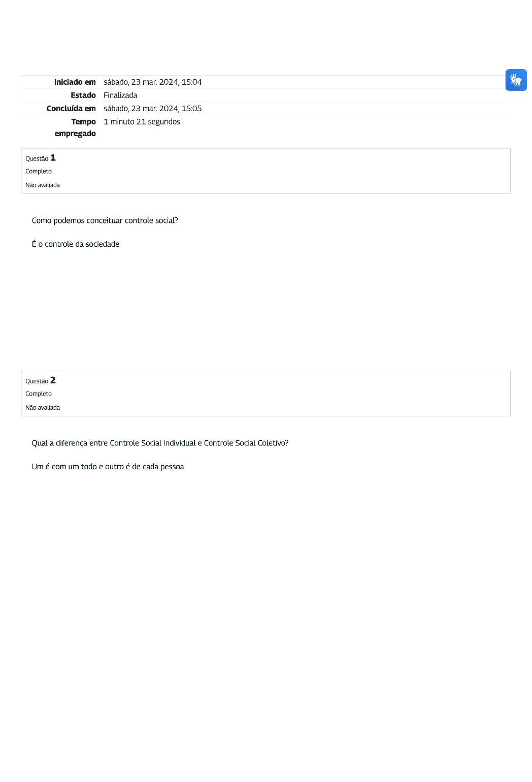 Controle social é o controle que os membros da sociedade exercem sobre a execução orçamentária e financeira dos recursos públicos. O controle social individual ocorre quando o cidadão, de forma isolada, verifica o comportamento dos gestores públicos frente às ações governamentais. Quando o controle é exercido de forma colegiada pelos cidadãos, podemos chama-lo de controle social coletivo, como é o caso do controle exercido pelos conselhos de políticas públicas. Exercício de fixação - Módulo 5: Revisão da tentativa https://mooc41.escolavirtual.gov.br/mod/quiz/review.php?attempt=2... 1 of 3 23/03/2024, 15:05 De modo geral, estes conselhos acompanham, fiscalizam e orientam localmente a execução das políticas públicas. Em nossa aula 5, vimos as principais atribuições dos seguintes conselhos: Conselho Municipal de Assistência Social - CMAS; Conselho de Alimentação Escolar - CAE; Conselho de Acompanhamento e Controle Social do Fundeb - CACS. Portal da Transparência do Governo Federal Portal dos Convênios do Governo Federal – SICONV Site do Tesouro Nacional Portal do Fundo Nacional de Desenvolvimento da Educação – FNDE Portal do Fundo Nacional de Saúde – FNS Exercício de fixação - Módulo 5: Revisão da tentativa https://mooc41.escolavirtual.gov.br/mod/quiz/review.php?attempt=2... 2 of 3 23/03/2024, 15:05 As ouvidorias funcionam como canal de comunicação entre o cidadão e o Estado. Seu objetivo é permitir o envio de críticas e sugestões do cidadão às organizações públicas, em regime de colaboração, para a melhoria dos serviços prestados pelo governo. A base normativa das ouvidorias públicas é a própria Constituição Federal, em especial, o artigo 37, parágrafo 3º, e o Decreto n 6.932/2011. Exercício de fixação - Módulo 5: Revisão da tentativa https://mooc41.escolavirtual.gov.br/mod/quiz/review.php?attempt=2... 3 of 3 23/03/2024, 15:05