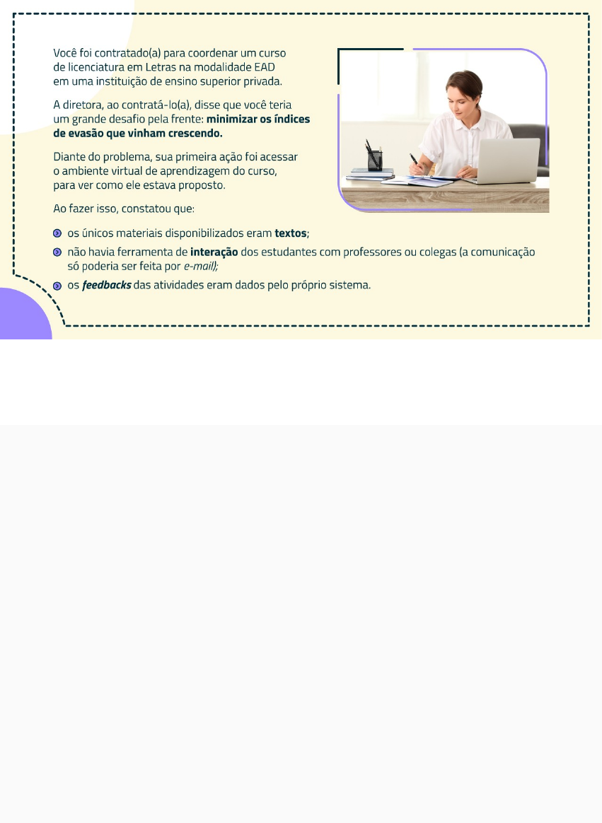 Desafio A humanização dos ambientes virtuais de aprendizagem é fundamental para a motivação dos alunos dos cursos de EAD. Uma vez motivados, os estudantes se engajam mais efetivamente nas atividades propostas e se evadem menos dos cursos a distância. Analise a situação a seguir: Ciente de que as características do ambiente deveriam estar causando a desmotivação dos estudantes e sua evasão, elabore uma proposta de revisão do ambiente virtual de aprendizagem, para torná-lo mais motivador e humanizado. Sua resposta Para tornar o ambiente virtual de aprendizagem mais motivador e humanizado, algumas estratégias podem ser adotadas: Design centrado no usuário: A primeira etapa seria realizar uma análise detalhada das necessidades e preferências dos alunos. Isso pode ser feito por meio de pesquisas, entrevistas ou grupos focais. Compreender as expectativas dos estudantes ajudará na criação de um ambiente que atenda às suas necessidades. Interface intuitiva e amigável: O ambiente virtual deve ser fácil de usar e navegar. Uma interface limpa, organizada e intuitiva facilitará a interação dos alunos com o conteúdo e as atividades. Isso inclui uma estrutura de menu clara, instruções claras e botões de navegação bem visíveis. Personalização e flexibilidade: Permitir que os alunos personalizem sua experiência de aprendizagem pode aumentar seu envolvimento. Isso pode incluir a capacidade de escolher entre diferentes estilos de aprendizagem, ajustar as configurações de acessibilidade e personalizar a aparência do ambiente. Interação e colaboração: Promover a interação entre os alunos e com os professores é essencial para criar um senso de comunidade e pertencimento. Isso pode ser feito por meio de fóruns de discussão, salas de bate-papo, grupos de estudo online e atividades colaborativas. Feedback e reconhecimento: Fornecer feedback constante e incentivar o reconhecimento do progresso dos alunos pode aumentar sua motivação. Isso pode ser feito por meio de comentários individuais sobre tarefas, badges ou certificados de conquista, e até mesmo rankings ou líderes de desempenho. Incorporação de mídia variada: Utilizar uma variedade de formatos de mídia, como vídeos, áudios, infográficos e jogos educacionais, pode tornar o ambiente mais estimulante e envolvente para os alunos. Suporte emocional e acadêmico: Disponibilizar recursos de apoio emocional e acadêmico, como orientação acadêmica, serviços de aconselhamento e grupos de apoio, pode ajudar os alunos a lidar com desafios pessoais e acadêmicos, promovendo um ambiente mais acolhedor e humano. Implementar essas mudanças no ambiente virtual de aprendizagem pode contribuir significativamente para a motivação e o engajamento dos alunos, reduzindo assim a taxa de evasão nos cursos a distância. Enviado em: 23/03/2024 20:35 Padrão de resposta esperado Para tornar o ambiente mais motivador e humanizado para os alunos, uma estratégia bastante importante é a adoção de ferramentas que possibilitem a interação dos estudantes com o professor autor ou com o tutor e deles com seus pares. O fórum é uma ferramenta bastante adequada para essa finalidade, cabendo ao professor/tutor realizar a mediação e propor questões para discussão. Um fórum de dúvidas também é um espaço bastante importante para que os alunos possam expor suas dúvidas e dificuldades. Para que a interação com os materiais seja mais interessante, deve haver uma diversidade maior de formatos, como vídeos, podcasts e diferentes tipos de textos. O feedback automático precisa ser substituído pelo feedback individualizado, dado pelo professor/tutor, para que o aluno possa compreender seus erros e acertos e avançar no percurso de aprendizagem. Exercícios 1. O conceito de competência passou a ser amplamente utilizado nos contextos empresariais, a partir dos anos 1970. Logo depois, ele começou a permear as discussões nos contextos educacionais. Sobre as competências na educação, leia as afirmativas a seguir: I. O desenvolvimento das competências demanda a proposição de atividades que priorizem a memorização e a mecanização de procedimentos. II. A discussão da importância das competências na educação provocou a revisão das práticas educativas tradicionais e mecanicistas. III. Um sujeito competente é capaz de mobilizar os conhecimentos já construídos e utilizá-los para o enfrentamento de diferentes demandas, em contextos diversos. IV. As competências desenvolvidas nos contextos escolares só são manifestadas quando o indivíduo se depara com uma situação idêntica àquela abordada pelo professor. São verdadeiras as afirmativas: A. II e III. B. I e II. C. III e IV. D. I e III. E. II e IV. 1 de 5 perguntas A resposta correta é: A. II e III. A afirmativa II está correta, pois a discussão sobre competências na educação levou a uma revisão das práticas educativas tradicionais e mecanicistas. A afirmativa III também está correta, pois um sujeito competente é capaz de mobilizar os conhecimentos já construídos para enfrentar diversas demandas em diferentes contextos. 2. O desenvolvimento de competências pressupõe que os indivíduos sejam capazes de mobilizar os conhecimentos já construídos para o enfrentamento de demandas diversas na vida cotidiana e no mundo do trabalho. Sobre o currículo voltado para o desenvolvimento de competências, é correto afirmar o seguinte: A. O currículo voltado para o desenvolvimento de competências deve ser adotado apenas nas ações educativas realizadas no ensino presencial. B. O currículo voltado para o desenvolvimento de competências deve ser adotado apenas nas ações educativas que são híbridas. C. O currículo voltado para o desenvolvimento de competências também deve ser adotado apenas na educação a distância. D. O currículo voltado para o desenvolvimento de competências deve ser adotado nas modalidades presencial, híbrida e a d