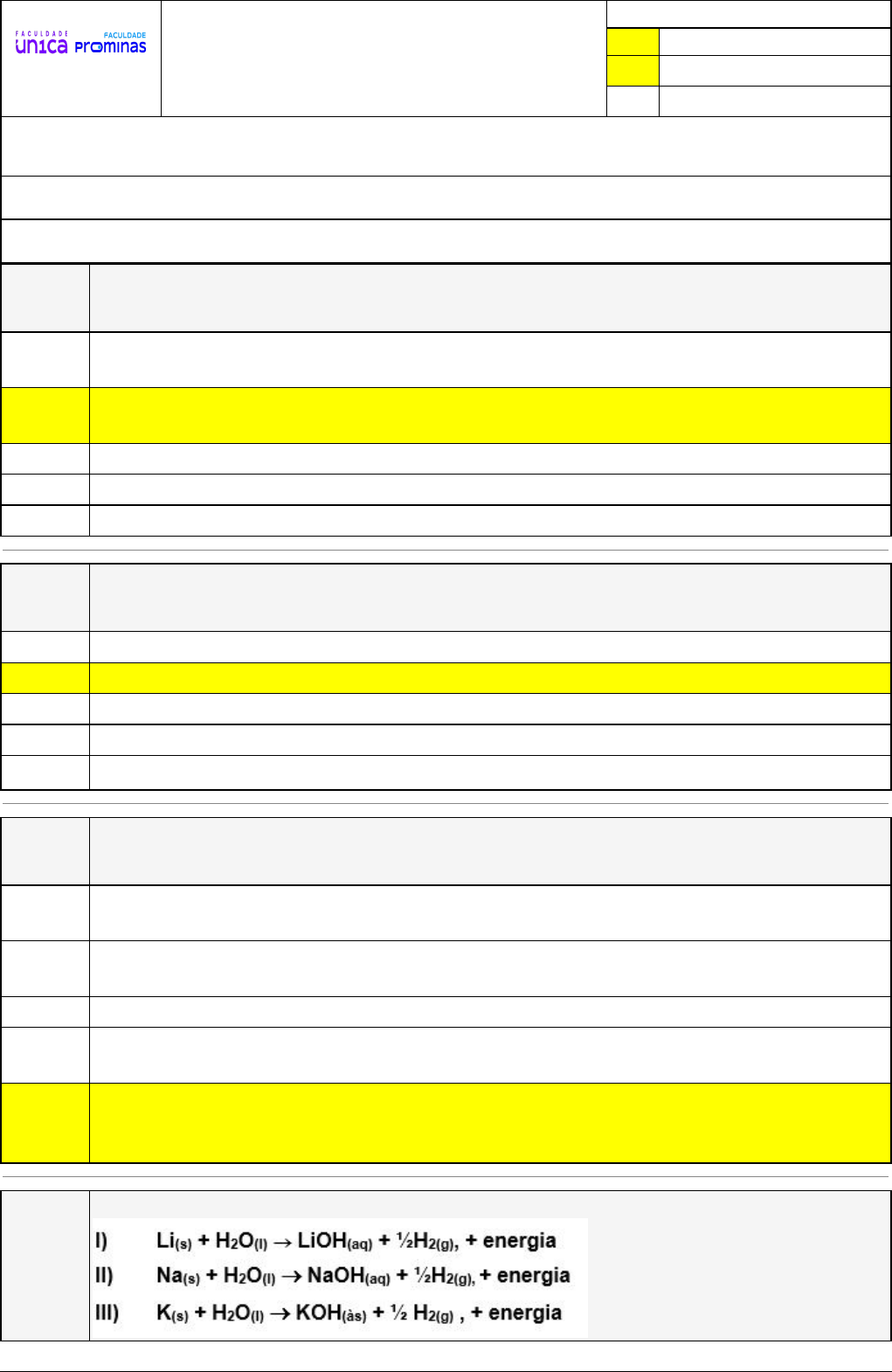 Pincel Atômico - 25/03/2024 15:45:44 1/3 LUCIA CABRAL DE MATTOS Exercício Caminho do Conhecimento - Etapa 16 (23185) Atividade finalizada em 25/03/2024 15:45:21 (1579647 / 1) LEGENDA Resposta correta na questão # Resposta correta - Questão Anulada X Resposta selecionada pelo Aluno Disciplina: PRÁTICA PEDAGÓGICA INTERDISCIPLINAR: QUÍMICA INORGÂNICA [1011376] - Avaliação com 8 questões, com o peso total de 1,67 pontos [capítulos - 2] Turma: Segunda Graduação: Segunda Graduação 6 meses - Licenciatura em Química - Grupo: FPD-JANEIRO/2024 - SGegu0A040124 [111103] Aluno(a): 91552060 - LUCIA CABRAL DE MATTOS - Respondeu 4 questões corretas, obtendo um total de 0,83 pontos como nota [359951_1647 52] Questão 001 Sobre as reações dos metais representativos, é correto afirmar: Na forma metálica, todos reagem diretamente com OH- formando, formando hidróxidos (M + nOH- ï‚® M(OH)n). X Todos os metais representativos, na forma metálica, reagem com ácidos de Lewis de maior potencial de redução. Todos formam sais solúveis. Todos eles reagem com a água formando hidróxidos. Todos são pirofóricos. [359952_1535 30] Questão 002 Sobre os metais alcalino-terrosos, é CORRETO afirmar: Apresentam volatilidade moderada. São solúveis em soluções ácidas. Todos sofrem combustão com facilidade. São solúveis em hidrocarbonetos. X São solúveis da presença de ânions polivalentes, como PO4 3-, CO3 2-. [359951_1647 54] Questão 003 Os metais alcalinos reagem violentamente com a água porque quando os metais alcalinos perdem elétrons, ocorre uma liberação excessiva de energia ao romper a interação núcleo-elétron. os átomos de hidrogênio recebem os elétrons, formando a espécie H-, que é muito estável. os elétrons liberados sofrem entrelaçamento quântico, que é um fenômeno exotérmico. a remoção do elétron reduz a repulsão elétron-elétron nesses metais, gerando um efeito exotérmico. X a reação com a água, além de envolver a transferência de elétron para o oxigênio da água (que é um processo exotérmico), ainda ativa a reação do H2 formado com o O2 do ar, que também é uma reação exotérmica. [359951_1535 28] Questão 004 Considere as reações, e marque a alternativa CORRETA. Pincel Atômico - 25/03/2024 15:45:44 2/3 A reação I é a menos exotérmica, pois o lítio é um metal covalente. O lítio possui maior energia de ionização, por possuir maior carga nuclear efetiva. A reação do sódio com a água é a única de característica explosiva, devido ao balanço entre tamanho e carga nuclear efetiva, que é intermediária entre o lítio e potássio. X A reação do potássio com a água é a que libera maior quantidade de energia, devido à maior facilidade de ionizar o potássio, em decorrência da maior repulsão elétron- elétron. A reação I não é espontânea. [359951_1647 61] Questão 005 Sobre a reação do Alumínio com o cátion Cobre, analise as questões abaixo e marque a opção correta. I.A reação do Al com o Cu2+, o Al é uma base de Lewis e o Cu2+ é um ácido de Lewis. II.Ocorre a formação de precipitado de CuSO4. III.O Cobre é a espécie que possui maior potencial de redução. Somente I e II estão corretas. Somente II está correta. X Somente I e III estão corretas. Todas estão corretas. Somente I está correta. [359953_1535 33] Questão 006 Considerando as propriedades dos elementos das colunas 1A, 2A e 3A, marque a alternativa CORRETA. Todos os elementos formam ligas metálicas estáveis. Todos os elementos reagem espontaneamente com a água. A coluna 3A é a mais heterogênea das três, pois possui elementos metálicos e ametálicos, além de compostos com reatividades muito distintas. X Os elementos dessas três colunas formam cátions com facilidade. Todos os elementos formam óxidos passivadores. [359951_1647 62] Questão 007 Sobre o comportamento do alumínio em meio básico, avalie as afirmações abaixo e marque a opção correta. I.Ocorre a formação de Al(OH)3 somente após a formação de Al(OH)4-. II.Al(OH)3 é uma espécie insolúvel, usada no tratamento de água por floculação. III.Al(OH)3 é conhecido também como hidróxido de alumínio coloidal, por ser uma espécie química nanoestruturada. Todas estão corretas. Somente I está correta. Somente II e III estão corretas. Somente I e II estão corretas. X Somente II está correta. Pincel Atômico - 25/03/2024 15:45:44 3/3 [359952_1535 29] Questão 008 Sobre a dissolução dos metais alcalino-terrosos em água, avalie a alternativa abaixo e marque a opção CORRETA. I) Assim como os demais metais, são insolúveis em água na forma metálica, se solubilizando apenas por reação química, formando cátions. II) Formam facilmente cátions M+ e M2+ em meio aquoso, já que possuem dois elétrons no orbital s, que podem ser perdidos gradualmente quando em contato com a água. III) São menos reativos que os metais alcalinos por apresentarem maior carga nuclear efetiva e menor energia de ionização. IV) Todos os cátions M2+ pouco solúveis, pois possuem baixa energia de ionização. Apenas I e III são corretas X Apenas II, III e IV são corretas Apenas I está correta Apenas I e II são corretas Todas são corretas