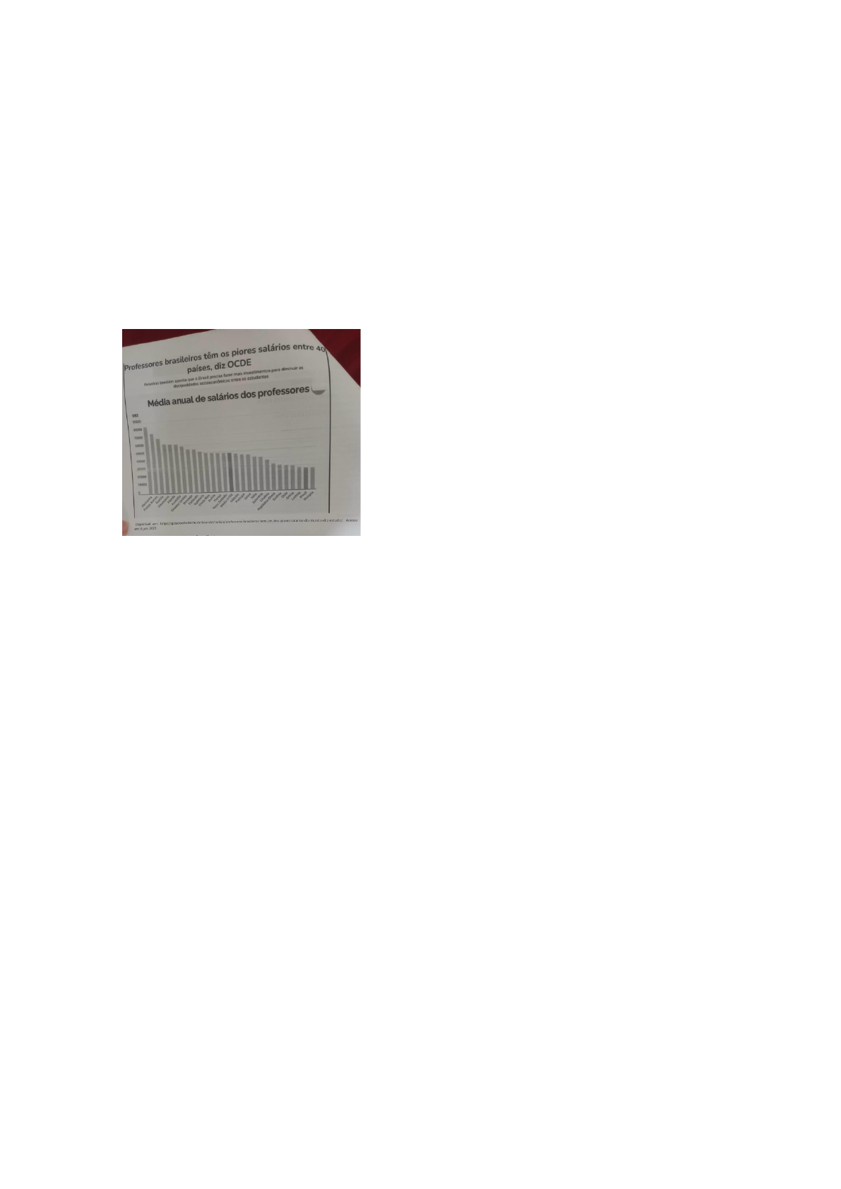 01 Apanhado 2024 Interpretação e Produção de Textos Pergunta 1 Observe o gráfico, divulgado em setembro de 2021, após levantamento realizado pela OCDE (Organização para a Cooperação e Desenvolvimento Econômico), formada por 38 países. Com base na leitura, avalie as afirmativas. É correto o que se afirma em: C) II e III, apenas. II- A média dos salários anuais dos professores nos Países Baixos é aproximadamente o triplo da observada no Brasil. III- Na Nova Zelândia, na França e na Suécia, a média dos salários anuais dos professores é bem próxima da média da OCDE. Pergunta 2 Considere o gráfico a seguir, que mostra a distribuição dos brasileiros maiores de 25 anos de acordo com os anos de estudo em 2007 e em 2015. Com base na leitura, analise as afirmativas. É cometo o que se afirma em: C) II e III, apenas II- De acordo com os dados, observa-se tendência de aumento nos anos de estudo das pessoais maiores de 25 anos no período de 2007 a 2015. III. Pelos dados, infere-se que pouco mais de 10% da população brasileira havia concluído o ensino superior em 2015. Pergunta 3 Observe a ilustração a seguir: Com base na analise. Considere as afirmativas. É correto o que se afirma apenas em: E) III III - A ilustração opõe a singularidade de à massificação, mostrando que aquele que não se insere no padrão social pode ser punido. Pergunta 4 Considere a ilustração e as afirmativas. É correto o que se afirma somente em: B)II II- O texto é uma crítica à exploração econômica dos recursos naturais. Pergunta 5 Leia o trecho a seguir, de autoria do professor Alfredo Bosi Com base na leitura, avalie as asserções e a relação proposta entre elas. I- O autor considera que a cultura popular, expressa em manifestações como o bumba meu boi ou uma cantoria, tem o enraizamento como característico, o que empobrece essas produções. Por que. II- Os meios de comunicação apropriam-se das manifestações populares, transformando-as em espetáculos inseridos na lógica mercadológica capitalista. Assinale a alternativa correta. D) A afirmativa I é uma proposição falsa, e a II e uma proposição verdadeira. Pergunta 6 Leia os quadrinhos e o texto a seguir. Com base na leitura, avalie as afirmativas. É correto o que se afirma em: C) I e II, apenas. I- Os quadrinhos e o texto apontam que o humor é, em alguns casos, disfarce para o discurso de ódio. III- O discurso de ódio caracteriza-se pela incitação à discriminação de pessoas por conta de características como gênero, orientação sexual, etnia, nacionalidade e condição física. Pergunta 7 Leia a charge. O objetivo do texto é: C) Criticar o discurso negacionista, que se opõe à ciência. Pergunta 8 Leia o trecho do livro Sociedade do cansaço, do pensador contemporâneo Byung-Chul Han, e os quadrinhos. Com base na leitura, avalie as afirmativas. É correta: E) III, apenas. III- Segundo Byung-Chul Han, as doenças também são determinadas historicamente, de acordo com as condições sociais em que vivem as pessoas. Pergunta 9 Observe a ilustração. O objetivo da ilustração é: B) Apontar o livro como um lugar seguro de conhecimento. Pergunta 10 Observe a charge a seguir. Com base na leitura, considere as afirmativas. É cometo: B) II II- A charge apresenta o Brasil como um país separado pelas desigualdades sociais. Pergunta 11 Leia o trecho extraído do livro Às veias abertas da América Latina, de Eduardo Galeano Com base nas leituras, assinale as afirmativas: D) I e III I- De acordo com o autor, historicamente, a América Latina serviu aos interesses dos países centrais do capitalismo internacional. III- A organização social, econômica e política dos países latino-americanos, segundo Galeano, foi determinada de modo a atender à engrenagem do sistema capitalista internacional. Pergunta 12 De acordo com o Dicionário Houaiss, utopia pode ser definida como "um lugar ou estado ideal, de completa felicidade e harmonia entre os indivíduos, ou ainda como qualquer descrição imaginativa de uma sociedade ideal, fundamentada em leis justas e em instituições político-econômicas verdadeiramente comprometidas com o bem -estar da coletividade”. A respeito do tema, leia os textos a seguir: Com base na leitura dos textos, analise as asserções e a relação: I- A utopia pode ser entendida como um horizonte que nunca será alcançado, cuja função é orientar e motivar certas ações. Por que. II- A utopia diz respeito à sociedade futura, a um estágio definitivo da organização social, no qual se contemplam as conseqüências das ações que fazemos no presente. C) A primeira asserção é verdadeira, e a segunda é falsa. Pergunta 13 Leia a charge a seguir. O objetivo da charge é: D) Mostrar que, em épocas distintas, existem pessoas insatisfeitas porque não apresentam o padrão de beleza socialmente determinado. Pergunta 14 A linguagem como atividade humana. O homem é um ser que fala. A palavra se encontra no limiar do universo humano, pois caracteriza fundamentalmente o homem e o distingue do animal. Se criássemos juntos um bebê humano e um macaquinho, não veríamos muitas diferenças nas reações de cada um nos primeiros contatos com o mundo e as pessoas. O desenvolvimento da percepção, da preensão dos objetos, do jogo com os adultos é feito de forma similar, até que em dado momento, por volta dos dezoito meses, o progresso do bebê humano torna impossível prosseguirmos na comparação com o macaco, devido à capacidade que o homem tem de ultrapassar os limites da vida animal ao entrar no mundo do símbolo. Poderíamos dizer, porém, que os animais também têm linguagem. Mas a natureza dessa comunicação não se compara à revolução que a linguagem humana provoca na relação do homem com o mundo. É interessante o estudo da "linguagem" das abelhas, que dançando “comunicam” às outras onde acharam pólen. Ninguém pode negar que o cachorro expressa a emoção p