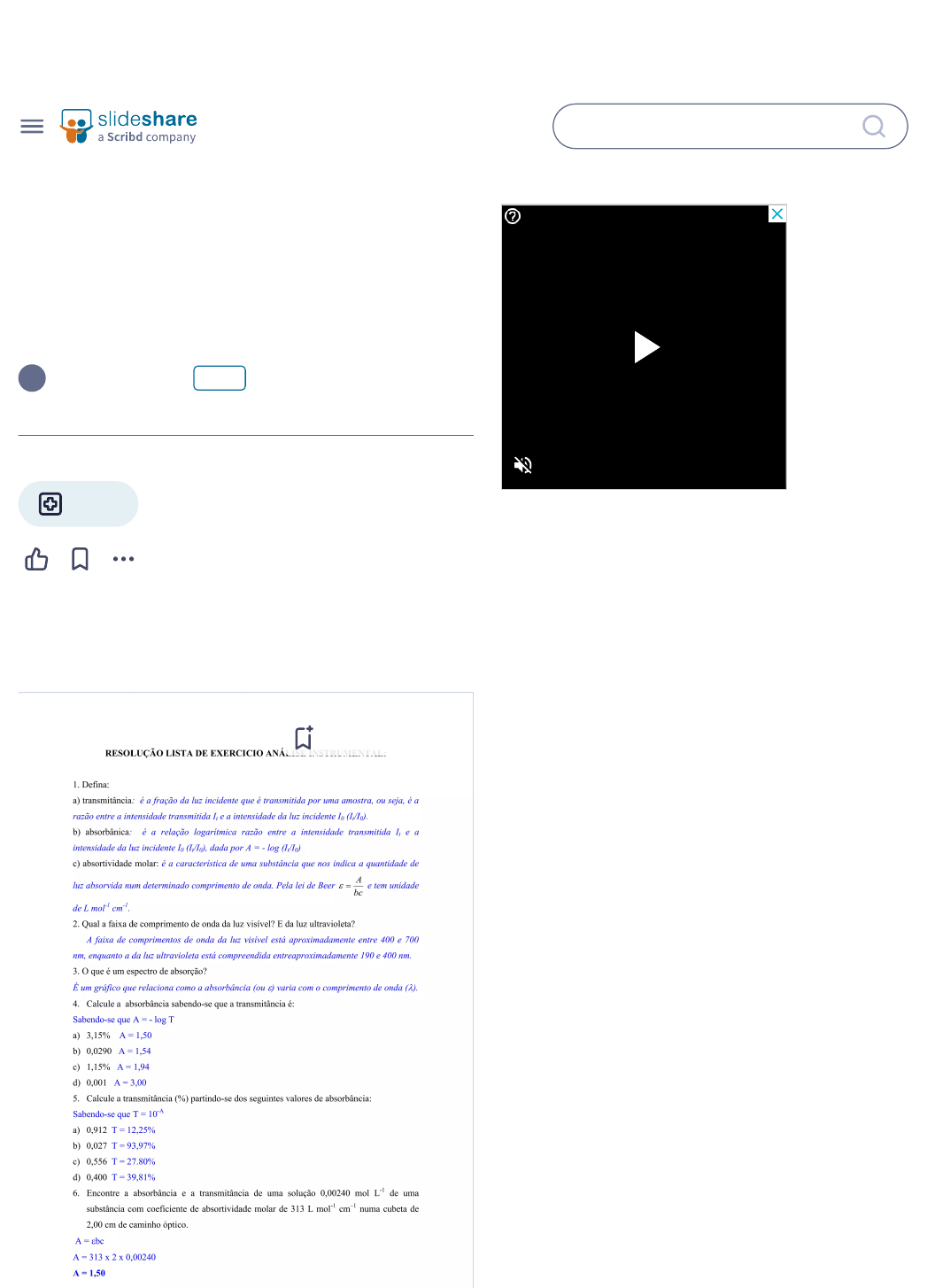 Pesquisar Carregar Leia gratuitamente durante 30 dias Entrar RESOLUÇÃO LISTA DE EXERCICIO ANÁLISE INSTRUMENTAL.pdf 28 de abr. de 2022 • 0 gostou • 436 visualizações Saúde M farma Leia mais Guardar slide Repetir vídeo MarciaRodrig… Seguir 30/03/2024, 01:08 Página 1 de 7 Recomendados Guardar slide Relatório de preparo e padronização de HCl e H2SO4 94.9K visualizações • 12 slides Absorcao versus emissao 4.4K visualizações • 96 slides Relatorio analitica ii_04 3.8K visualizações • 7 slides Relatório 03 - Química Analítica Quantitativa 1 - Dosagem de AAS e Mg(OH)2 58.7K visualizações • 11 slides Relatório prática 1 volumetria de neutralização 20.9K visualizações • 17 slides Estudo dirigido inteiro 15.2K visualizações • 24 slides Resolução lista terceira_unidade 32.4K visualizações • 24 slides Relatório de cromatografia- organica - Ivys Antônio Silvana Boacina Freitas Fabiane Sousa Bento Jenifer Rigo Almeida Ana Morais Nascimento Lucas Caetano Livia Cristina 30/03/2024, 01:08 Página 2 de 7 Saber mais Relatório de cromatografia- organica - aula 8 48K visualizações • 9 slides Karen Pirovano 30/03/2024, 01:08 Página 3 de 7 Mais conteúdo relacionado Mais procurados (20) Semelhante a RESOLUÇÃO LISTA DE EXERCICIO ANÁLISE INSTRUMENTAL.pdf (20) Potenciométrica e Condutimetria • 12.4K visualizações Análise gravimétrica • 17.9K visualizações Cromatografia • 27.2K visualizações exercícios espectrofotometria.pdf • 284 visualizações Determinação de salicilato em aspirina • 3.9K visualizações Fotometria de-chama • 583 visualizações Maria Teixie Maria Teixie Isabelle Mace MarcoReisBrugn Josii Carvalh Drigo Santos 1 de 4 Baixar para ler o!line Baixar agora 30/03/2024, 01:08 Página 4 de 7 Apresentações para você (20) Mais de MarciaRodrigues615662 (20) Livros relacionados Febre tifoide cartaz Microbiologia: meios de cultura e provas de identificação Anamnese 2º AULA.pptx • 16 visualizações Módulo 3_Farmácia Hospitalar.pptx • 46 visualizações 4-protozoadotgi- 121031163342- phpapp02.pdf • 34 visualizaçõesMarciaRodrigue MarciaRodrigue MarciaRodrigue 30/03/2024, 01:08 Página 5 de 7 Livros relacionados Grátis com um teste de 30 dias do Everand Ver tudo Livro Como Testar Componentes EletrônicosNewton C. Braga 4.5 / 5 Livro Análise De Circuitos Andrew Fairbairn 0 / 5 Livro Espcex - Provas Resolvidas Gustavo Badini 0 / 5 Livro Tratamento de Lodos de Estações de Tratamento de Água Carlos A. Richter 0 / 5 RESOLUÇÃO LISTA DE EXERCICIO ANÁLISE INSTRUMENTAL.pdf 1. RESOLUÇÃO LISTA DE EXERCICIO ANÁLISE INSTRUMENTAL: 1. Defina: a) transmitância: é a fração da luz incidente que é transmitida por uma amostra, ou seja, é a razão entre a intensidade transmitida It e a intensidade da luz incidente I0 (It/I0). b) absorbânica: é a relação logarítmica razão entre a intensidade transmitida It e a intensidade da luz incidente I0 (It/I0), dada por A = - log (It/I0) c) absortividade molar: é a característica de uma substância que nos indica a quantidade de luz absorvida num determinado comprimento de onda. Pela lei de Beer bc A � � e tem unidade de L mol-1 cm-1 . 2. Qual a faixa de comprimento de onda da luz visível? E da luz ultravioleta? A faixa de comprimentos de onda da luz visível está aproximadamente entre 400 e 700 nm, enquanto a da luz ultravioleta está compreendida entreaproximadamente 190 e 400 nm. 3. O que é um espectro de absorção? É um gráfico que relaciona como a absorbância (ou �) varia com o comprimento de onda (�). 4. Calcule a absorbância sabendo-se que a transmitância é: Sabendo-se que A = - log T a) 3,15% A = 1,50 b) 0,0290 A = 1,54 c) 1,15% A = 1,94 d) 0,001 A = 3,00 5. Calcule a transmitância (%) partindo-se dos seguintes valores de absorbância: Sabendo-se que T = 10-A a) 0,912 T = 12,25% b) 0,027 T = 93,97% c) 0,556 T = 27.80% d) 0,400 T = 39,81% 6. Encontre a absorbância e a transmitância de uma solução 0,00240 mol L-1 de uma substância com coeficiente de absortividade molar de 313 L mol-1 cm–1 numa cubeta de 2,00 cm de caminho óptico. A = �bc A = 313 x 2 x 0,00240 A = 1,50 2. Se A = -logT T = 3,14% 7. A absorbância de uma solução 2,31 x 10-5 mol L-1 de um composto é de 0,822, no comprimento de onda de 266 nm, numa cubeta de 1 cm de caminho óptico. Calcule a absortividade molar do composto em 266 nm. bc A � � � = 3,57 x 104 L mol-1 cm-1 8. Por que é mais exato medir a absorbância na faixa entre 0,2 e 0,9? Pois geralmente nesta faixa de absorbância a maioria das substâncias apresentam uma relação linear entre a absorbância e a concentração, sendo portanto possível a aplicação da Lei de Beer. 9. Se uma amostra para análise espectrofotométrica for colocada numa célula de 10 cm, a absorbância será 10 vezes maior do que a absorbância numa célula de 1 cm. A absorbância da “solução branco” também aumentará em um fator de 10? Sim será, pois a lei de Beer prevê uma relação linear entre a absorbância e a concentração. Portanto, aumento a concentração por um fator de 10 a absorbância também será alterada por este fator. 10. Imagine que você foi enviado para a Índia para investigar a ocorrência de bócio atribuída à deficiência de iodo. Como parte de sua investigação, você deve fazer medidas de campo de traços de iodeto (I- ) nos lençóis d’água. O procedimento é oxidar o I- a I2 e converter o I2 num complexo intensamente colorido com pigmento verde brilhante em tolueno. a) Uma solução 3,15 x 10-6 mol L-1 do complexo colorido apresentou uma absorbância de 0,267 a 635 nm em uma cubeta de 1 cm. Uma solução branco feita de água destilada no lugar do lençol d’água teve absorbância de 0,019. Determine a absortividade molar do complexo colorido. A = 0,267 – 0,019 = 0,248 bc A � � � = 7,87 x 104 L mol-1 cm-1 b) A absorbância de uma solução desconhecida preparada do lenç