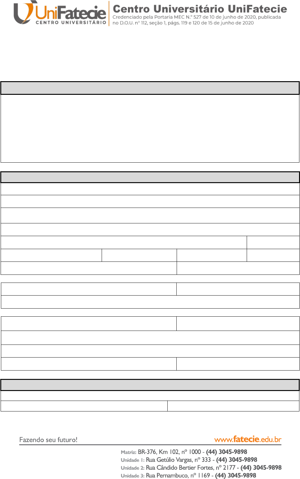 TERMO DE COMPROMISSO DE ESTÁGIO OBRIGATÓRIO DO CURSO DE EDUCAÇÃO FÍSICA – BACHARELADO PARA LICENCIADOS QUE ENTRE SI CELEBRAM, CENTRO UNIVERSITÁRIO UNIFATECIE – INTERVENIENTE, UNIDADE CONCEDENTE (EMPRESA) E ESTAGIÁRIO(A). INSTITUIÇÃO DE ENSINO – INTERVENIENTE CENTRO UNIVERSITÁRIO UNIFATECIE, pessoa jurídica de direito privado, Instituição de Ensino Superior, com sede na cidade de PARANAVAÍ-PR, inscrita no CNPJ sob o número 07.724.708/0001-34, com sede à BR 376, nº1000, Km 102, Distrito Industrial, CEP 87.720-140, na cidade de Paranavaí-PR, neste ato representado pelo Prof. Me. Gilmar de Oliveira, portador do RG nº 17.773.010-9, inscrito no CPF sob nº.067.346.438-59, residente e domiciliado na cidade de PARANAVAÍ-PR, doravante denominado UNIFATECIE. UNIDADE CONCEDENTE (Empresa/Local do estágio) Razão Social: CNPJ: Alvará de Funcionamento/Sanitário: *Preencher apenas na falta de CNPJ Área de atuação: Endereço: Nº: Bairro: CEP: Cidade: Estado: Complemento: Fone: Representante do local: Cargo: E-mail (para assinatura digital): Supervisor(a) do estágio: Cargo: E-mail (para assinatura digital): Formação do Supervisor do Estágio: Órgão de Classe do Supervisor do Estágio: Registro Profissional: *Obrigatório órgão de classe e registro profissional do supervisor de estágio. ESTAGIÁRIO(A) Nome: Curso: Código matrícula (RA): Período(Semestre): Horário de aulas e atividades acadêmicas: (X) EAD RG: CPF: Data Nascimento: Endereço: Nº: Bairro: CEP: Cidade: Estado: Complemento: Fone: E-mail (para assinatura digital): CLÁUSULA 1ª – DAS DEFINIÇÕES DO ESTÁGIO 1.1 - O Estágio Supervisionado Obrigatório, são horas práticas, as quais os alunos deverão cumprir dentro de uma organização, desenvolvendo atividades correlacionadas ao Curso de EDUCAÇÃO FÍSICA – BACHARELADO PARA LICENCIADOS, acordadas e consolidadas em um contrato de estágio realizado entre a empresa concedente, a instituição de ensino e o aluno, para posterior aprovação da coordenação do curso. 1.2 - O Curso de EDUCAÇÃO FÍSICA – BACHARELADO PARA LICENCIADOS da UNIFATECIE solicita um número específico de 25 horas a serem cumpridas em prática na disciplina de Estágio Supervisionado Específico. 1.3 - Os estágios podem ser realizados dentro de uma mesma instituição concedente ou com a somatória de horas trabalhadas em diversas concedentes, desde que respeite as especificidades de cada disciplina de estágio. Todas as atividades somadas devem estar dentro do campo de atuação que o curso capacita. 1.4 - Para a disciplina de Estágio Supervisionado Específico, do Curso de EDUCAÇÃO FÍSICA – BACHARELADO PARA LICENCIADOS da UNIFATECIE, o estágio deve ser realizado na área: ( ) GESTÃO ( ) LAZER ( ) SAÚDE ( ) ESPORTE 1.5 - É de responsabilidade do (a) aluno (a) a obtenção do estágio e este será válido a partir da comprovação sob forma de contrato de estágio, regulamentado dentro dos padrões da legislação brasileira. 1.6 - Caso o aluno não tenha realizado o estágio dentro do prazo estipulado ou mesmo dentro do campo de atuação permitido, o estudante ficará impossibilitado de concluir o Curso de EDUCAÇÃO FÍSICA – BACHARELADO PARA LICENCIADOS e receber o diploma por enquadrar-se como dependente da disciplina de Estágio Supervisionado. 1.7 - O Estágio só poderá ser realizado em instituições e empresas conveniados a Instituição de Ensino Superior, sendo o Termo de Convênio o documento no qual é acordado as condições de realização do estágio em conformidade com o que determina a Lei do Estágio. CLÁUSULA 2ª – DA DURAÇÃO DO ESTÁGIO 2.1 - A jornada de carga horária de Estágio não deve ultrapassar 6 (SEIS) HORAS DIÁRIAS E 30 (TRINTA) HORAS SEMANAIS, de maneira a não interferir nas demais atividades acadêmicas do estagiário, de acordo com o disposto na Lei Federal nº 11.788 de 25 de Setembro de 2008. VIGÊNCIA DO ESTÁGIO: Data Inicial: Data Final: HORÁRIO DO ESTÁGIO: ( ) FIXO, segunda á sexta das ( ) ás ( ) e das ( ) ás ( ). ( ) OUTROS, conforme os dias da semana e os horários discriminados e especificados abaixo: (decrever aqui, caso tenha horários especificos) Caso tenha Intervalo ou Refeição o Horário: das ( ): ( ) às ( ):( ) horas. 2.2 - O período de estágio poderá ser prorrogado, perante justificativa plausível, através da emissão de TERMO ADITIVO, desde que não exceda a data estipulada para finalização do módulo correspondente. 2.3 - O estágio poderá ser rescindido por qualquer uma das partes e a qualquer momento, mediante comunicação prévia às demais partes envolvidas nesse acordo, por escrito, feita com 5 (cinco) dias de antecedência, sendo assim emitido o TERMO DE RESCISÃO, sem ônus, multa ou sanções. 2.4 - Constituem motivos para a interrupção automática da vigência do presente TERMO DE COMPROMISSO, abandono do curso, trancamento de matrícula, o não cumprimento do estipulado neste TERMO DE COMPROMISSO e o não comparecimento do Estagiário aos locais de estágio por um período superior a 15 dias, sem comunicação devidamente justificada à Unidade Concedente e à UNIFATECIE. CLÁUSULA 3ª – DO VÍNCULO DE ESTÁGIO 3.1 - As atividades do ESTAGIÁRIO na UNIDADE CONCEDENTE não configurarão a existência de vínculo empregatício ou trabalhista conforme previsto na Lei Federal n.º 11.788 de 25 de setembro de 2008. 3.2 - A manutenção de estagiários em desconformidade com a Lei e com este Termo de Compromisso de Estágio implicará configuração de vínculo empregatício do educando com a parte CONCEDENTE, tanto para fins de legislação trabalhista e como previdenciária. CLÁUSULA 4ª – DO SEGURO CONTRA ACIDENTES 4.1 - O ESTAGIÁRIO, no local, período e horário de atividades, estará segurado contra acidentes pessoais, pela INTERVENIENTE através da Apólice de Nº 098201001562 da seguradora CENTAURO VIDA E PREVIDENCIA S/A. CLÁUSULA 5ª – DAS OBRIGAÇÕE