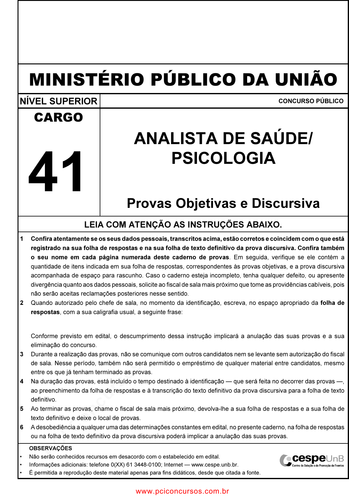 pcimarkpci MDAwMDowMDAwOjAwMDA6MDAwMDowMDAwOmZmZmY6YmU1OTo0YjJk:U2F0LCAzMCBNYXIgMjAyNCAxOTozMTo1NSAtMDMwMA== www.pciconcursos.com.br MINISTÉRIO PÚBLICO DA UNIÃO NÍVEL SUPERIOR CONCURSO PÚBLICO CARGO 41 ANALISTA DE SAÚDE/ PSICOLOGIA Provas Objetivas e Discursiva LEIA COM ATENÇÃO AS INSTRUÇÕES ABAIXO. 1 Confira atentamente se os seus dados pessoais, transcritos acima, estão corretos e coincidem com o que está registrado na sua folha de respostas e na sua folha de texto definitivo da prova discursiva. Confira também o seu nome em cada página numerada deste caderno de provas. Em seguida, verifique se ele contém a quantidade de itens indicada em sua folha de respostas, correspondentes às provas objetivas, e a prova discursiva acompanhada de espaço para rascunho. Caso o caderno esteja incompleto, tenha qualquer defeito, ou apresente divergência quanto aos dados pessoais, solicite ao fiscal de sala mais próximo que tome as providências cabíveis, pois não serão aceitas reclamações posteriores nesse sentido. 2 Quando autorizado pelo chefe de sala, no momento da identificação, escreva, no espaço apropriado da folha de respostas, com a sua caligrafia usual, a seguinte frase: Conforme previsto em edital, o descumprimento dessa instrução implicará a anulação das suas provas e a sua eliminação do concurso. 3 Durante a realização das provas, não se comunique com outros candidatos nem se levante sem autorização do fiscal de sala. Nesse período, também não será permitido o empréstimo de qualquer material entre candidatos, mesmo entre os que já tenham terminado as provas. 4 Na duração das provas, está incluído o tempo destinado à identificação — que será feita no decorrer das provas —, ao preenchimento da folha de respostas e à transcrição do texto definitivo da prova discursiva para a folha de texto definitivo. 5 Ao terminar as provas, chame o fiscal de sala mais próximo, devolva-lhe a sua folha de respostas e a sua folha de texto definitivo e deixe o local de provas. 6 A desobediência a qualquer uma das determinações constantes em edital, no presente caderno, na folha de respostas ou na folha de texto definitivo da prova discursiva poderá implicar a anulação das suas provas. OBSERVAÇÕES • Não serão conhecidos recursos em desacordo com o estabelecido em edital. • Informações adicionais: telefone 0(XX) 61 3448-0100; Internet — www.cespe.unb.br. • É permitida a reprodução deste material apenas para fins didáticos, desde que citada a fonte. www.pciconcursos.com.br pcimarkpci MDAwMDowMDAwOjAwMDA6MDAwMDowMDAwOmZmZmY6YmU1OTo0YjJk:U2F0LCAzMCBNYXIgMjAyNCAxOTozMTo1NSAtMDMwMA== www.pciconcursos.com.br UnB/CESPE – MPU Cargo 41: Analista de Saúde/Psicologia – 1 – • De acordo com o comando a que cada um dos itens a seguir se refira, marque, na folha de respostas, para cada item: o campo designado com o código C, caso julgue o item CERTO; ou o campo designado com o código E, caso julgue o item ERRADO. A ausência de marcação ou a marcação de ambos os campos não serão apenadas, ou seja, não receberão pontuação negativa. Para as devidas marcações, use a folha de respostas, único documento válido para a correção das suas provas objetivas. • Nos itens que avaliam conhecimentos de informática, a menos que seja explicitamente informado o contrário, considere que todos os programas mencionados estão em configuração-padrão, em português; e que não há restrições de proteção, de funcionamento e de uso em relação aos programas, arquivos, diretórios, recursos e equipamentos mencionados. CONHECIMENTOS BÁSICOS Inovar é recriar de modo a agregar valor e incrementar1 a eficiência, a produtividade e a competitividade nos processos gerenciais e nos produtos e serviços das organizações. Ou seja, é o fermento do crescimento econômico e social de um país.4 Para isso, é preciso criatividade, capacidade de inventar e coragem para sair dos esquemas tradicionais. Inovador é o indivíduo que procura respostas originais e pertinentes em7 situações com as quais ele se defronta. É preciso uma atitude de abertura para as coisas novas, pois a novidade é catastrófica para os mais céticos. Pode-se dizer que o caminho da inovação10 é um percurso de difícil travessia para a maioria das instituições. Inovar significa transformar os pontos frágeis de um empreendimento em uma realidade duradoura e lucrativa.13 A inovação estimula a comercialização de produtos ou serviços e também permite avanços importantes para toda a sociedade. Porém, a inovação é verdadeira somente quando está16 fundamentada no conhecimento. A capacidade de inovação depende da pesquisa, da geração de conhecimento. É necessário investir em pesquisa para devolver resultados19 satisfatórios à sociedade. No entanto, os resultados desse tipo de investimento não são necessariamente recursos financeiros ou valores econômicos, podem ser também a qualidade de vida22 com justiça social. Luís Afonso Bermúdez. O fermento tecnológico. In: Darcy. Revista de jornalismo científico e cultural da Universidade de Brasília, novembro e dezembro de 2009, p. 37 (com adaptações). Considerando a organização das ideias e estruturas linguísticas do texto, julgue os seguintes itens. 1 Subentende-se da argumentação do texto que o pronome demonstrativo, no trecho “desse tipo de investimento” (R.20-21), refere-se à ideia de “fermento do crescimento econômico e social de um país” (R.4). 2 A forma verbal “é” (R.4) está flexionada no singular porque, na oração em que ocorre, subentende-se “Inovar” (R.1) como sujeito. 3 Na linha 8, o segmento “as quais” remete a “situações” e, por isso, admite a substituição pelo pronome que; no entanto, nesse contexto, tal substituição provocaria ambiguidade. 4 O período sintático iniciado por “Inovar significa” (R.12) estabelece, com o período anterior,