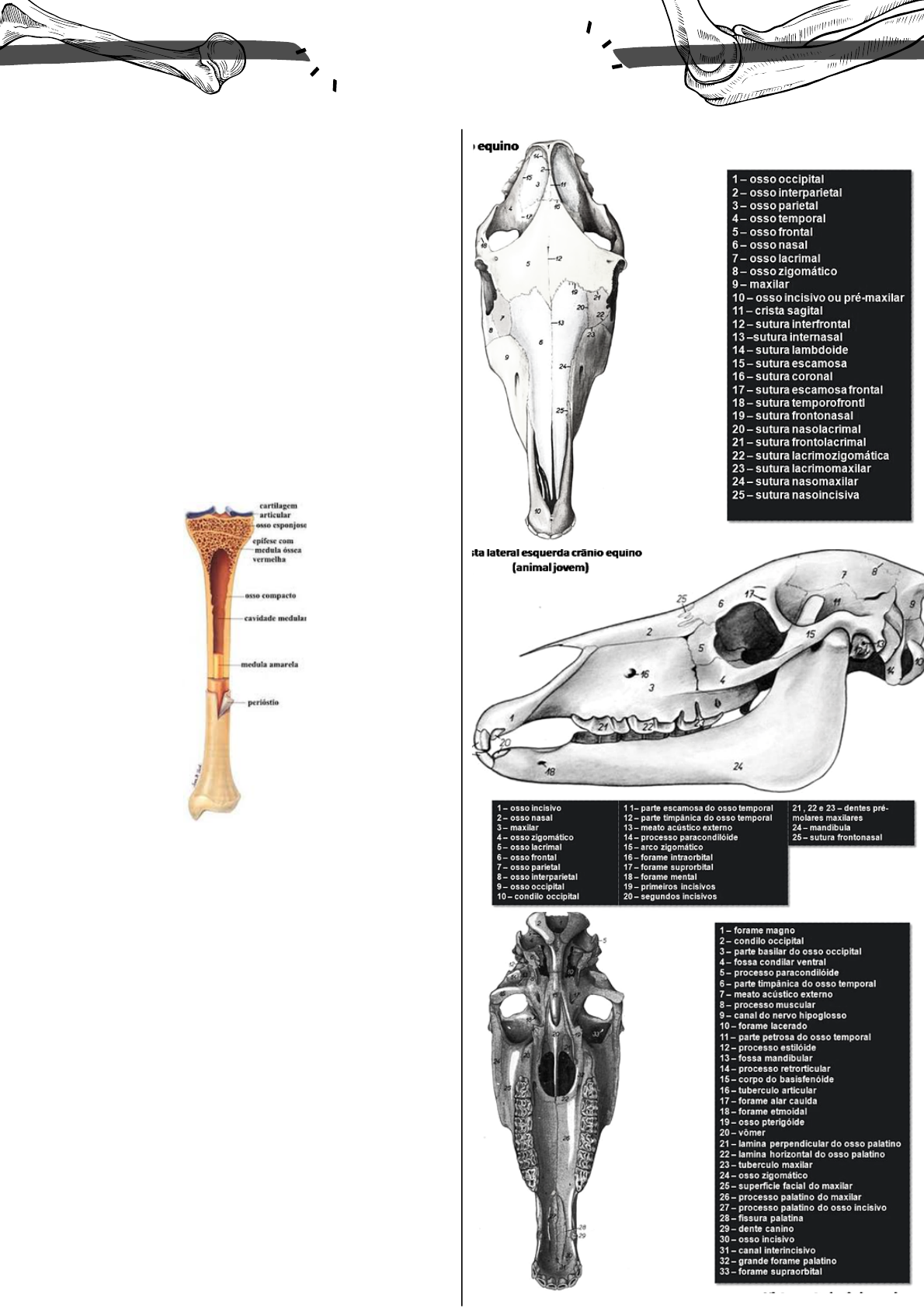 Osteologia Teoria A osteologia é o estudo dos ossos. Logo será abordado sobre a porção passiva do aparelho locomotor, sendo os músculos a porção ativa. Tipos de ossos: Ossos longos: São aqueles que predominem em comprimento, tendo as suas epífises compostas de osso esponjoso e a diáfise de osso compacto, apresentando a metáfase, ou cartilagem epifisária, unindo essas duas porções, sendo ela responsável pelo crescimento em comprimento dos ossos Exemplo: fêmur, rádio, úmero Ossos planos: São ossos que predominam na região de cabeça e apresentam a principal função de proteção, apresentando duas lâminas de osso compacto e uma de osso esponjoso. Exemplo: ossos do crânio, esterno Ossos pneumáticos: São ossos planos, mas com cavidades preenchidas por ar ou mucosa. Ossos irregulares: São ossos que não apresentam formatos tão definidos. Exemplo: vértebras Ossos curtos: São ossos que aguentam principalmente pressão mecânica. Exemplo: ossos do carpo e metacarpo. Osteologia da cabeça incisura nasoincisiva Ossos maxilares (2): Abrigam os dentes caninos superiores, os pré- molares e os molares. Apresentando o seio maxilar. É possível perceber a crista facial lateralmente, e em ruminantes é possível perceber a tuberosidade facial. Pelo forame infraorbital sai o par de nervos trigêmeos (5º par de nervos cranianos), sendo seu nervo maxilar chamado de nervo infraorbital após sair por esse forame. Ossos palatinos (2): Juntamente com o processo palatino do osso incisivo e o processo palatino do osso maxilar, formam o palato duro. Sendo formado pela lâmina horizontal do osso palatino e pela lâmina perpendicular do osso palatino. Ainda, é visível o forame palatino maior oral, e caudalmente a ele o forame palatino menor aboral, ,equinos não apresentam o último. Osso lacrimal (2) É um dos ossos que realizam a formação da órbita do olho, sendo visível a fossa lacrimal com o forame lacrimal, por onde a lagrima produzida é comunicada com o nariz. Tuberosidade facial Forame infraorbital Os ossos da cabeça são divididos em ossos da face e do crânio em relação às suas posições anatômicas, sendo eles unidos por suturas. Ossos da face Osso frontal(2): O osso frontal é o osso mais dorsal do animal, sendo de osso pneumático, visto que há o seio frontal, em bovinos ele é mais desenvolvido. Nele é visível o forame supre-orbital. (processo cornual se comunica com o seio frontal) Osso Parietal (2): Formam a parede dorsolateral do crânio, sendo menos desenvolvidos em humanos, entre os ossos parietais há osso interparietal. Nele é visível a crista sagital externa em equinos e carnívoros. Osso nasal (2): São os ossos que formam o teto da cavidade nasal , havendo muita diversidade em relação ás espécies e raças. Osso incisivo (2): São os ossos mais rostrais dos animais, estando em intimo contato com os ossos nasais. Nele há o canal incisivo que é responsável pela passagem de nervos e artérias. A incisura nasoincisiva é vista lateralmente, entre o osso nasal e o incisivo. Ainda, há a fissura interincisiva em bovinos e suínos, entre o osso incisivo, e em todos animais há a fissura palatina, que é a abertura para o processo palatino do osso incisivo. (Ruminantes não apresentam dentes incisivos superiores, mas o pulvino dentário no local) Crista facial Osso occipital: É o osso que se articula com a primeira vertebra cervical, sendo limite cranial da medula espinal com o forame magno e lateralmente ao forame magno temos os canais do nervo hipoglosso na fossa condilar ventral (equinos têm 1, ruminantes têm 2 de cada lado). O occipital também é dividido em porção escamosa que é a mais externa, porção lateral e a porção basilar que é interna. Externamente após o osso parietal há a crista nucal com uma porção mais escamosa ventralmente que é a protuberância occipital externa. É visível o forame mastoideo nessa porção escamosa. Na porção lateral há os côndilos que são envoltos pela fossas condilares dorsal e ventral e os processos paracondilares. Já na porção basilar, no seu final é visível os tubérculos musculares ao lado dos processos musculares do osso temporal. fossa mandibular incisura nasoincisiva Ossos zigomático (2): Também forma a orbita do olho pela presenta dos processos para a formação do arco zigomático. Observação: os processos iniciam com o osso que está se encaminhando e após o osso de origem -Processo zigomático do osso temporal -Processo temporal do osso zigomático -Processo frontal do osso zigomático (Ru) Em suínos e carnívoros o osso zigomático não encontra o osso frontal, logo a órbita não é fechada, sendo mais fácil de ocorrer Osso temporal(2): São muito importantes, formam a parede lateral da caixa craniada, contem as estruturas médias e internas da orelha e atuam na formação da ATM. O meato acústico externo, leva a orelha média para a interna O osso temporal é dividido em porção escamosa, que é a que forma a órbita, porção timpânica que forma a bulha timpânica e a porção petrosa que tá em contato com a mandíbula. Em contato com a mandíbula há a fossa mandibular juntamente com o tubérculo articular do temporal Osso esfenoide: O osso esfenoide é formado pelo basiesfenoide que é logo após a porção basilar do osso occipital e o pré-esfenoide que forma o corpo do esfenoide. Osso pterigoide(2): Eles se localizam sob a lâmina perpendicular do osso palatino, formando o hámulo do pterigoide que é a porção mais proeminente. Osso vômer: Ele é o osso que se localiza na porção final do septo nasal, tendo a asa do vômer que é o local de fixação e a asa do vômer que forma o septo. (órgão vômeronasal) Osso etmoide: Ele é o osso responsável por encubar o encéfalo, apresentando uma lâmina cribriforme que é realizada a entrada nos muitos nervos olfatórios. Uma crista Galli que é a lâmina inicial horizontal e a lâmina perpendicular. Os