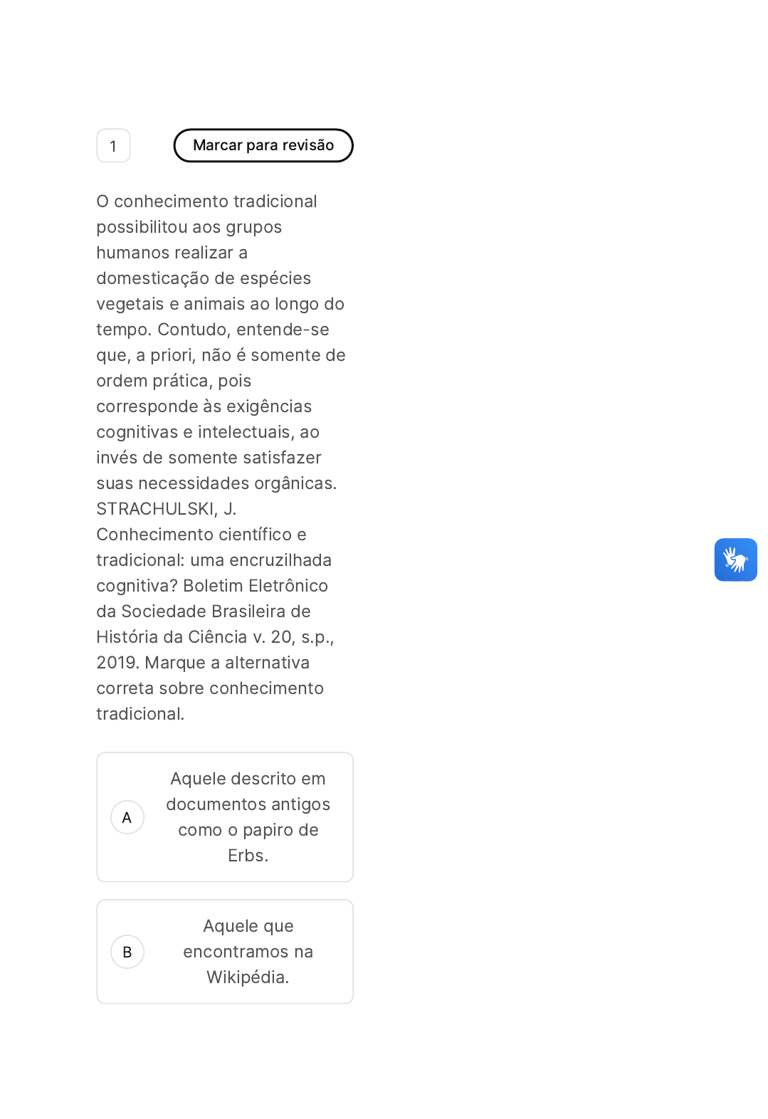 01/04/2024, 20:04 estacio.saladeavaliacoes.com.br/prova/660b39a5bcfae3e103feb5de/ https://estacio.saladeavaliacoes.com.br/prova/660b39a5bcfae3e103feb5de/ 1/12 A B 1 Marcar para revisão O conhecimento tradicional possibilitou aos grupos humanos realizar a domesticação de espécies vegetais e animais ao longo do tempo. Contudo, entende-se que, a priori, não é somente de ordem prática, pois corresponde às exigências cognitivas e intelectuais, ao invés de somente satisfazer suas necessidades orgânicas. STRACHULSKI, J. Conhecimento científico e tradicional: uma encruzilhada cognitiva? Boletim Eletrônico da Sociedade Brasileira de História da Ciência v. 20, s.p., 2019. Marque a alternativa correta sobre conhecimento tradicional. Aquele descrito em documentos antigos como o papiro de Erbs. Aquele que encontramos na Wikipédia. 01/04/2024, 20:04 estacio.saladeavaliacoes.com.br/prova/660b39a5bcfae3e103feb5de/ https://estacio.saladeavaliacoes.com.br/prova/660b39a5bcfae3e103feb5de/ 2/12 C D E Aquele resultado do conjunto de informações e saberes das práticas coletivas presentes em comunidades como indígenas e quilombolas. Aquele utilizado na clínica médica e que se aprende na universidade. Aquela encontrada no Google acadêmico. 2 Marcar para revisão Na fase II do ensaio clínico de um fitoterápico, são selecionados de 70 a 100 pessoas, que experimentarão o medicamento sem seu conhecimento prévio das mesmas. Com base na afirmativa acima, marque a alternativa que confirma se a mesma está correta ou errada e sua justificativa. 01/04/2024, 20:04 estacio.saladeavaliacoes.com.br/prova/660b39a5bcfae3e103feb5de/ https://estacio.saladeavaliacoes.com.br/prova/660b39a5bcfae3e103feb5de/ 3/12 A B C D E Certa, mas a informação está incompleta. Errada, porque não são de 70 a 100 pessoas, mas sim de 10 a 30 pessoas. Certa, porque segue os protocolos para ensaio clínico. Errada, porque é necessário que cada um dos pacientes assine o TCLE �Termo de Consentimento Livre e Esclarecido) em que todos os procedimentos serão apresentados antes do início dos ensaios, de acordo com o comitê de ética. Errada, esta informação refere-se à fase IV. 3 Marcar para revisão A extração utilizando o aparelho Soxhlet é uma técnica que tem como vantagem o fato de se atingir o esgotamento da 01/04/2024, 20:04 estacio.saladeavaliacoes.com.br/prova/660b39a5bcfae3e103feb5de/ https://estacio.saladeavaliacoes.com.br/prova/660b39a5bcfae3e103feb5de/ 4/12 A B droga com facilidade usando pequeno volume de solvente, pois o mesmo é destilado e reutilizado no sistema. Porém, como muitas outras técnicas extrativas, possui desvantagens. Assinale a alternativa que apresente as desvantagens dessa técnica. A elevada pressão necessária, a limitada polaridade dos fluidos extratores e o custo elevado dos equipamentos são aspectos considerados como desvantagens ao uso da técnica. A qualidade do extrato obtido que pode ser comprometida devido à constante ebulição do extrato durante o processo extrativo, o que pode levar ao aparecimento de artefatos oriundos da decomposição das substâncias vegetais originalmente extraídas. 01/04/2024, 20:04 estacio.saladeavaliacoes.com.br/prova/660b39a5bcfae3e103feb5de/ https://estacio.saladeavaliacoes.com.br/prova/660b39a5bcfae3e103feb5de/ 5/12 C D E A necessidade de realização de processos físicos posteriores para obtenção do produto final puro (óleo) seria a principal desvantagem. A difícil separação da solução extrativa por filtração, a geração de calor no sistema e limitação do uso da técnica para matéria- prima vegetal de elevada dureza são as principais desvantagens da técnica. A influência da permeabilidade do solvente na droga vegetal, a necessidade de solubilidade a frio dos ativos, e o gasto de grandes volumes de solvente são as desvantagens da técnica. 4 Marcar para revisão As etapas de análise para garantia da qualidade de um medicamento fitoterápico 01/04/2024, 20:04 estacio.saladeavaliacoes.com.br/prova/660b39a5bcfae3e103feb5de/ https://estacio.saladeavaliacoes.com.br/prova/660b39a5bcfae3e103feb5de/ 6/12 A B C D E devem seguir um manual sobre Boas Práticas de Fabricação de medicamentos fitoterápicos. Essas práticas são descritas na Instrução Normativa � IN nº 39, de 21 de agosto de 2019. Quanto às atribuições profissionais específicas e privativas do Farmacêutico, assinale a alternativa que envolve a produção de medicamentos fitoterápicos. Processamento de Insumos de Origem Vegetal. Controle de substâncias vegetais de abuso. Fiscalização em exportação de plantas medicinais. Educação em fitoterapia. Dispensação de fitoterápicos no SUS. 5 Marcar para revisão A Thea sinensis é uma planta muito versátil em matéria de chás. Dela são obtidos os 00 hora : 33 min : 41 seg Ocultar Questão 10 de 10 Respondidas �10� Em branco �0� Finalizar prova 1 2 3 4 5 6 7 8 9 10 SM1 Metabolismo Vegetal e Fitoterapia Sair 01/04/2024, 20:04 estacio.saladeavaliacoes.com.br/prova/660b39a5bcfae3e103feb5de/ https://estacio.saladeavaliacoes.com.br/prova/660b39a5bcfae3e103feb5de/ 7/12 A B C D E populares chá preto e chá verde, além dos chás branco e vermelho, que são mais consumidos na Ásia. No Brasil, temos o costume de consumir o chá preto como fitoterápico, especialmente em casos de diarreia, devido à presença de Cafeína Taninos Vitamina C Proteínas Polifenóis 6 Marcar para revisão Chás de Echinacea purpurea (equinácea) são comumente utilizados no tratamento de resfriados e gripes, por melhorar seus sintomas rapidamente. Das opções abaixo, qual fala sobre o efeito observado com o uso desta infusão? 01/04/2024, 20:04 estacio.saladeavaliacoes.com.br/prova/660b39a5bcfae3e103feb5de/ https://estacio.saladeavaliacoes.com.br/prova/660b39a5bcfae3e103feb5de/ 8/12 A B C D E Imunoestimulação possivelmente realizada pelos derivados do ácido cafeico. Broncodilatação mediada por flavonoides como a