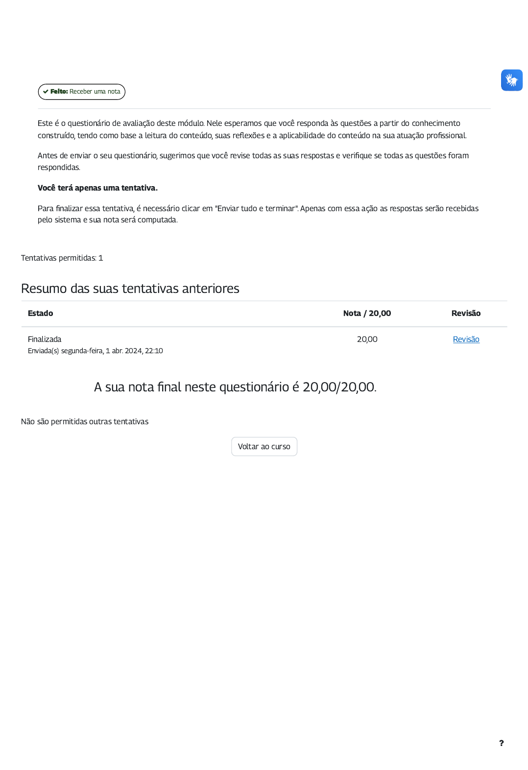 01/04/2024, 21:09 gestao_tempo_rfb | - Turma ABR/2024: Exercício Avaliativo - Módulo 4 https://mooc41.escolavirtual.gov.br/mod/quiz/view.php?id=66759 1/2 Este é o questionário de avaliação deste módulo. Nele esperamos que você responda às questões a partir do conhecimento construído, tendo como base a leitura do conteúdo, suas re�exões e a aplicabilidade do conteúdo na sua atuação pro�ssional. Antes de enviar o seu questionário, sugerimos que você revise todas as suas respostas e veri�que se todas as questões foram respondidas. Você terá apenas uma tentativa. Para �nalizar essa tentativa, é necessário clicar em "Enviar tudo e terminar". Apenas com essa ação as respostas serão recebidas pelo sistema e sua nota será computada. Tentativas permitidas: 1 Resumo das suas tentativas anteriores Estado Nota / 20,00 Revisão Finalizada Enviada(s) segunda-feira, 1 abr. 2024, 22:10 20,00 Revisão A sua nota �nal neste questionário é 20,00/20,00. Não são permitidas outras tentativas Voltar ao curso Feito: Receber uma nota https://mooc41.escolavirtual.gov.br/mod/quiz/review.php?attempt=2859287&cmid=66759 01/04/2024, 21:09 gestao_tempo_rfb | - Turma ABR/2024: Exercício Avaliativo - Módulo 4 https://mooc41.escolavirtual.gov.br/mod/quiz/view.php?id=66759 2/2