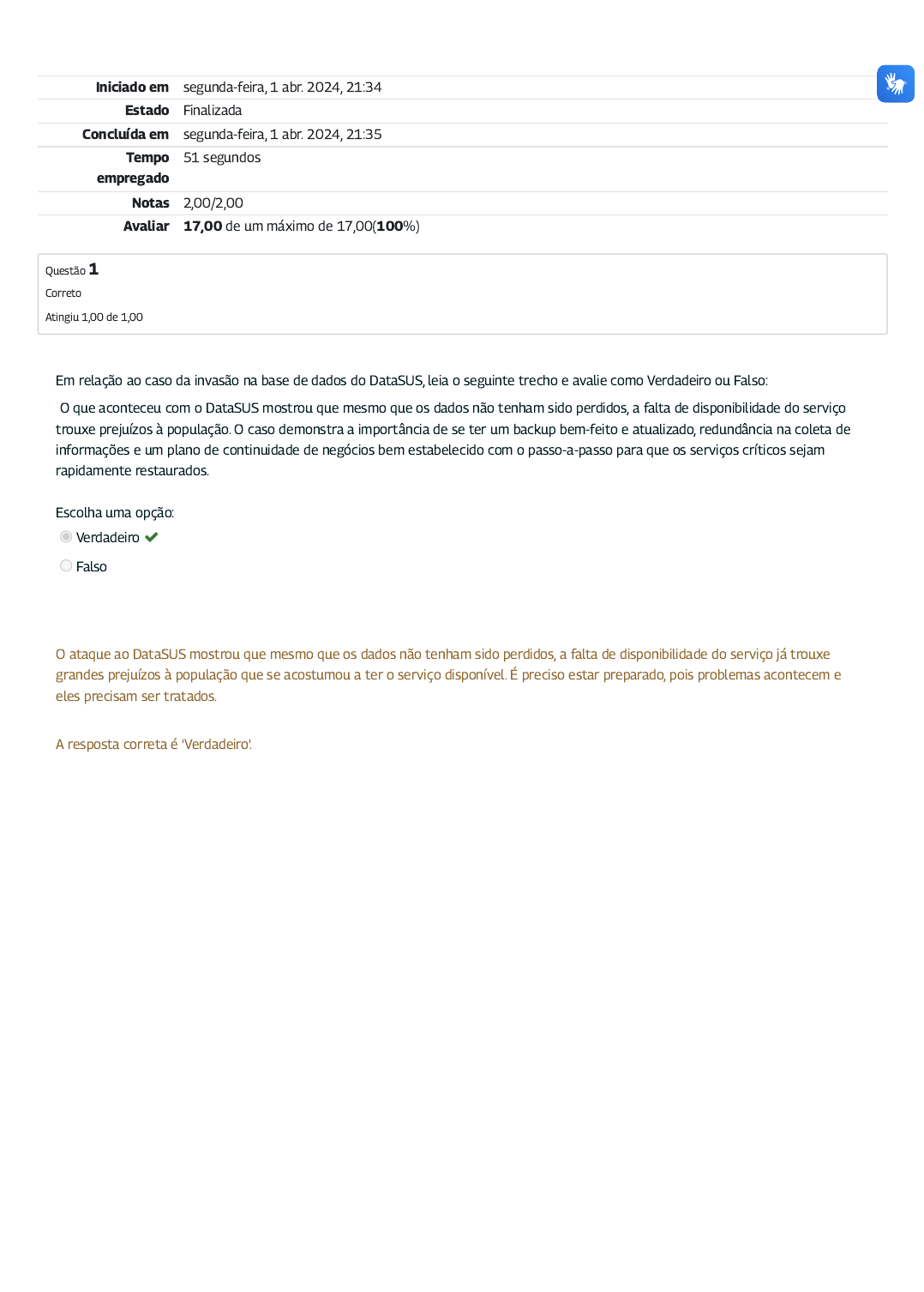 01/04/2024, 20:34 Exercício avaliativo - Módulo 6: Revisão da tentativa https://mooc41.escolavirtual.gov.br/mod/quiz/review.php?attempt=2858587&cmid=58952 1/2 Iniciado em segunda-feira, 1 abr. 2024, 21:34 Estado Finalizada Concluída em segunda-feira, 1 abr. 2024, 21:35 Tempo empregado 51 segundos Notas 2,00/2,00 Avaliar 17,00 de um máximo de 17,00(100%) Questão 1 Correto Atingiu 1,00 de 1,00 Em relação ao caso da invasão na base de dados do DataSUS, leia o seguinte trecho e avalie como Verdadeiro ou Falso: O que aconteceu com o DataSUS mostrou que mesmo que os dados não tenham sido perdidos, a falta de disponibilidade do serviço trouxe prejuízos à população. O caso demonstra a importância de se ter um backup bem-feito e atualizado, redundância na coleta de informações e um plano de continuidade de negócios bem estabelecido com o passo-a-passo para que os serviços críticos sejam rapidamente restaurados. Escolha uma opção: Verdadeiro Falso O ataque ao DataSUS mostrou que mesmo que os dados não tenham sido perdidos, a falta de disponibilidade do serviço já trouxe grandes prejuízos à população que se acostumou a ter o serviço disponível. É preciso estar preparado, pois problemas acontecem e eles precisam ser tratados. A resposta correta é 'Verdadeiro'. 01/04/2024, 20:34 Exercício avaliativo - Módulo 6: Revisão da tentativa https://mooc41.escolavirtual.gov.br/mod/quiz/review.php?attempt=2858587&cmid=58952 2/2 Questão 2 Correto Atingiu 1,00 de 1,00 No contexto da administração pública, a RNP desempenha um papel importante ao fornecer serviços de rede, computação em nuvem, segurança da informação e outras soluções de TIC para órgãos governamentais em níveis federal, estadual e municipal. Sobre o papel da RNP, avalie como Verdadeiro ou Falso as alternativas a seguir: a. A RNP é responsável por conectar institutos de ciência, tecnologia e inovação à internet de alta velocidade. b. A RNP não exerce monitoramento contínuo da internet. c. A Escola Superior de Redes oferece cursos de segurança e ajuda a diminuir a falta de mão de obra quali�cada no setor. Verdadeiro Falso Verdadeiro Sua resposta está correta. A primeira alternativa está correta, já que a RNP é responsável por conectar institutos de ciência, tecnologia e inovação, como universidades federais e outros centros de pesquisa, à internet de altas velocidades, favorecendo assim a pesquisa e a transmissão do conhecimento gerado nas universidades. A segunda alternativa está errada, pois a RNP exerce o monitoramento contínuo da internet, buscando mapear em tempo real qual é o destinatário e a origem dos ataques, contribuindo para a qualidade da internet brasileira nos centros de pesquisa. A terceira alternativa está correta, pois a Escola Superior de Redes, iniciativa da RNP, oferece cursos de segurança e tenta diminuir a falta de mão de obra quali�cada no setor. A resposta correta é: a. A RNP é responsável por conectar institutos de ciência, tecnologia e inovação à internet de alta velocidade. → Verdadeiro, b. A RNP não exerce monitoramento contínuo da internet. → Falso, c. A Escola Superior de Redes oferece cursos de segurança e ajuda a diminuir a falta de mão de obra quali�cada no setor. → Verdadeiro.